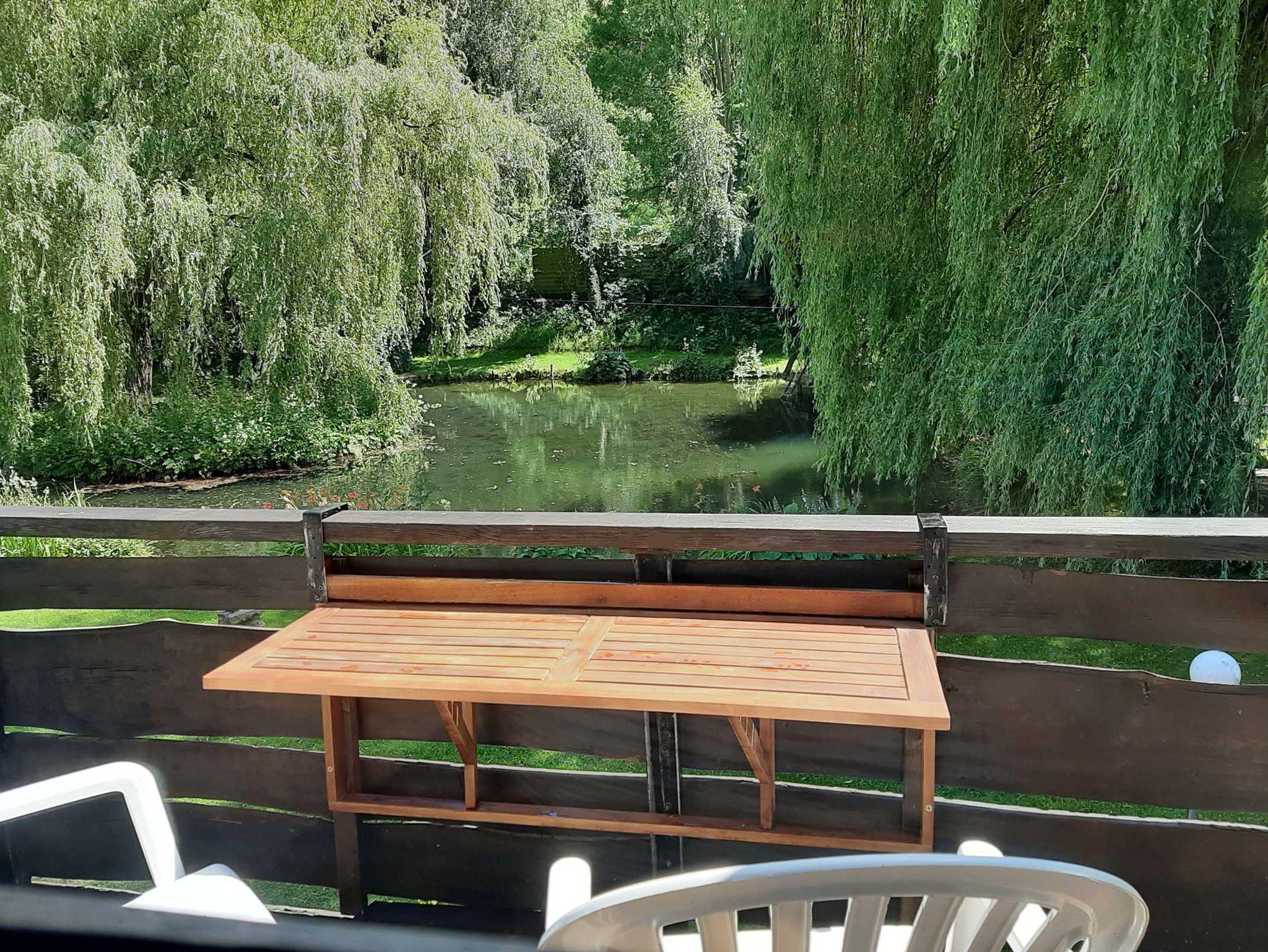 Das Studio verfügt über ein seperates Bad mit ebenerdiger Dusche. Der Wohn/- Schlafraum ist gemütlich eingerichtet und verfügt über ein Doppelbett mit Blick zum Teich, einer kleinen Sitz- und Essecke, sowie einer offenen Küche. Das Highlight ist der Balkon mit Blick in den parkähnlichen Garten. Dieser darf ebenfalls mit genutzt werden. Eine Grillmöglichkeit findet sich dort ebenfalls vor.