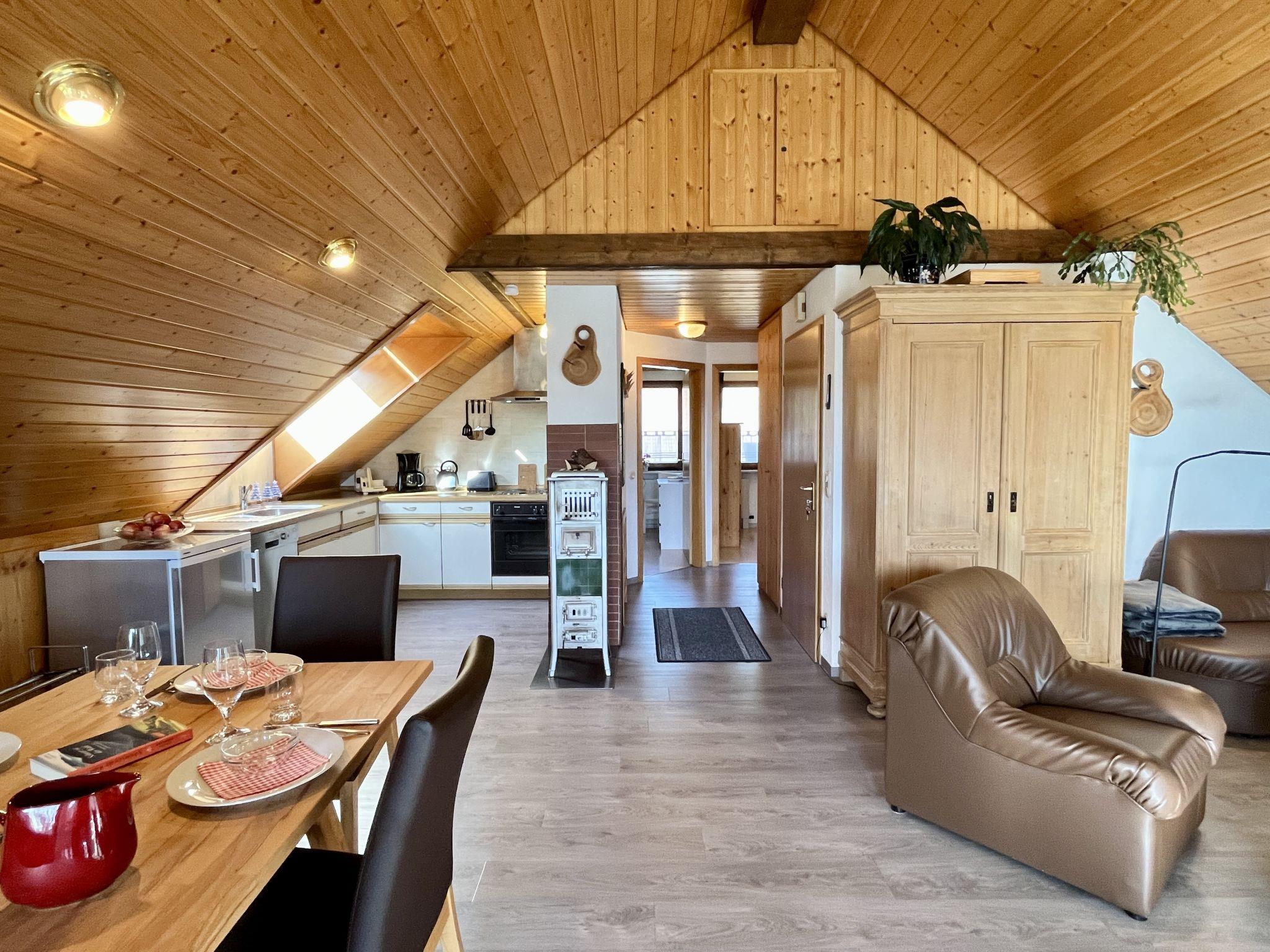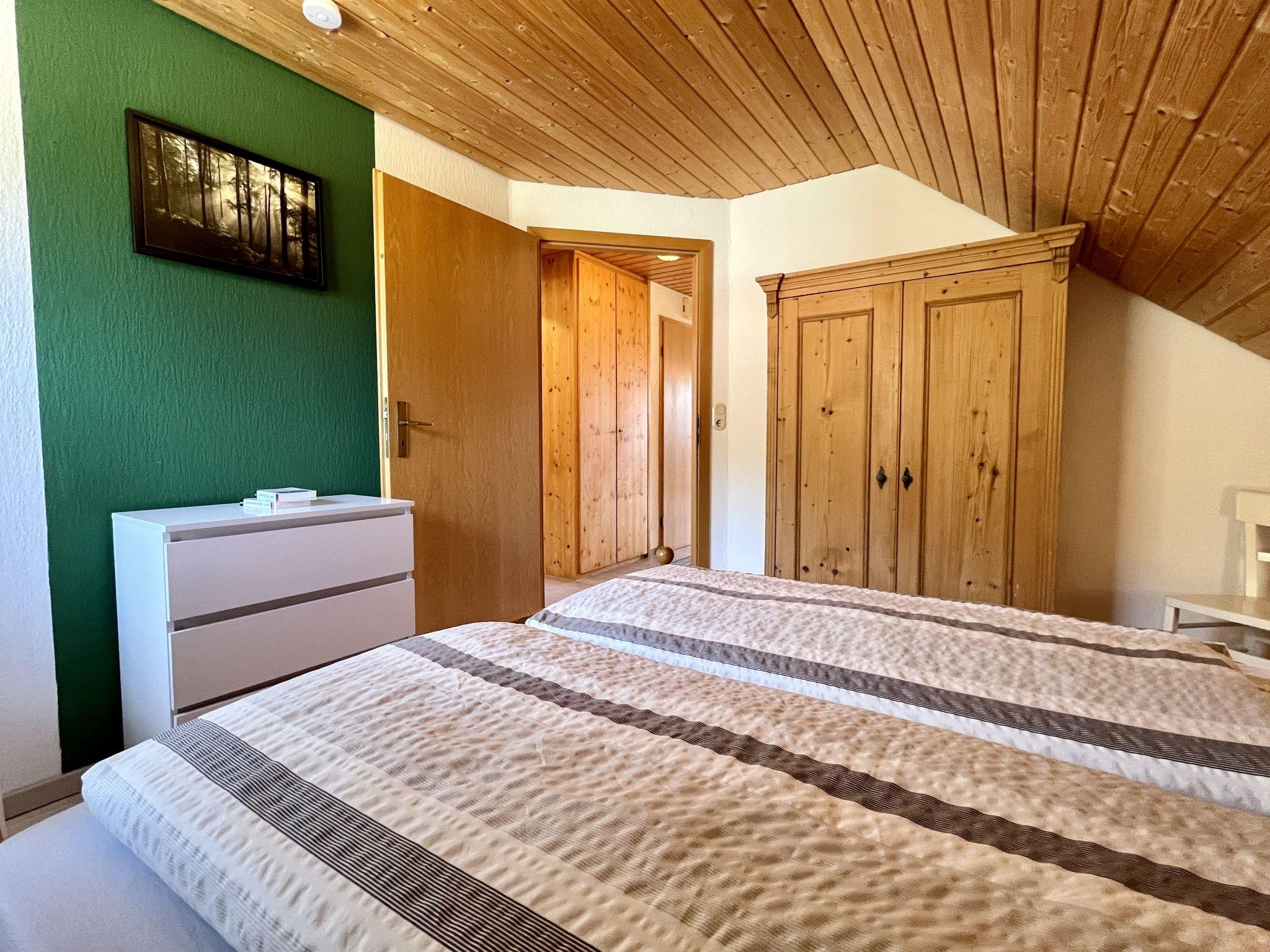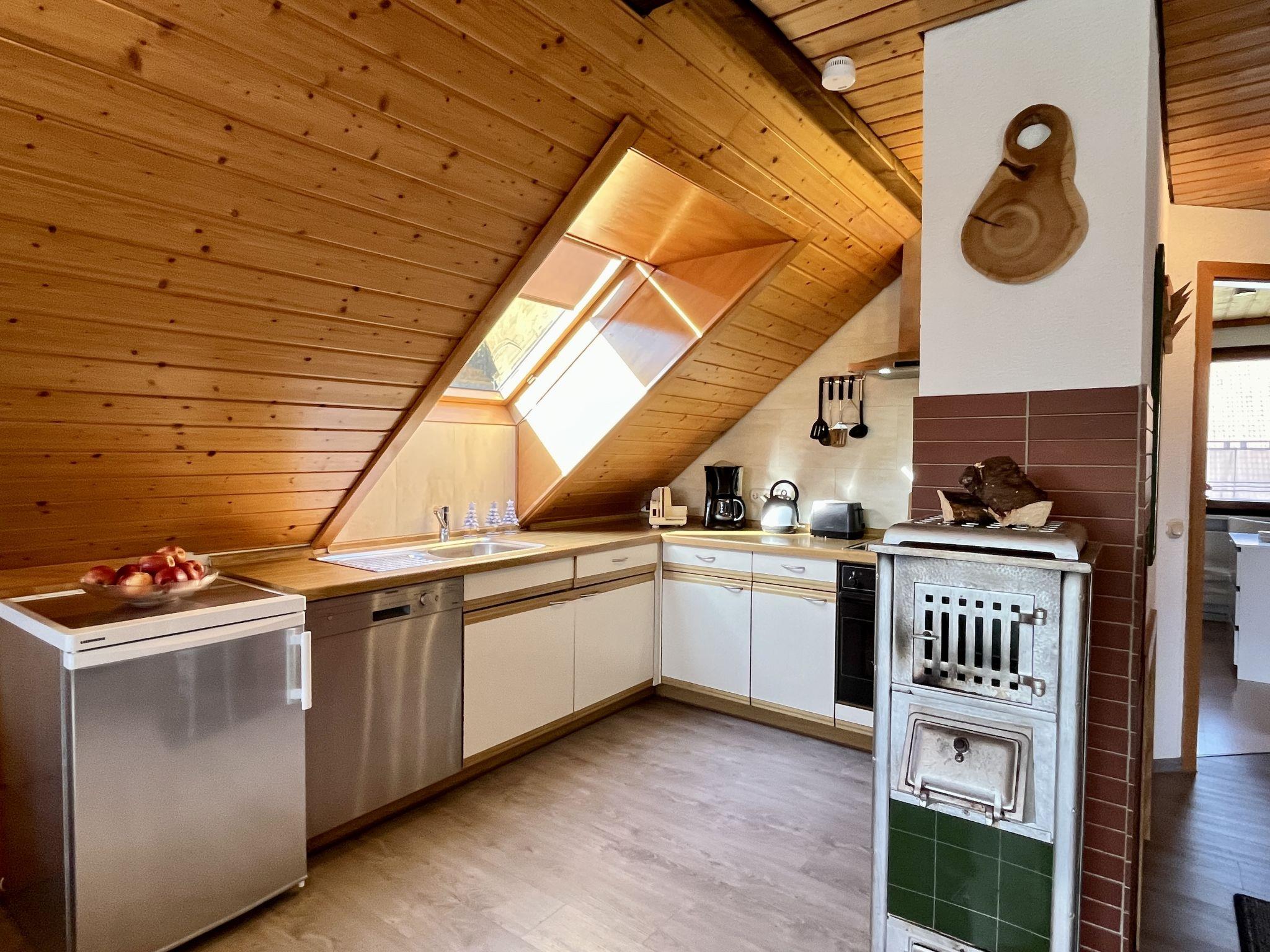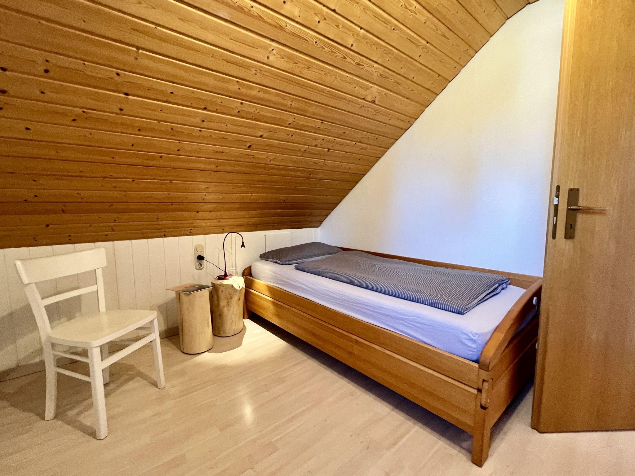 "Ferienwohnung Bienek", 3-Zimmer-Wohnung 64 m2, im Dachgeschoss. Geräumig, teilweise abgeschrägt, gemütlich eingerichtet: grosses Wohn-/Esszimmer mit Essecke und Sat-TV (Flachbildschirm), Radio, CD und Holzofen. Ausgang zum Balkon, Richtung Süden. 1 Doppelzimmer mit 1 Doppelbett (180 cm, Länge 200 cm). 1 Zimmer mit 1 Bett (90 cm, Länge 200 cm). Offene Küche (4 Kochplatten, Backofen, Geschirrspüler, Toaster, Wasserkocher, Mikrowelle, elektrische Kaffeemaschine). Dusche/WC. Grosser Balkon, Südlage. Balkonmöbel, Gartengrill. Schöne Sicht auf den Garten und die Landschaft. Zur Verfügung: Kinderhochstuhl, Babybett, Haartrockner, Holz (gratis). Internet (WLAN, gratis). Parkplatz beim Haus. Bitte beachten: Nichtraucher-Unterkunft. 1 Haustier/Hund erlaubt. Rauchmelder, Feuerlöscher.