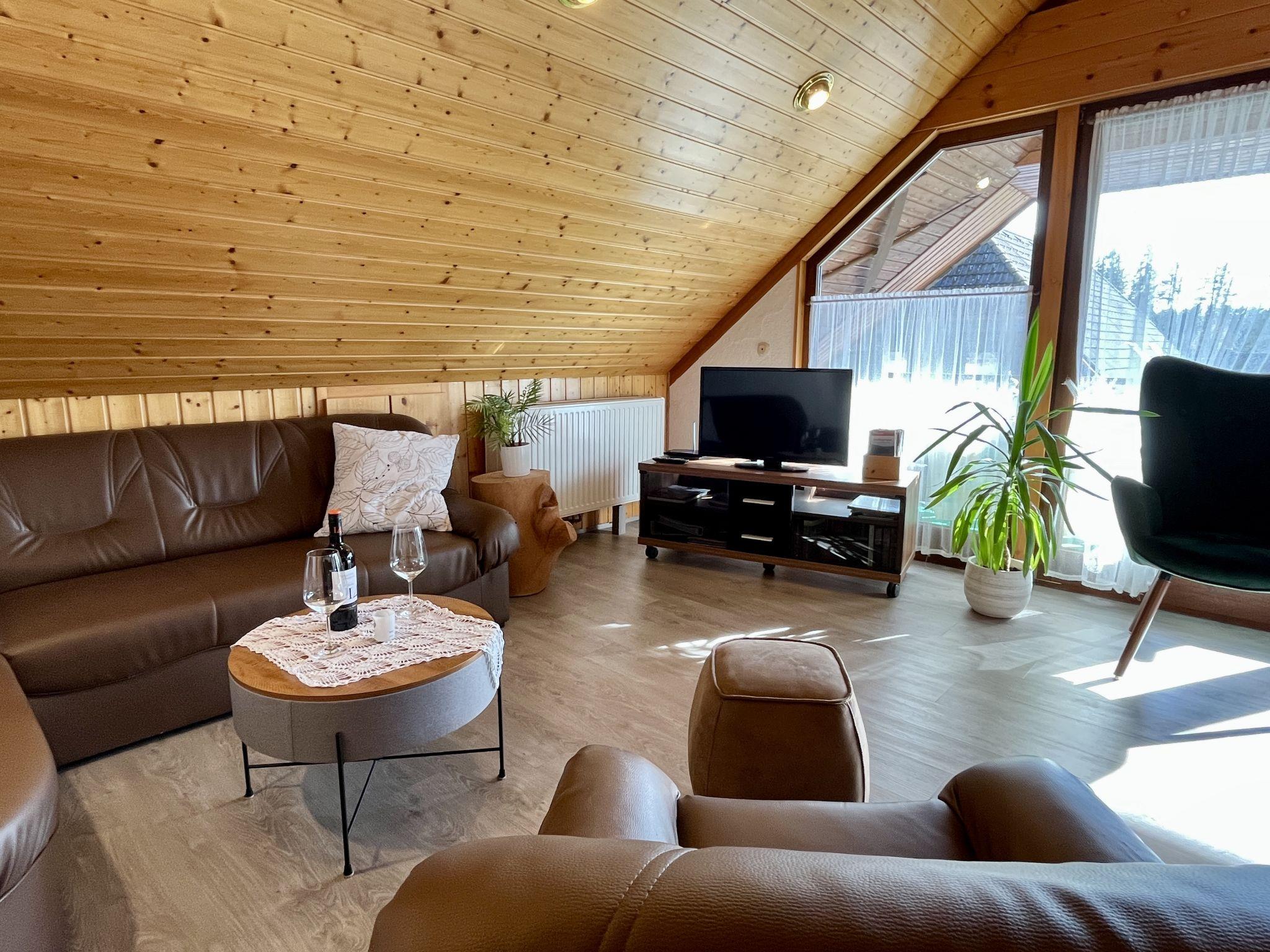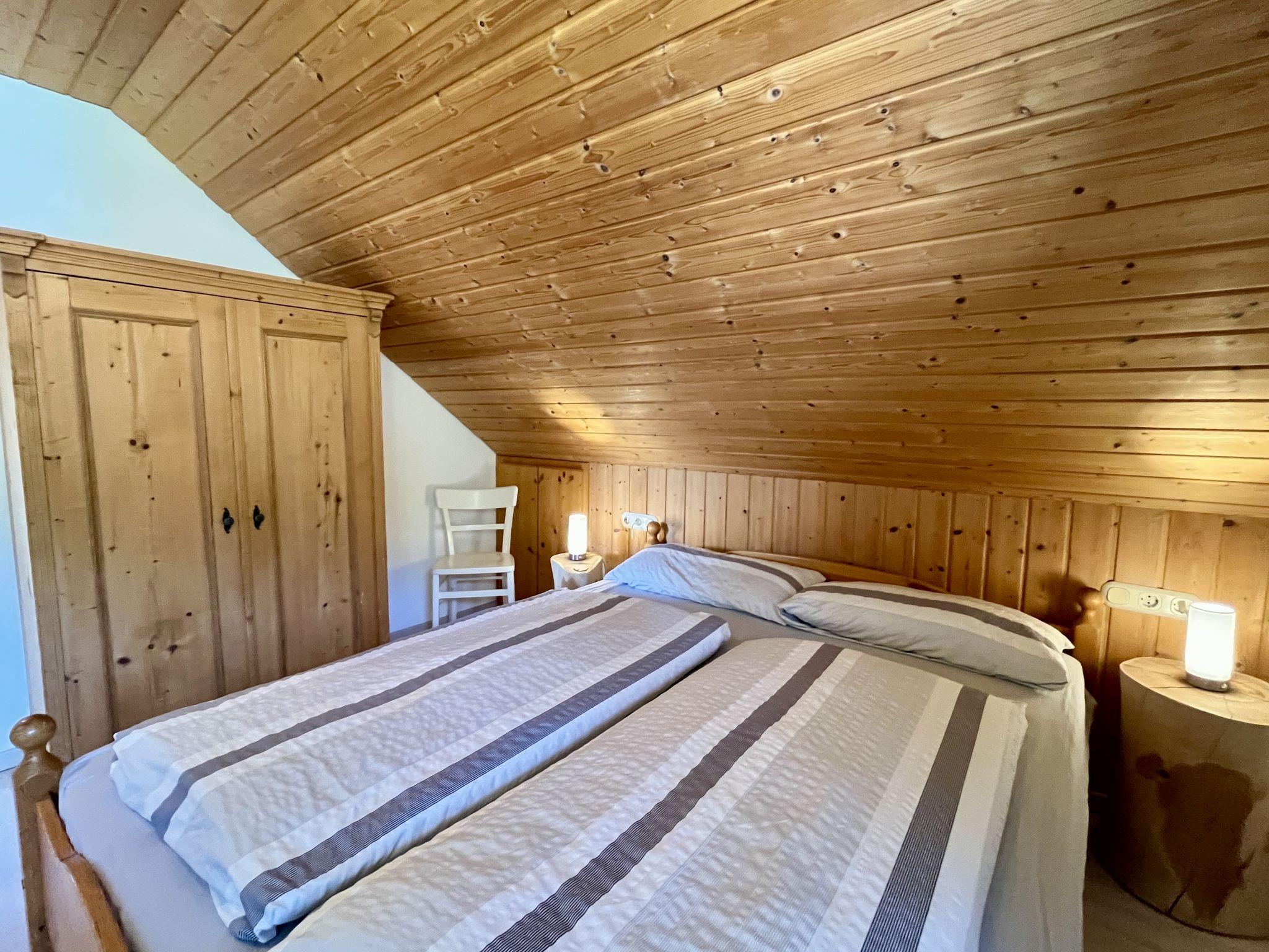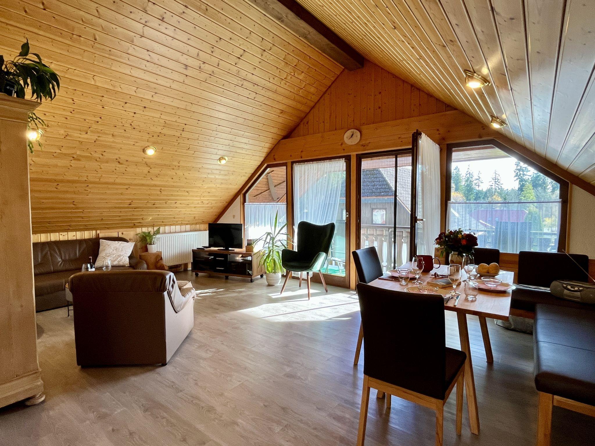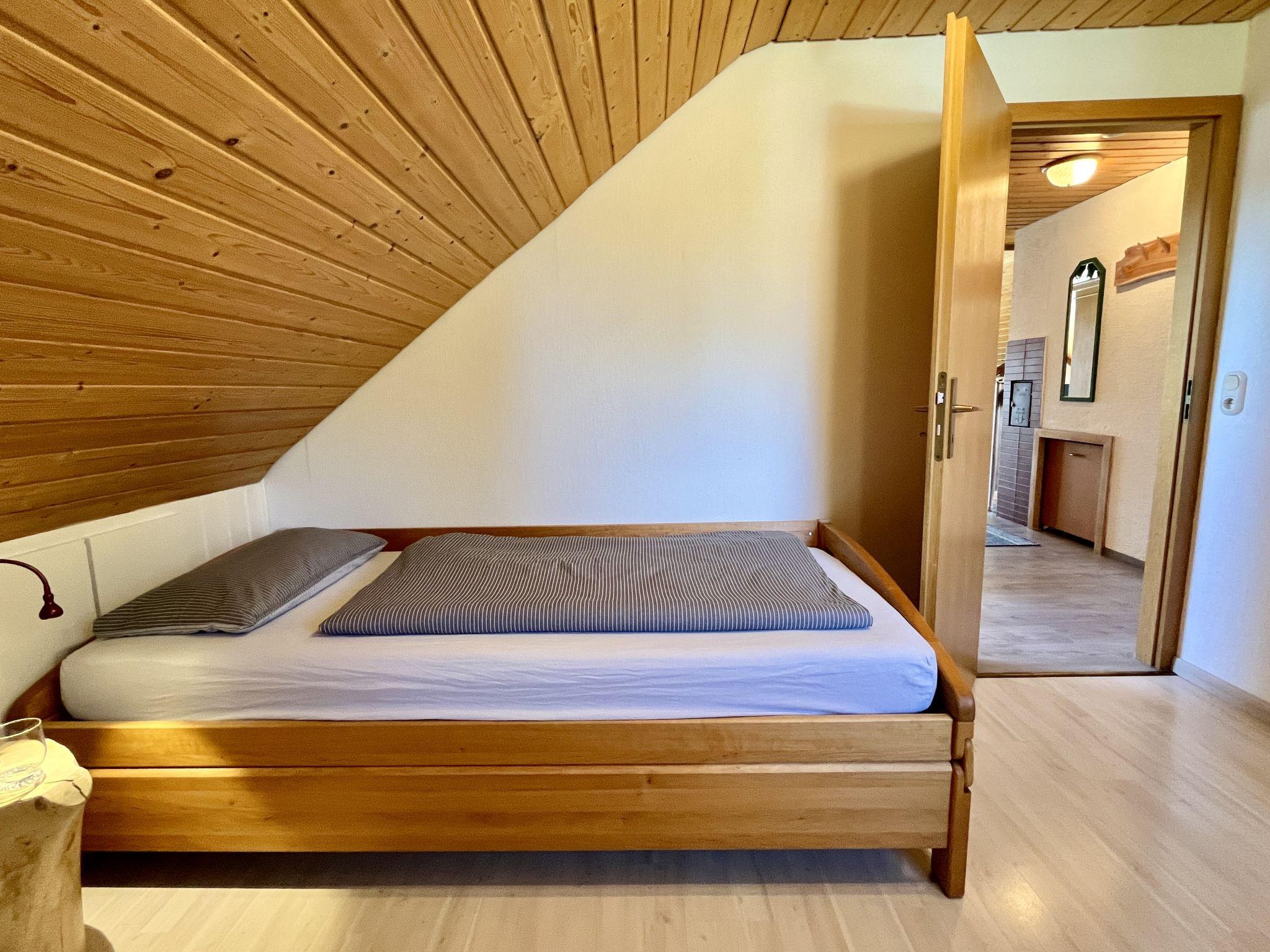 "Ferienwohnung Bienek", 3-Zimmer-Wohnung 64 m2, im Dachgeschoss. Geräumig, teilweise abgeschrägt, gemütlich eingerichtet: grosses Wohn-/Esszimmer mit Essecke und Sat-TV (Flachbildschirm), Radio, CD und Holzofen. Ausgang zum Balkon, Richtung Süden. 1 Doppelzimmer mit 1 Doppelbett (180 cm, Länge 200 cm). 1 Zimmer mit 1 Bett (90 cm, Länge 200 cm). Offene Küche (4 Kochplatten, Backofen, Geschirrspüler, Toaster, Wasserkocher, Mikrowelle, elektrische Kaffeemaschine). Dusche/WC. Grosser Balkon, Südlage. Balkonmöbel, Gartengrill. Schöne Sicht auf den Garten und die Landschaft. Zur Verfügung: Kinderhochstuhl, Babybett, Haartrockner, Holz (gratis). Internet (WLAN, gratis). Parkplatz beim Haus. Bitte beachten: Nichtraucher-Unterkunft. 1 Haustier/Hund erlaubt. Rauchmelder, Feuerlöscher.
