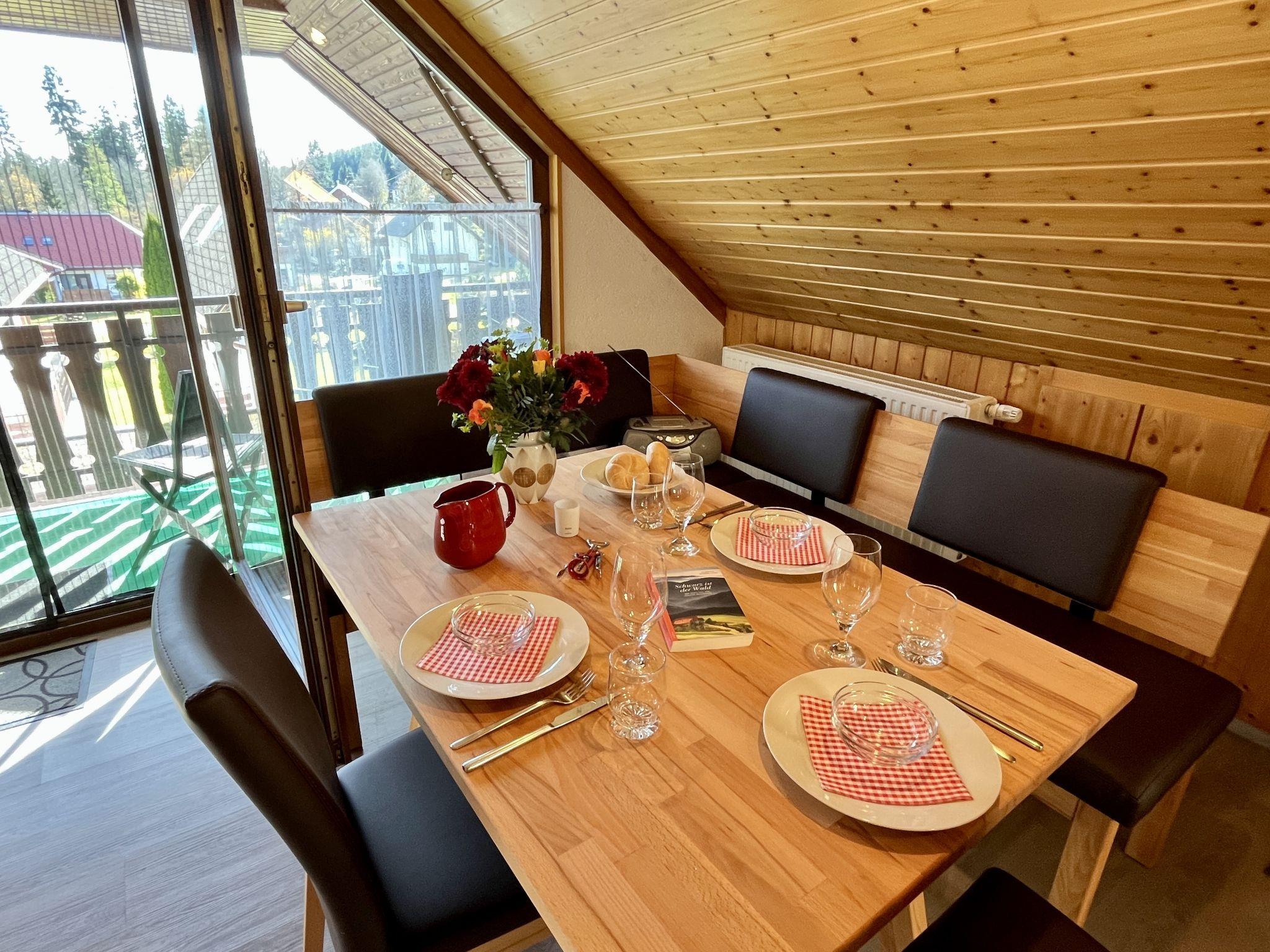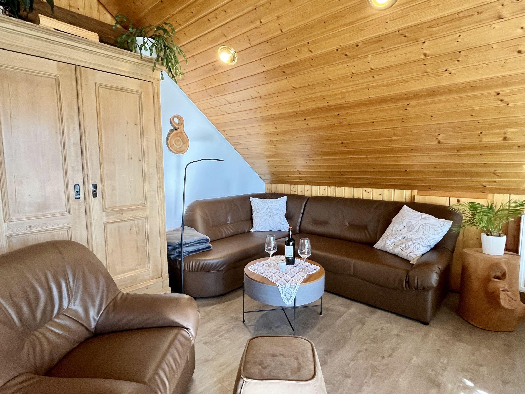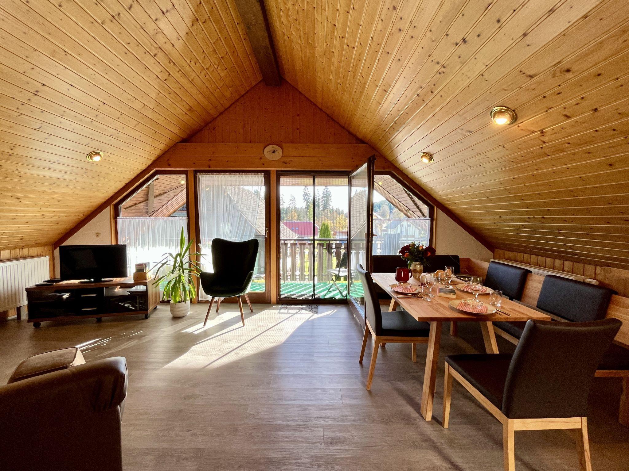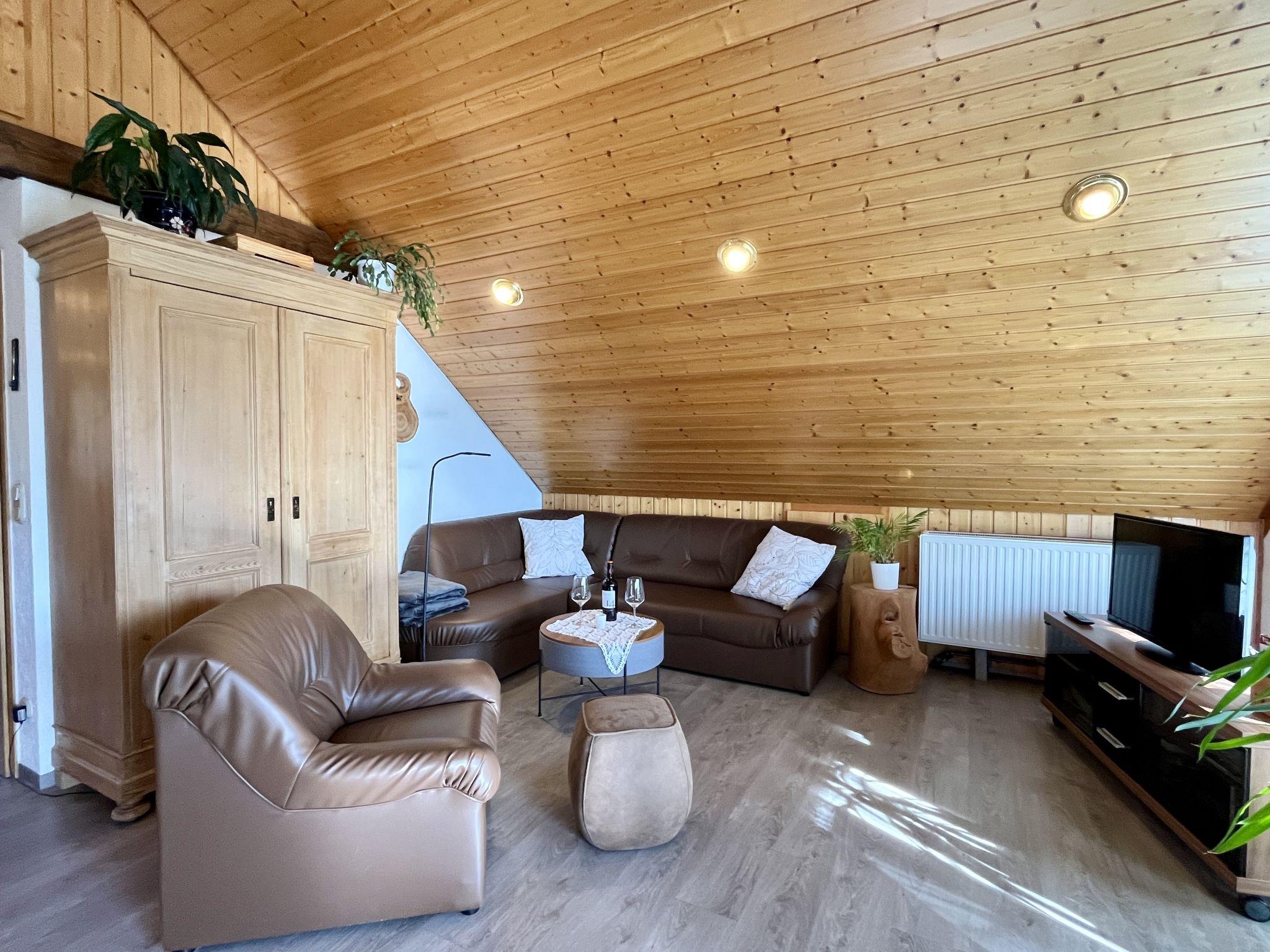 "Ferienwohnung Bienek", 3-Zimmer-Wohnung 64 m2, im Dachgeschoss. Geräumig, teilweise abgeschrägt, gemütlich eingerichtet: grosses Wohn-/Esszimmer mit Essecke und Sat-TV (Flachbildschirm), Radio, CD und Holzofen. Ausgang zum Balkon, Richtung Süden. 1 Doppelzimmer mit 1 Doppelbett (180 cm, Länge 200 cm). 1 Zimmer mit 1 Bett (90 cm, Länge 200 cm). Offene Küche (4 Kochplatten, Backofen, Geschirrspüler, Toaster, Wasserkocher, Mikrowelle, elektrische Kaffeemaschine). Dusche/WC. Grosser Balkon, Südlage. Balkonmöbel, Gartengrill. Schöne Sicht auf den Garten und die Landschaft. Zur Verfügung: Kinderhochstuhl, Babybett, Haartrockner, Holz (gratis). Internet (WLAN, gratis). Parkplatz beim Haus. Bitte beachten: Nichtraucher-Unterkunft. 1 Haustier/Hund erlaubt. Rauchmelder, Feuerlöscher.