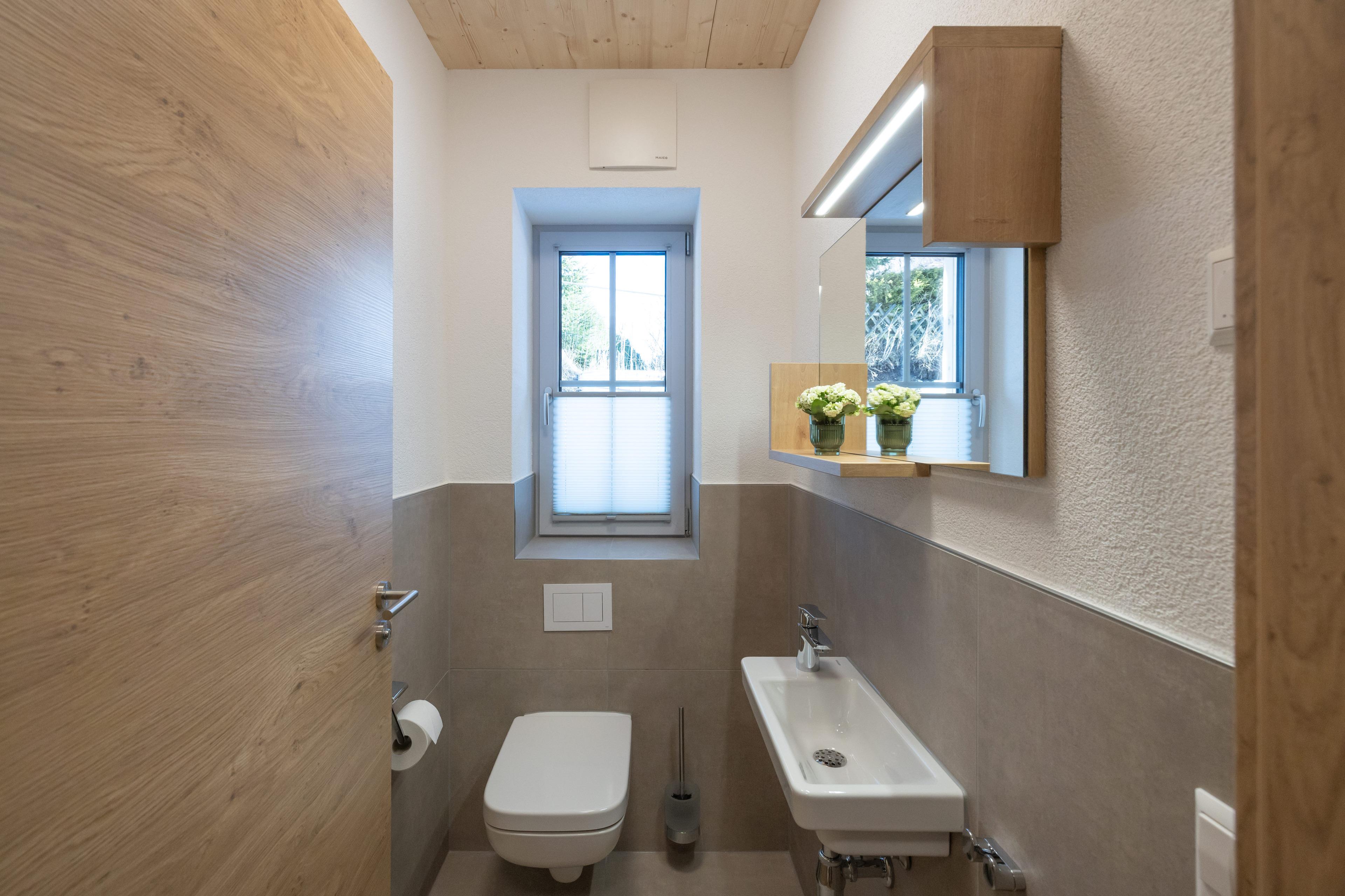 - ein Badezimmer mit WC, bodengleiche Dusche und Föhn