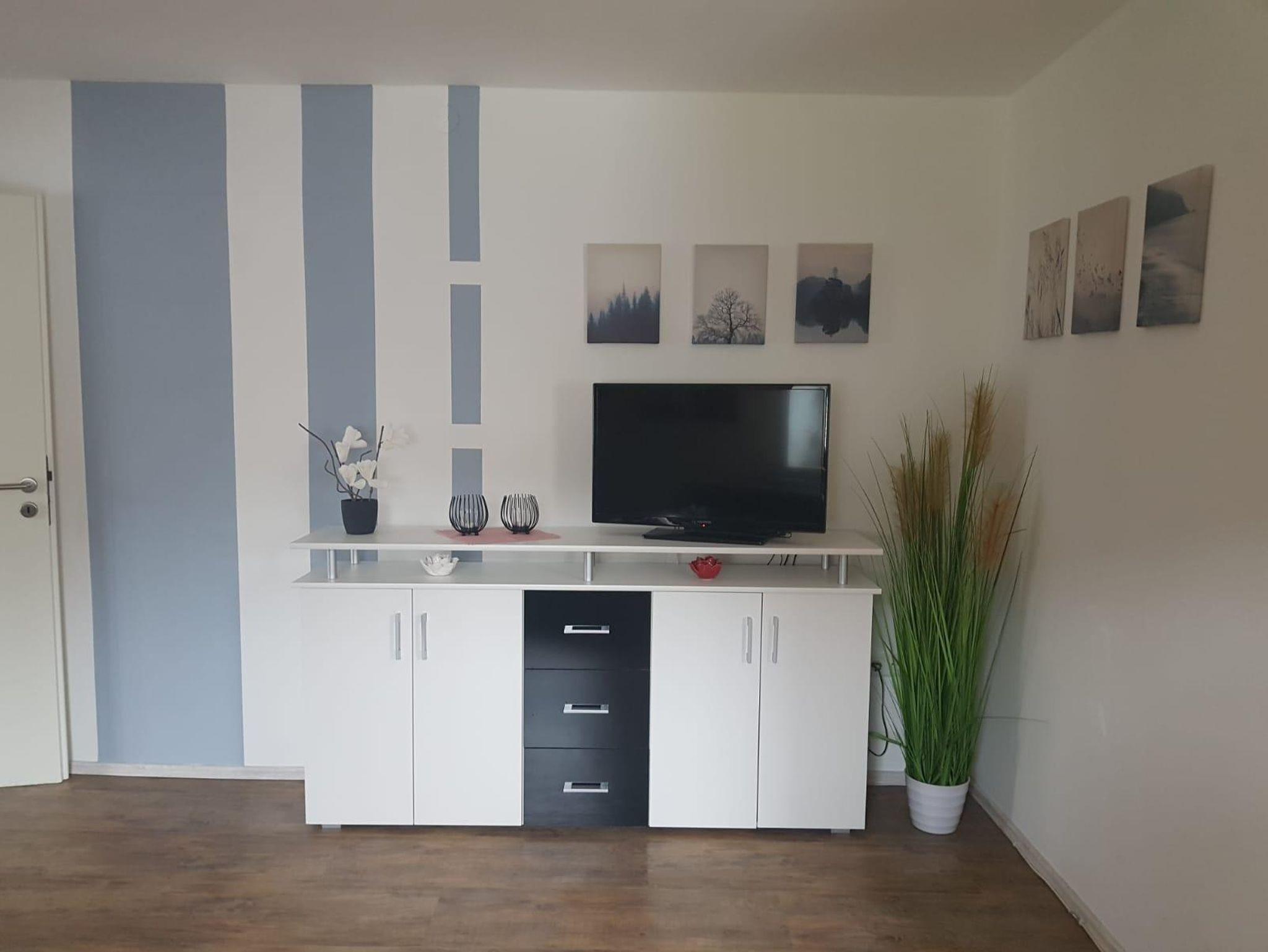 Diese Ferienwohnung verfügt über 2 Schlafzimmer, eins mit einem Doppelbett (1,60m) und eins mit 2 Einzelbetten, welches über einen außen liegenden Flur zu erreichen ist, sowie ein Kinderreisebett, eine Küche mit einem Geschirrspüler. Im Wohnbereich befindet sich ein Flachbild-TV, ein Sitzbereich und das Bad hat eine Dusche und Fussbodenheizung. Waschmachine ist auch vorhanden und kann kostenlos genutzt werden. Bei schönem Wetter kann man im Freien sitzen und grillen. WLAN ist kostenlos, jedoch in unserer ländlichen Region noch nicht wünschenswert ausgebaut. Maximal 2 Hunde sind erlaubt.
