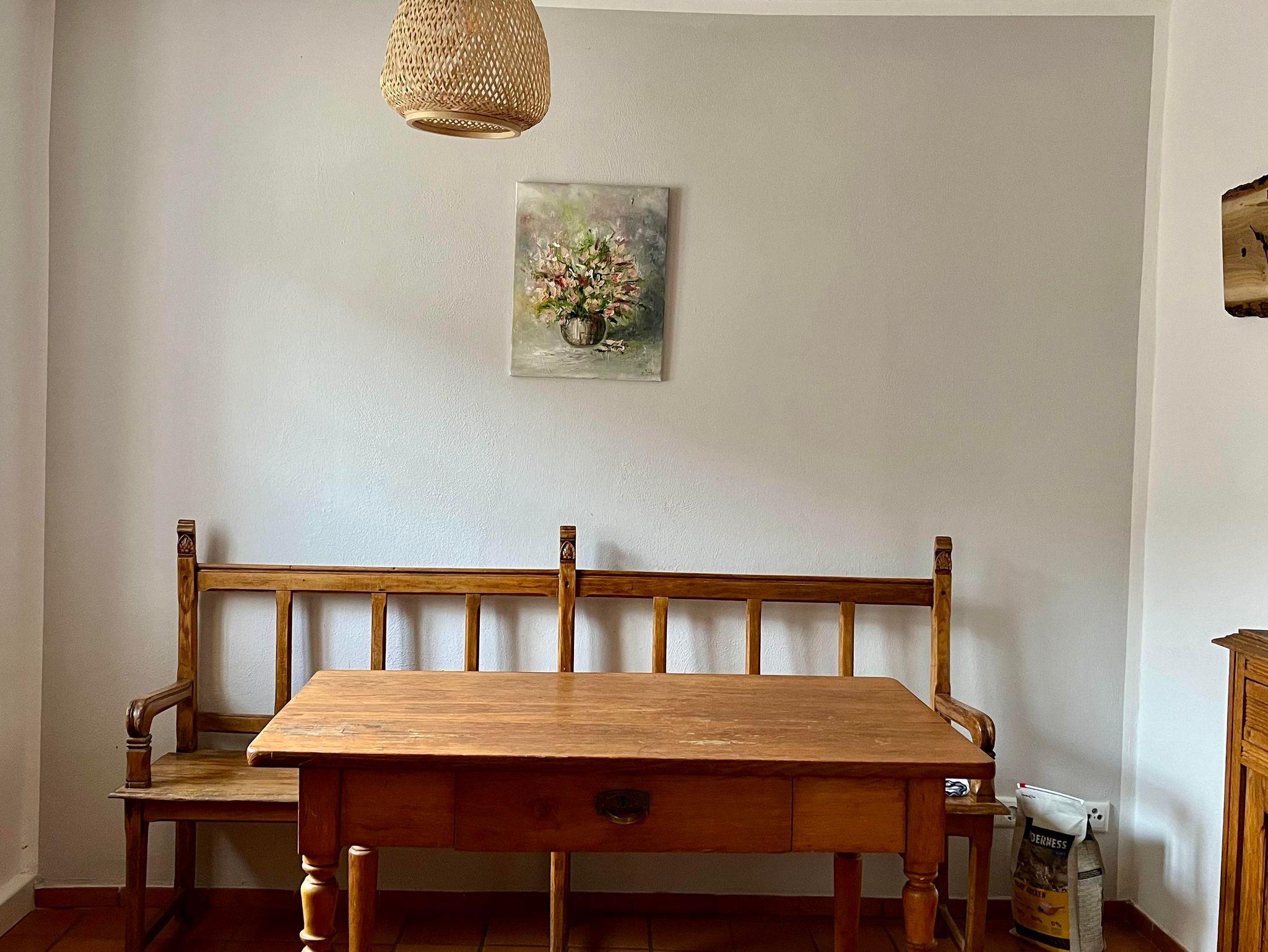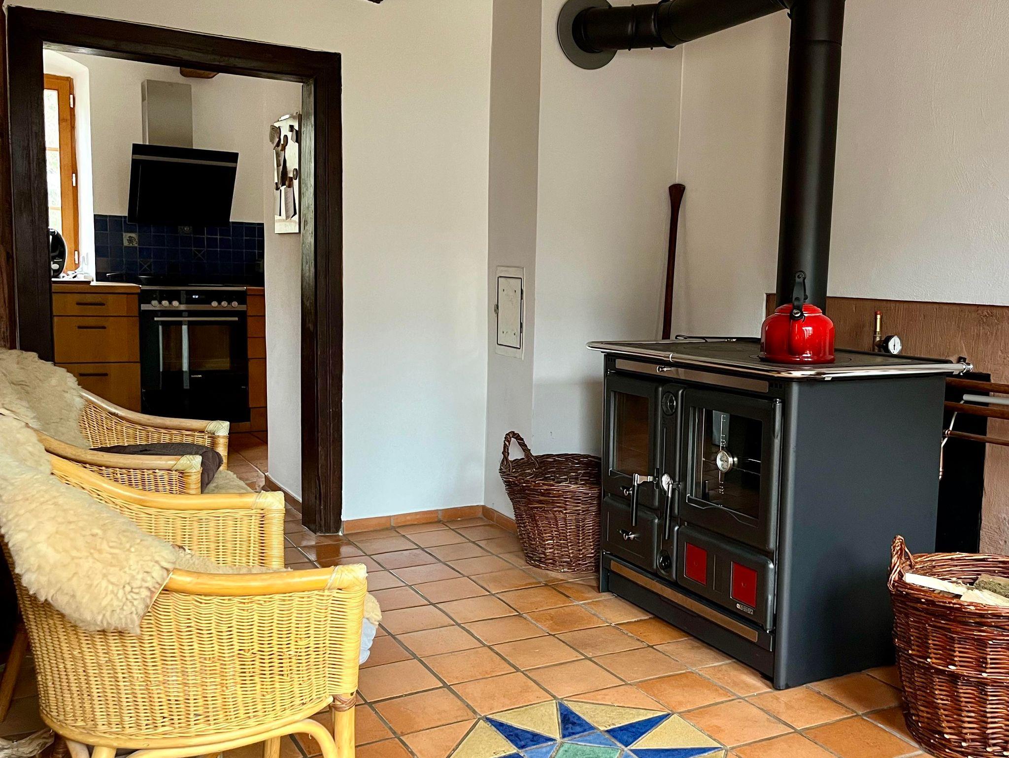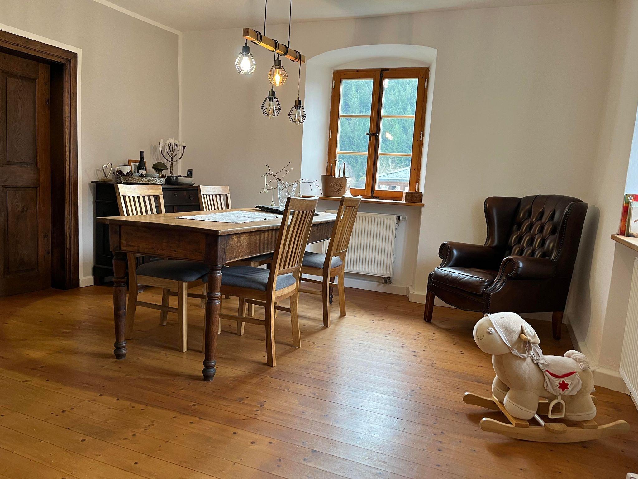Unser Bauernhaus Vulkaneifel ist ein 200 Jahre altes Denkmal Haus mit alten Eichenböden und urigen Kaminen. Unten befindet sich im Flur in der damaligen schwarzen Küche nun ein neuer wassergeführder Küchenofen mit einer gemütlichen Sitzecke. Daneben befindet sich im Erdgeschoss ein Esszimner mit einem alten Kanonenofen, ein Arbeitszimme, das für Home Office genutzt werden kann und eine Küche mit Essbereich.