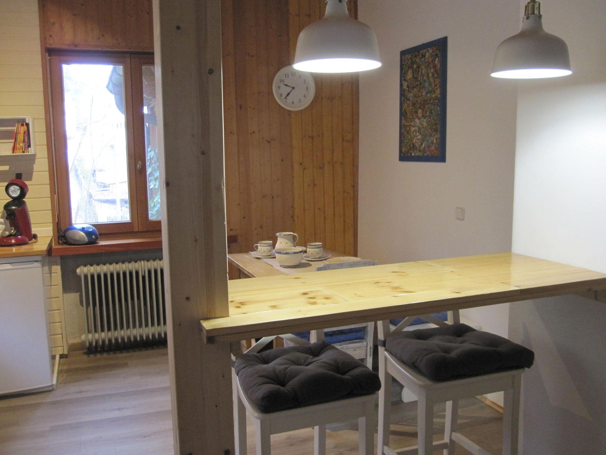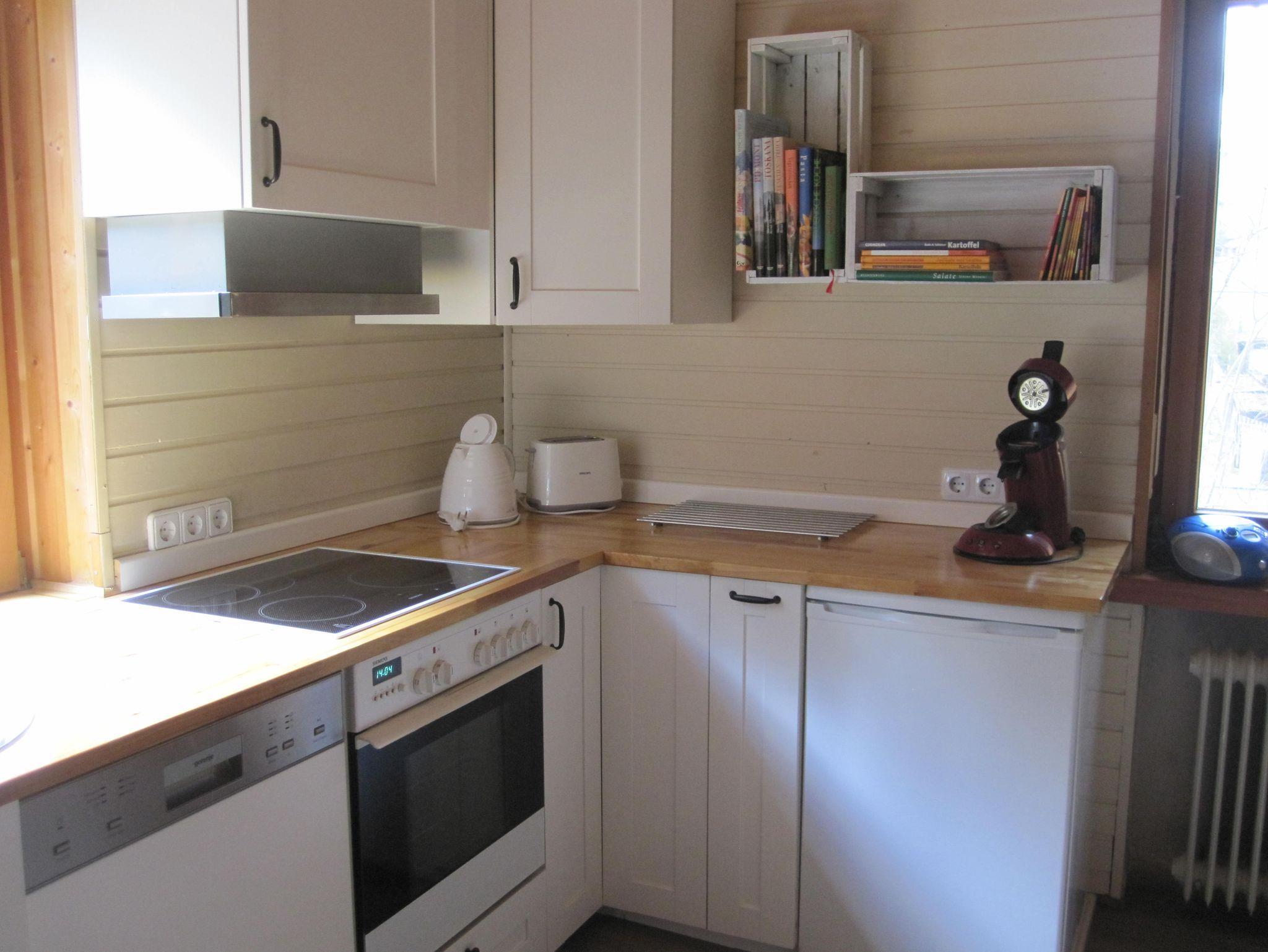 An den Wohnbereich grenzt eine offene, voll ausgestattete Küche mit Tresen und Sitzecke. Neben Toaster, Wasserkocher und Kaffeepadsmaschine finden Sie einen Herd mit Backofen, einen Geschirrspüler und einen Kühlschrank mit