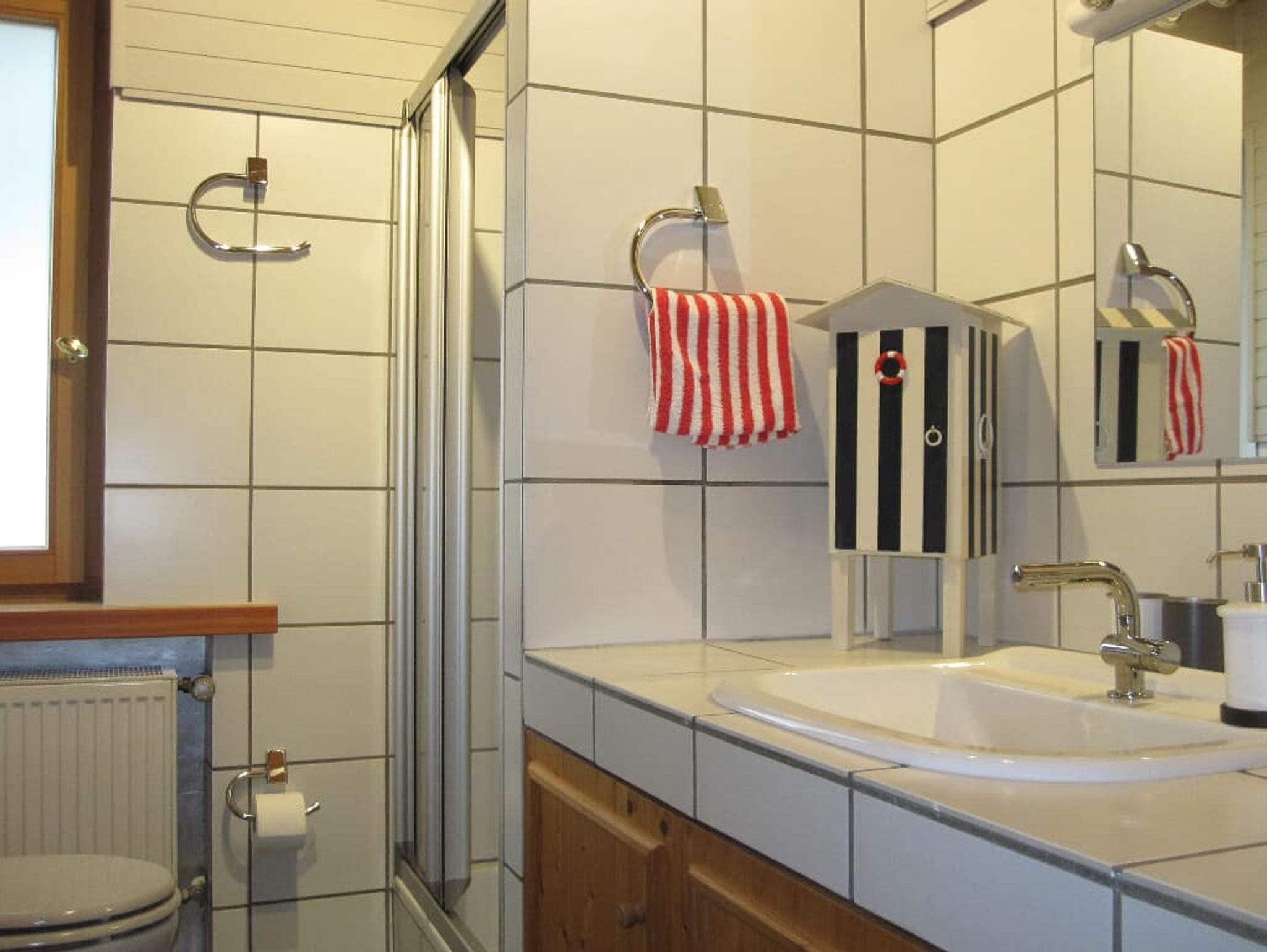 Das Badezimmer ist mit einer Dusche ausgestattet, Föhn und Handtücher sind vorhanden.