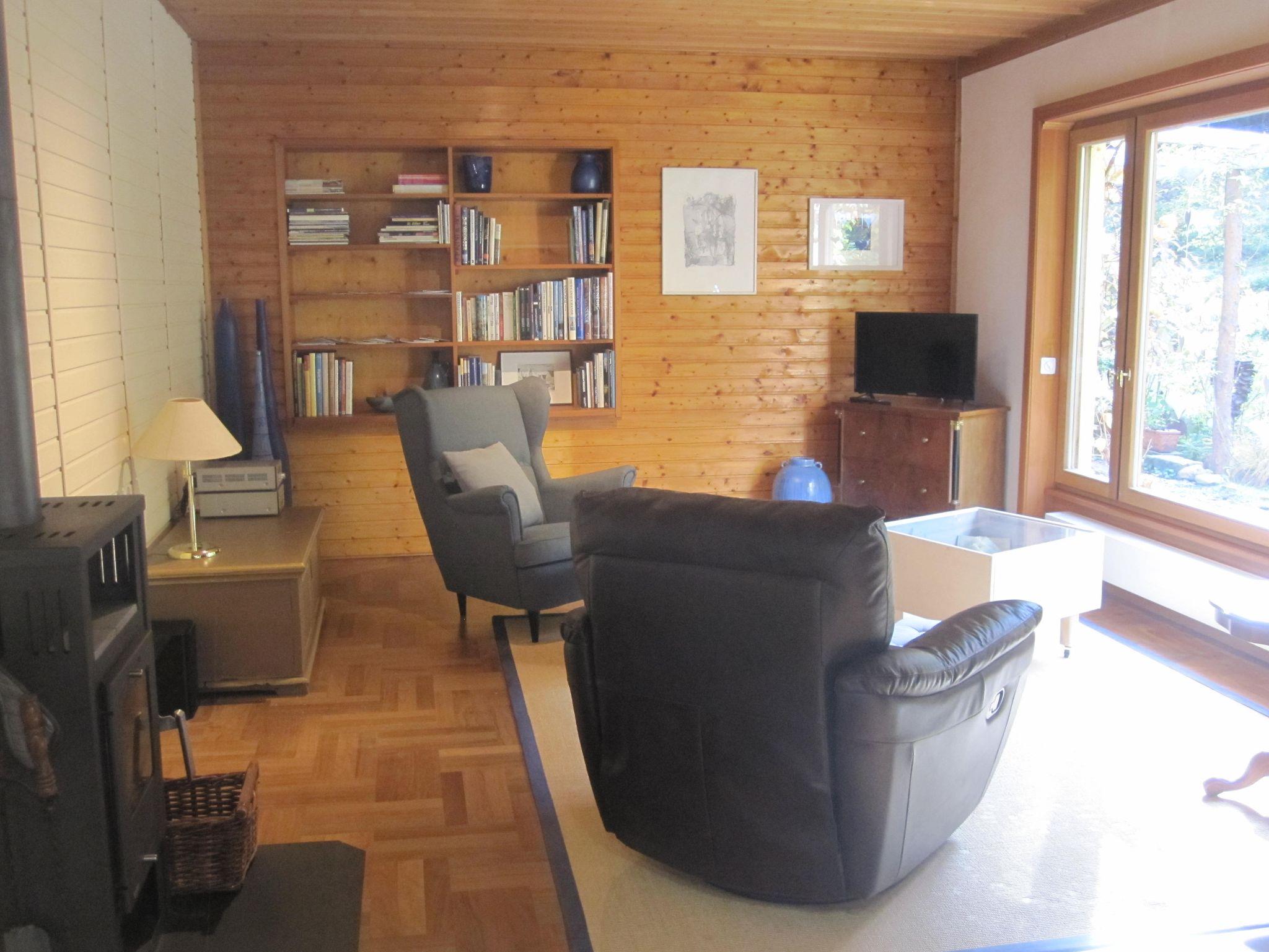 Im Wohnzimmer haben Sie den idealen Blick in den großen Garten. Ein Schwedenofen kann an kühleren Tagen ( gegen Aufpreis für Holz ) genutzt werden.