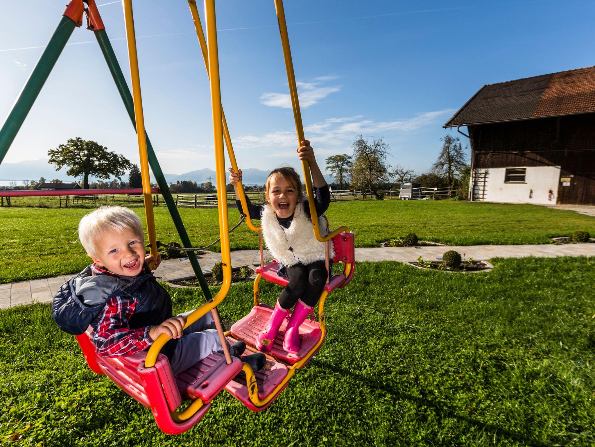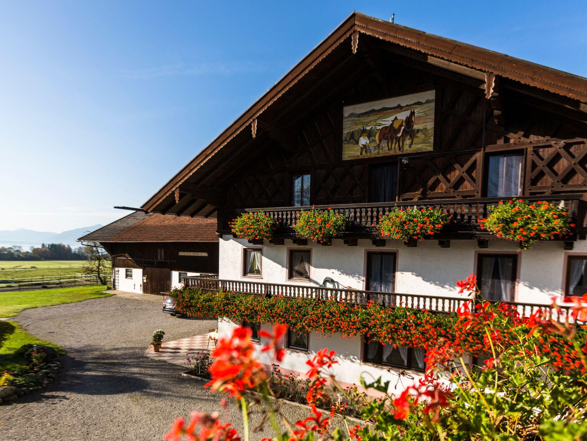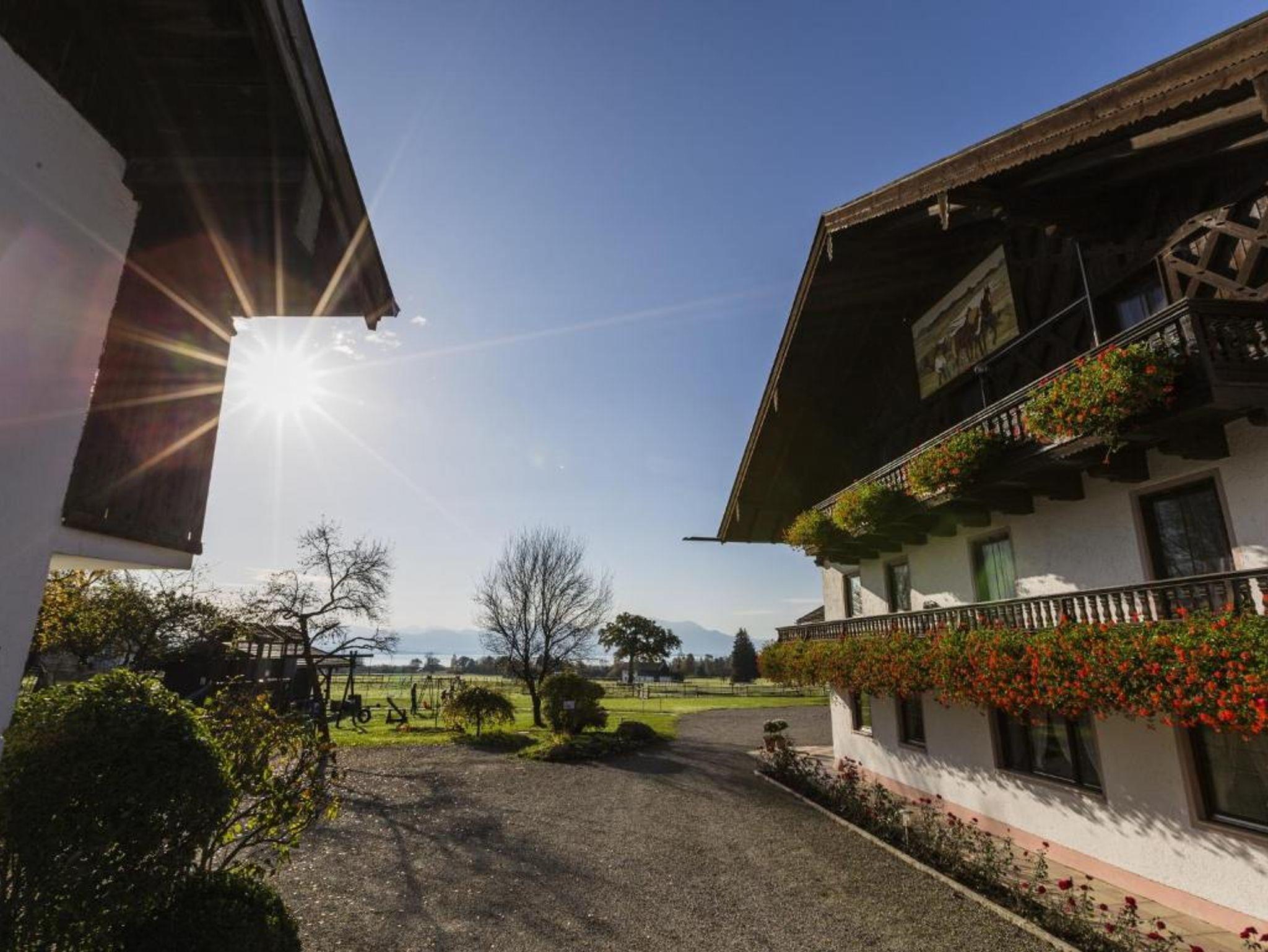 Wollen Sie einen schönen Urlaub auf einem Bauernhof mit grandioser Aussicht über das Bayerische Meer und auf die Chiemgauer Alpen? Dann melden Sie sich. Wir haben fünf Ferienwohnungen im Haus sowie eine Ferienwohnung im Zuhaus (Wohnung 5). Für Kinder haben wir ein Trampolin, Sandkasten, Spielhaus, Kletterturm mit Rutsche, Tischtennisplatte, Fußballtor, große Spielwiese und eine tolle Kinderseilbahn. Auch mehrere Tiere haben wir am Hof wie, Schafe, Katzen, Meerschweinchen, Hund, Hühner, Hasen, Kühe sowie Pferde. Wir sind jedoch kein Reiterhof!! Haustiere sind auf Anfrage und gegen Gebühr erlaubt. Ein Parkplatz ist ebenfalls vorhanden. Für schöne Abende, haben wir eine kleine Grillhütte und eine Feuerstelle die jederzeit benutzt werden darf. Für unsere Radfahrer gibt es auch einen Unterstellplatz/Abstellplatz für die Fahrräder. Ganz neu haben wir auch eine E-Tankstelle für Autos direkt am Hof. Über eine Anfrage/Buchung würden wir uns sehr freuen. Bitte beachten Sie, dass von Herbst bis Frühling nur Vermietung auf Anfrage statt findet.Wir empfehlen den Abschluss einer Reiserücktrittsversicherung, da wir, sollte ein stornierter Termin nicht neu belegt werden können, eine Stornogebühr von 90% der Gesamtkosten erheben. Bei Neubelegung fällt eine Bearbeitungsgebühr von 10% der Gesamtkosten an.