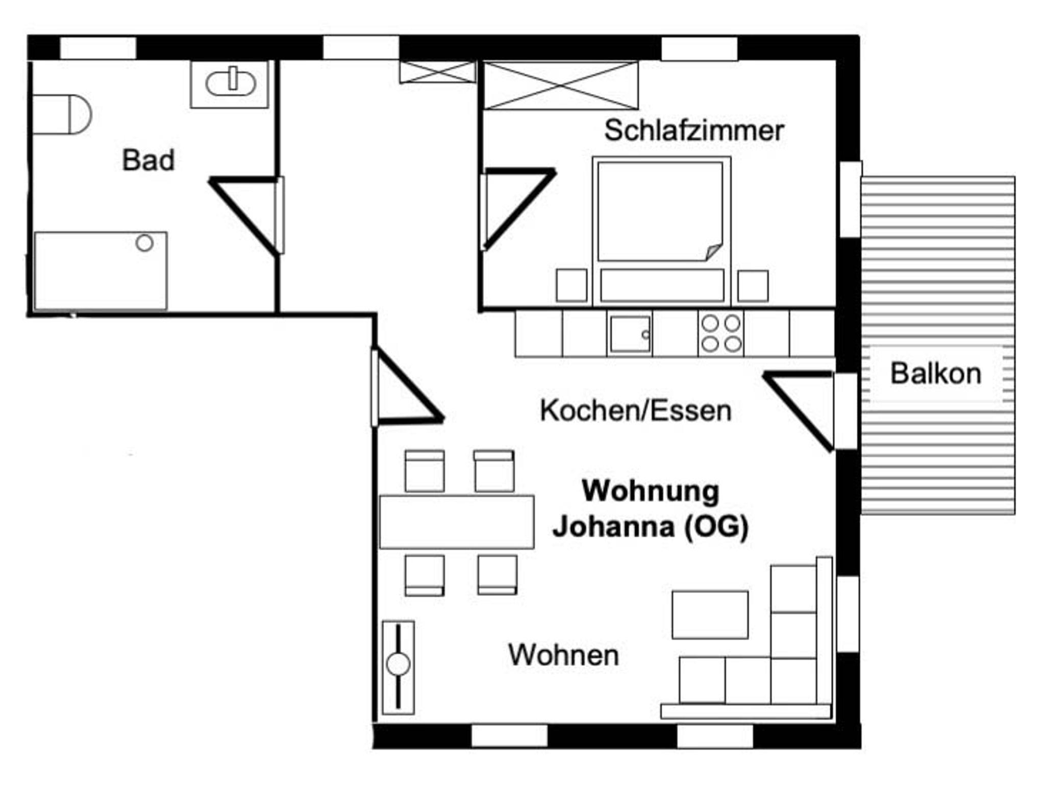 Die moderne Ferienwohnung Johanna liegt im Obergeschoß des Hauses und bietet mit 55m² Wohnfläche ausreichend Platz für bis zu 3 Personen. Der großzügige Wohn- und Essbereich mit Küche hat einen direkten Zugang zum Südbalkon. Im einladenden Wohnbereich befindet sich eine ausziehbare Couch mit Schlaffunktion (Liegefläche 120cm x 200cm) sowie ein Fernseher.