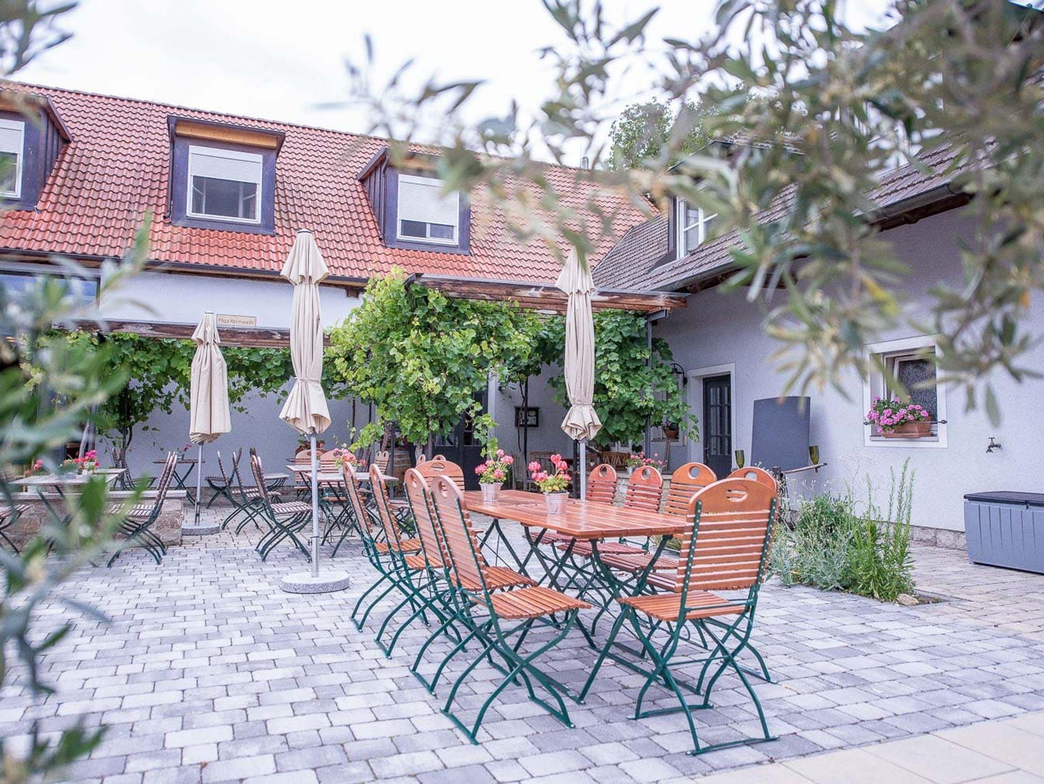 In den warmen Monten kann man im Innenhof zwischen den Reben die Seele baumeln lassen und den Stress und die Hektik des Alltags vergessen.