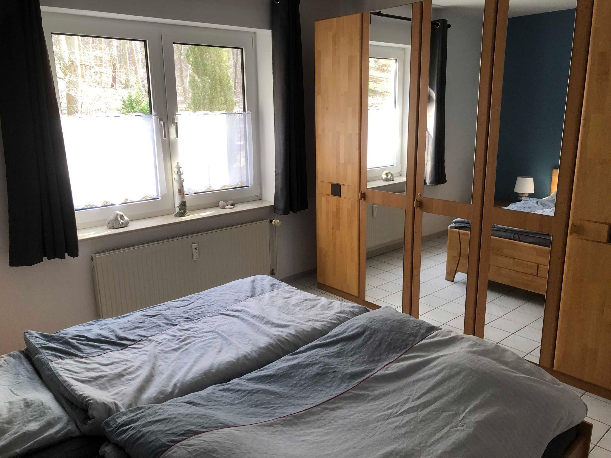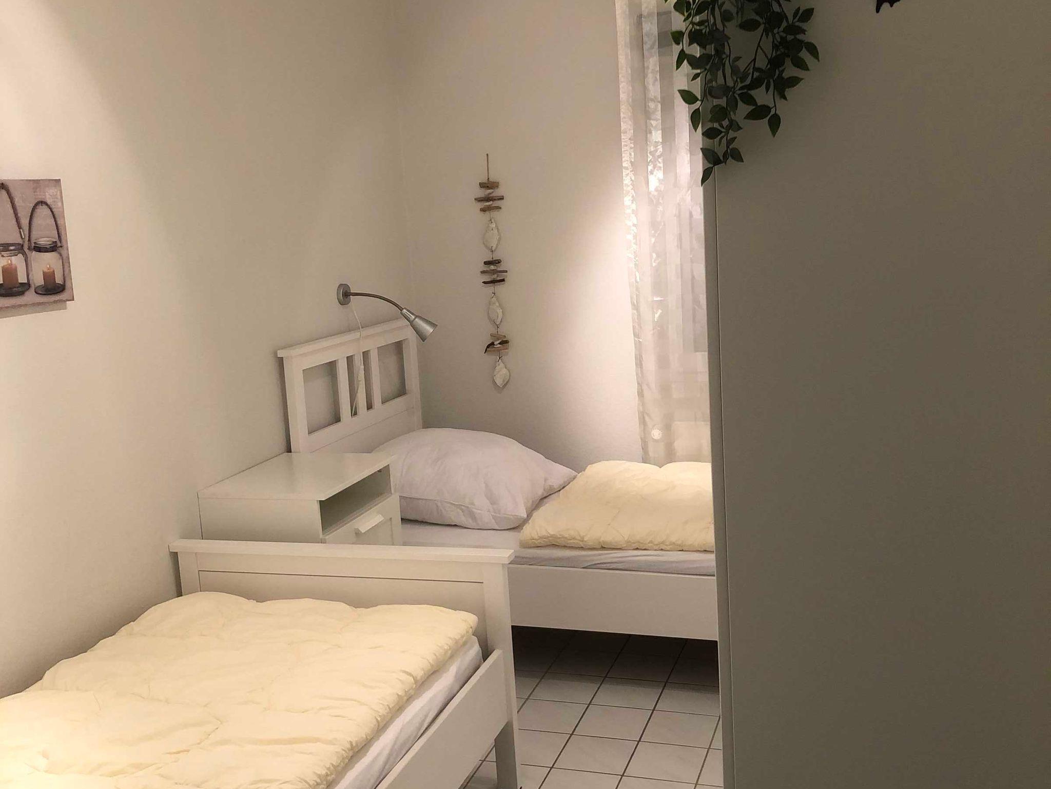 Des Weiteren enthält die Ferienwohnung zwei Schlafräume, in einem befindet sich ein Doppelbett und im anderen zwei Einzelbetten.