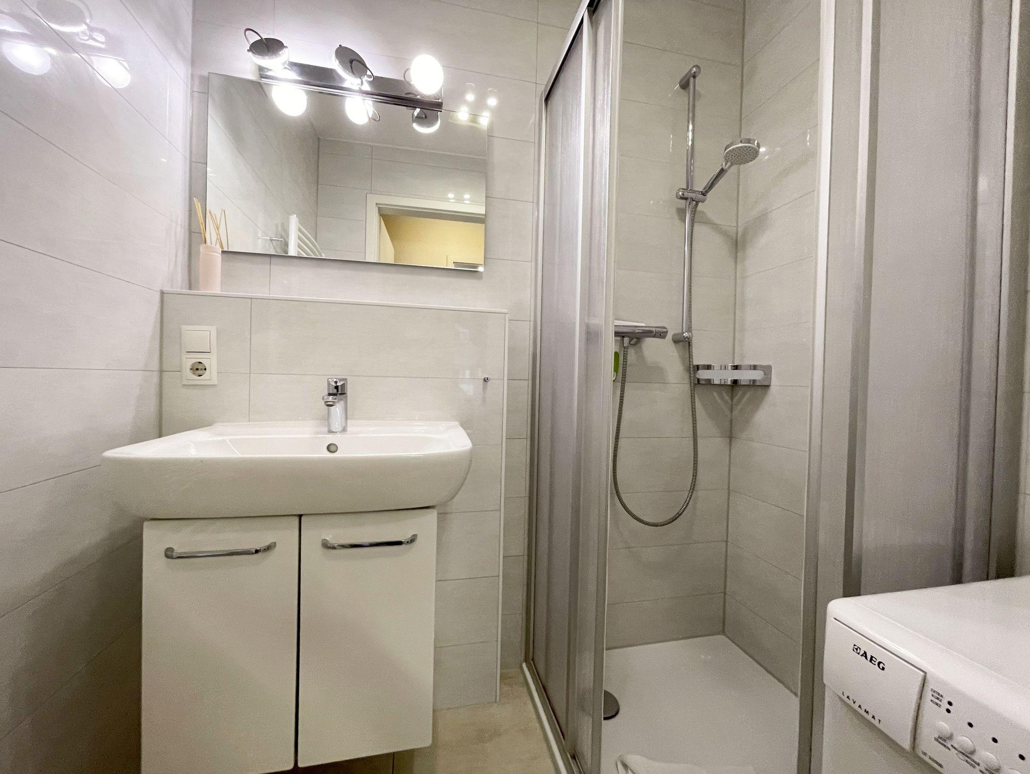 Die gemütlich eingerichtete Nichtraucherwohnung befindet sich in der 1. Etage des Hauses Südperd im Seepark Sellin. Durch die ca. 52 qm große Wohnfläche bietet Sie ausreichend Platz für max. 2 Personen. Der Wohn-/ Essbereich ist mit Schiebetüren voneinander abtrennbar. Der Essbereich verfügt über eine Einbauküche mit Induktionsceranfeld, Spüle, großen Kühl-und Gefrierschrank, Spülmaschine, Mikrowelle, Backofen, Kaffeemaschine, Toaster, Wasserkocher sowie diversen Küchenutensilien. Angrenzend haben Sie einen hellen und gemütlichen Essbereich, der nicht nur für die Mahlzeiten zum Verweilen einlädt. Zusätzlich haben Sie eine Leselampe, ein Highboard mit Smart-TV und Mini-Stereo-Anlage. Ein 2. TV-Flachbild (40?) steht im Wohnbereich zur Verfügung, ebenso ein Blu-Ray-Player. Im Wohnbereich passt sich eine Couch, 1 Sessel, ein Couchtisch sowie eine Anrichte dem Raum an. Das geräumige Schlafzimmer bietet Ihnen ein Doppelbett (2 x 0,90 m x 2,00 m), verstellbare Lattenroste, Nachtischkonsolen und Kleiderschrank. Vom Schlaf-/Ess- & Wohnbereich können Sie den bestuhlten Balkon (Südosten) erreichen. Das Badezimmer ist in 2 Räume aufgeteilt, wo sich in einem der Räume eine ebenerdige Glasdusche sowie ein Waschtisch mit Fön sowie eine Waschmaschine befindet und in einem weiteren Raum das WC mit kleinem Waschbecken. Beide Badezimmer sind gefliest. Alle anderen Räumlichkeiten sind mit einem Vinylboden verlegt worden. Ein eigener PKW-Stellplatz (43) steht Ihnen in der Tiefgarage (Höhe 2,00m) zur Verfügung sowie auch eine Fahrradabstellmöglichkeit. Auch im Urlaub brauchen Sie in Ihrer Wohnung nicht auf einen Internetanschluss (WLAN) zu verzichten. Dieser ist für Sie inklusive!!! Für unsere kleinen Gäste ist 1x Kinderreisebett mit zusätzlicher Matratze (ohne Bettinlett) inklusive. 2 kleine Hunde oder 1 Kniehoher Hund (keine Katzen) sind gegen eine Gebühr gern gesehene Gäste in der Wohnung. Die Erstausstattung eines Wäschepaketes (komplette Bettwäsche, 1 Duschhandtuch, 2 kleine Handtücher) können Sie bis 14 Tage vor Anreise gegen einen Aufpreis dazu buchen oder durch eigene ergänzen. Ab 2 gebuchten Paketen erhalten Sie einmalig 1 Geschirrhandtuch und 1 Duschvorleger hinzu.