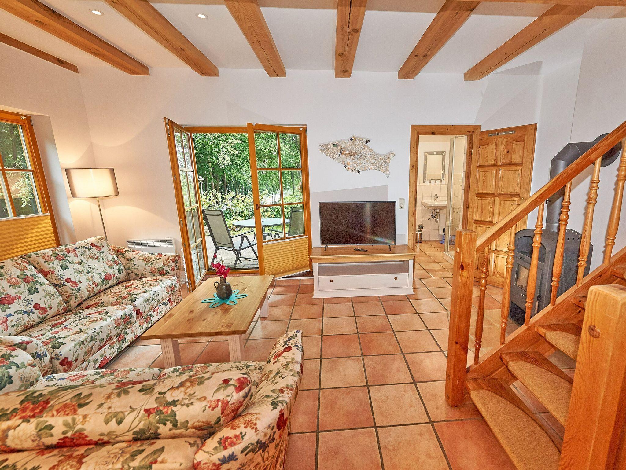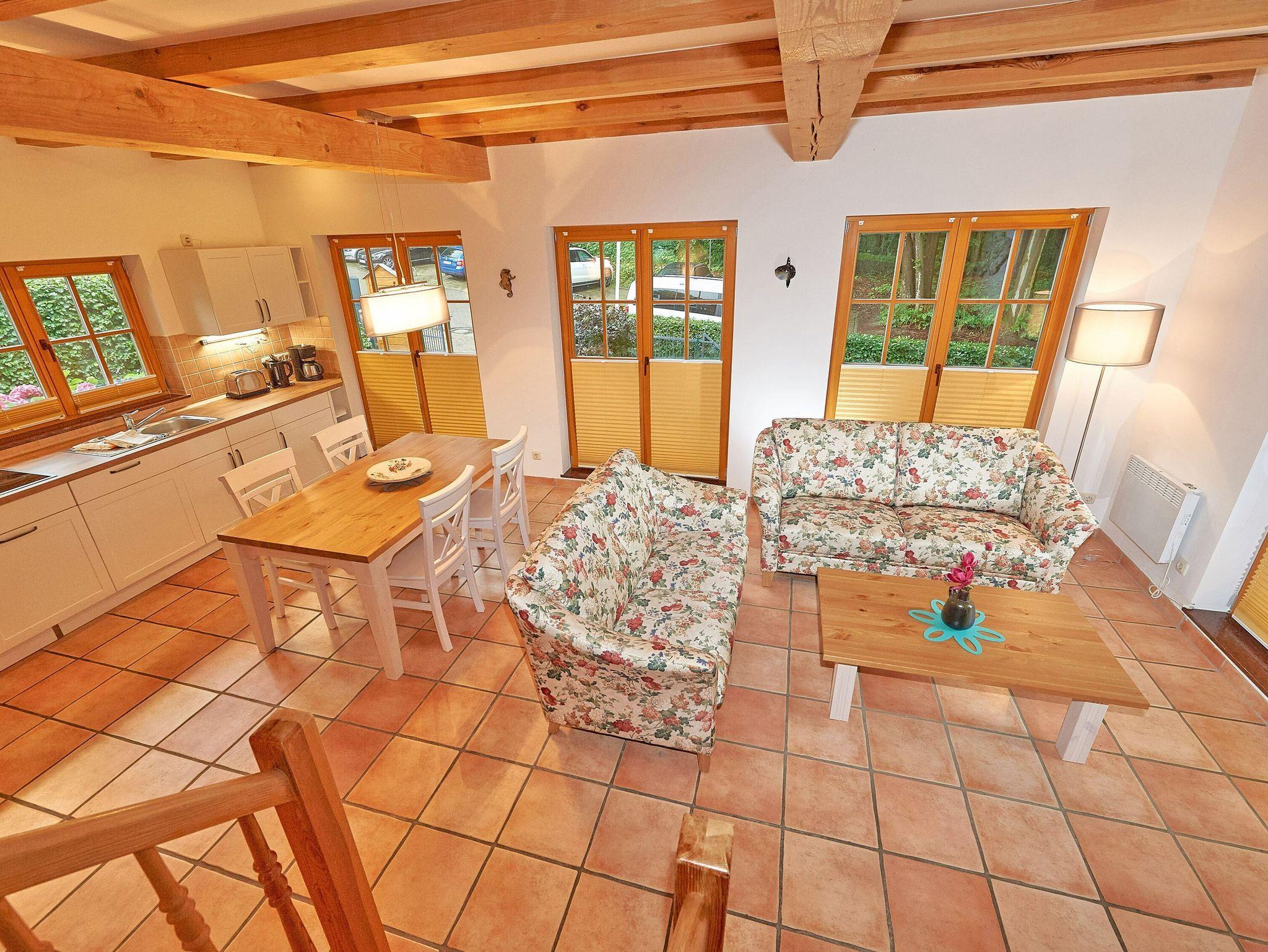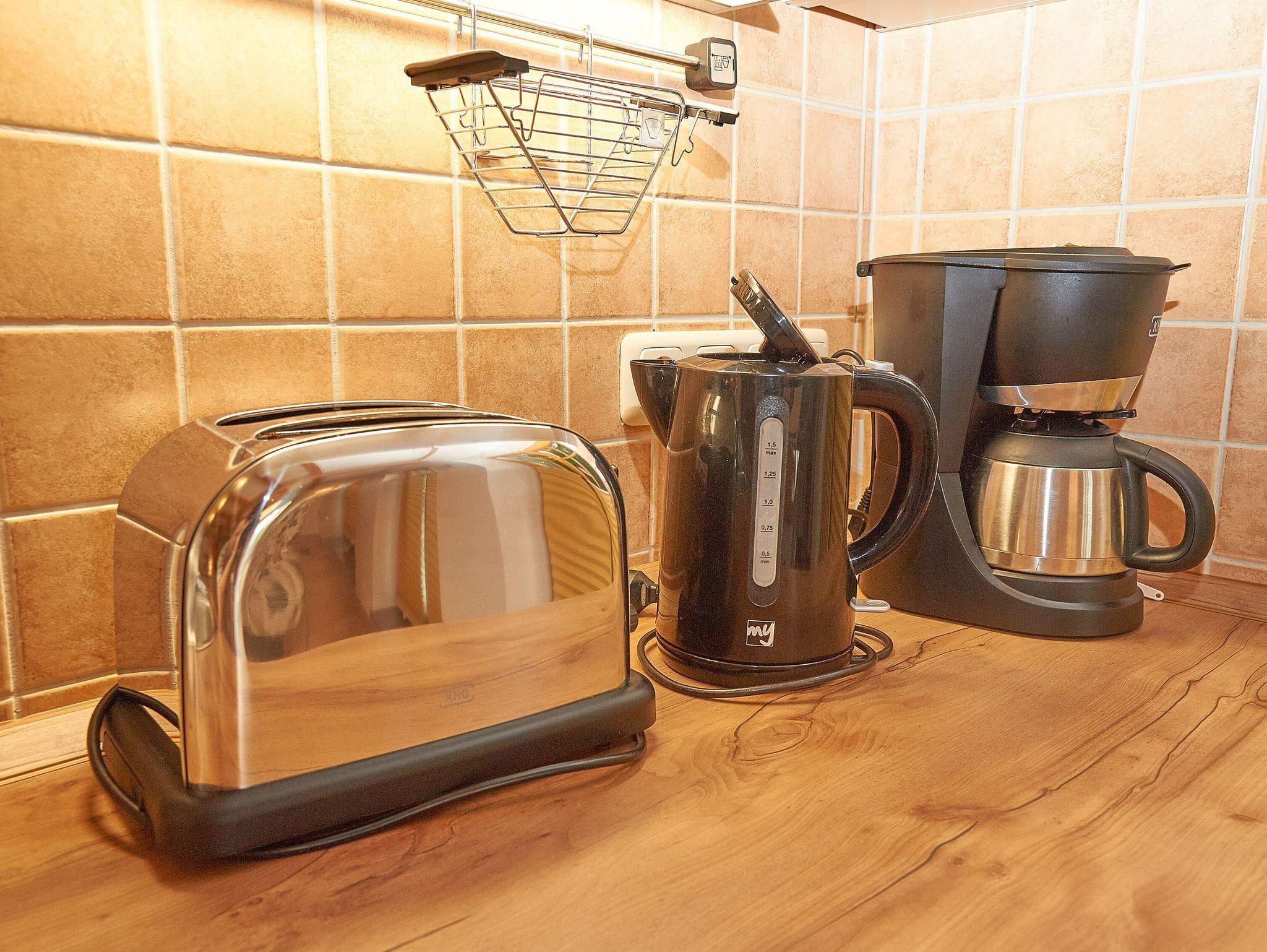 Zwei Sofas vor dem großen Flachbild-TV, kostenfreies W-LAN und der Kaminofen ermöglichen angenehme Abende, auch wenn es draußen vielleicht gerade nicht so schönes Wetter ist. Der große Esstisch ist für vier Personen geeignet. Die harmonisch in den Wohnbereich integrierte Küchenzeile ist ausgestattet mit einem 4-Zonen-Cerankochfeld, einem Kühlschrank mit Gefriermöglichkeit, einer Spülmaschine, einer Mikrowelle mit Grill, Kaffeemaschine, Toaster, Wasserkocher und diversem Kleininventar, das die Ausstattung komplettiert. Auch eine Waschmaschine ist hier untergebracht.