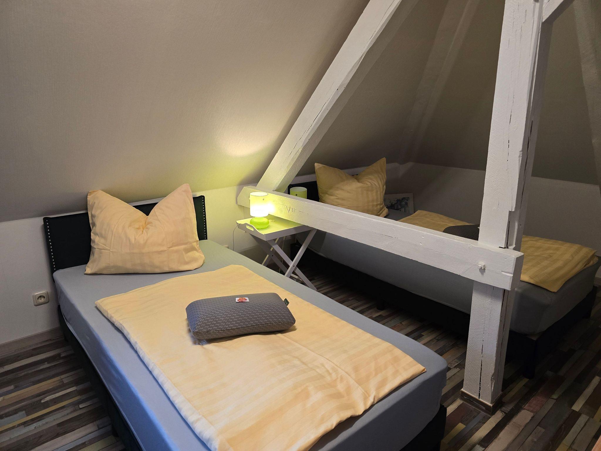 Das Zweibettzimmer liegt im Dachgeschoss und ist ausgestattet mit DU/WC, TV, Wlan