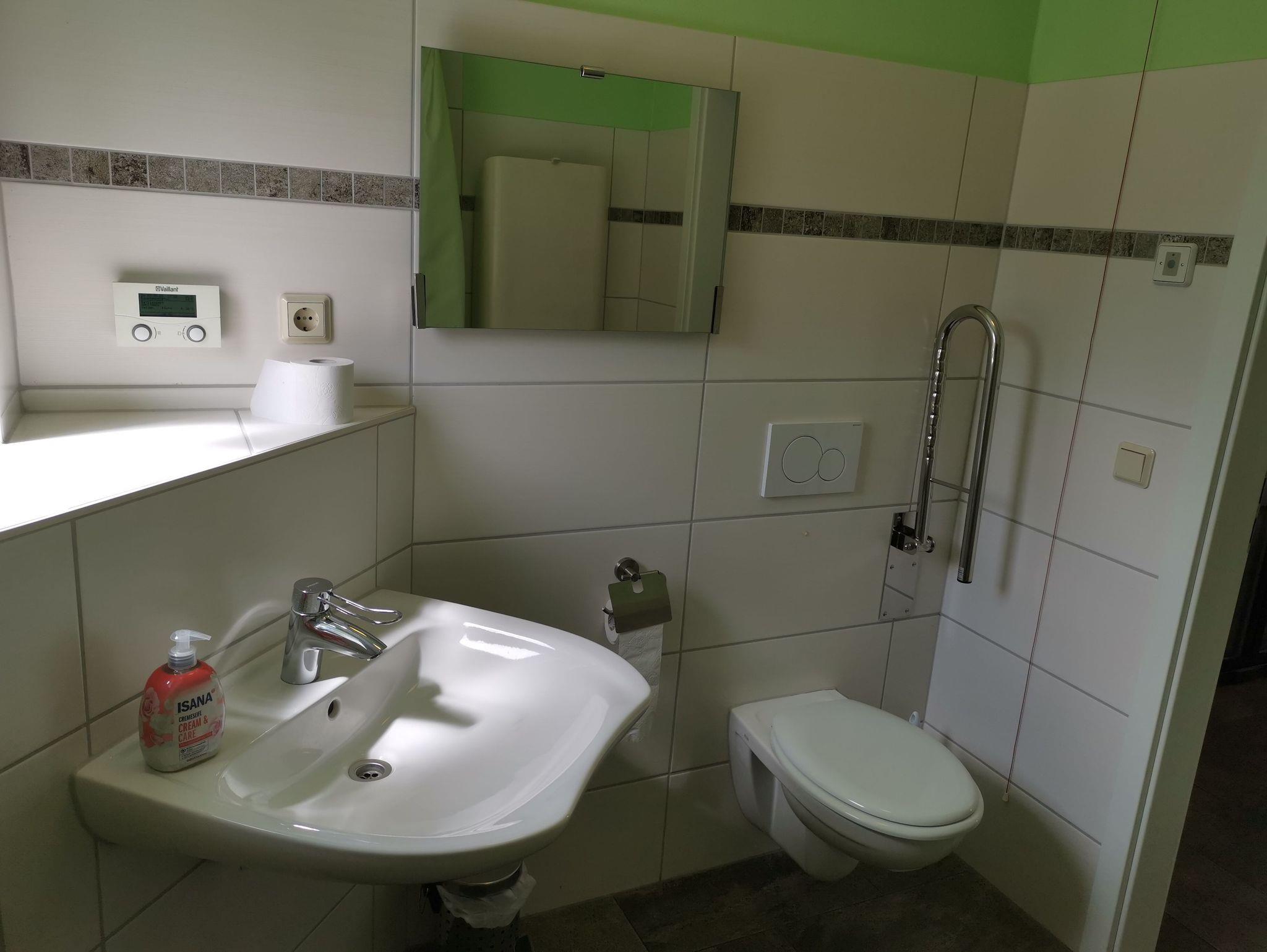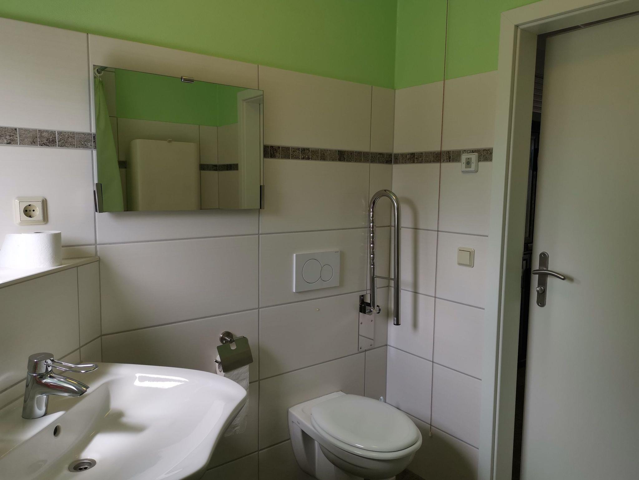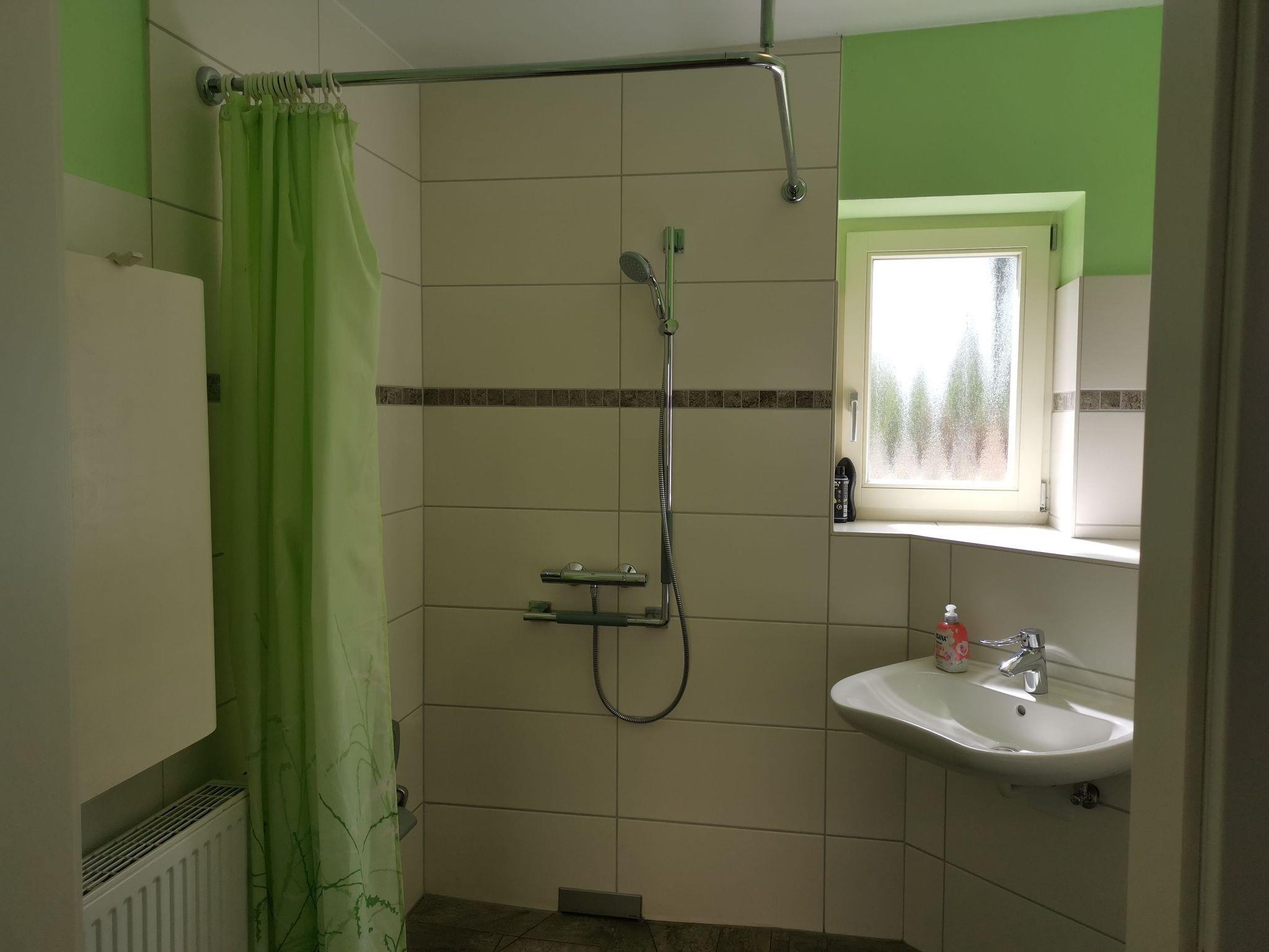 Das Bad mit Dusche und WC erreicht man außerhalb des Zimmers über die Außentreppe direkt im Gebäude nebenan.