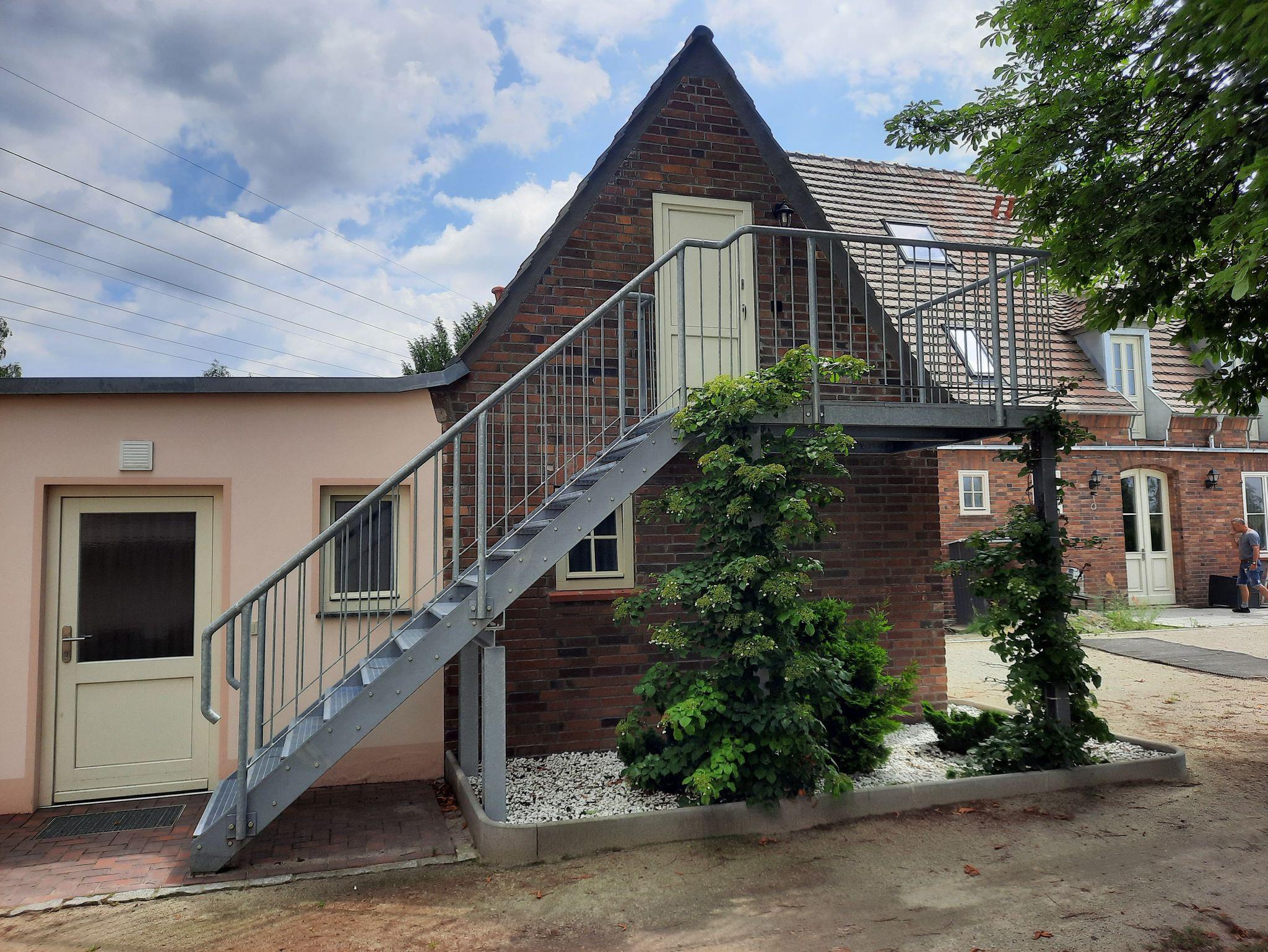 Die Außentreppe ist eine Gittertreppe aus Metall.