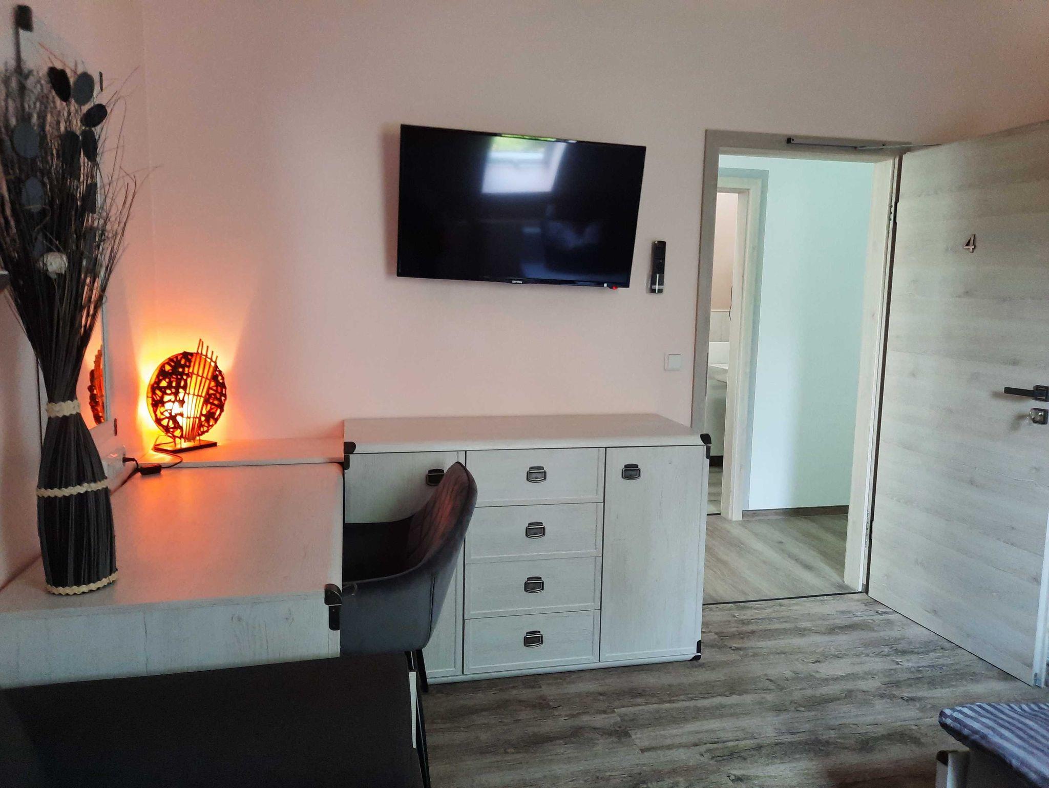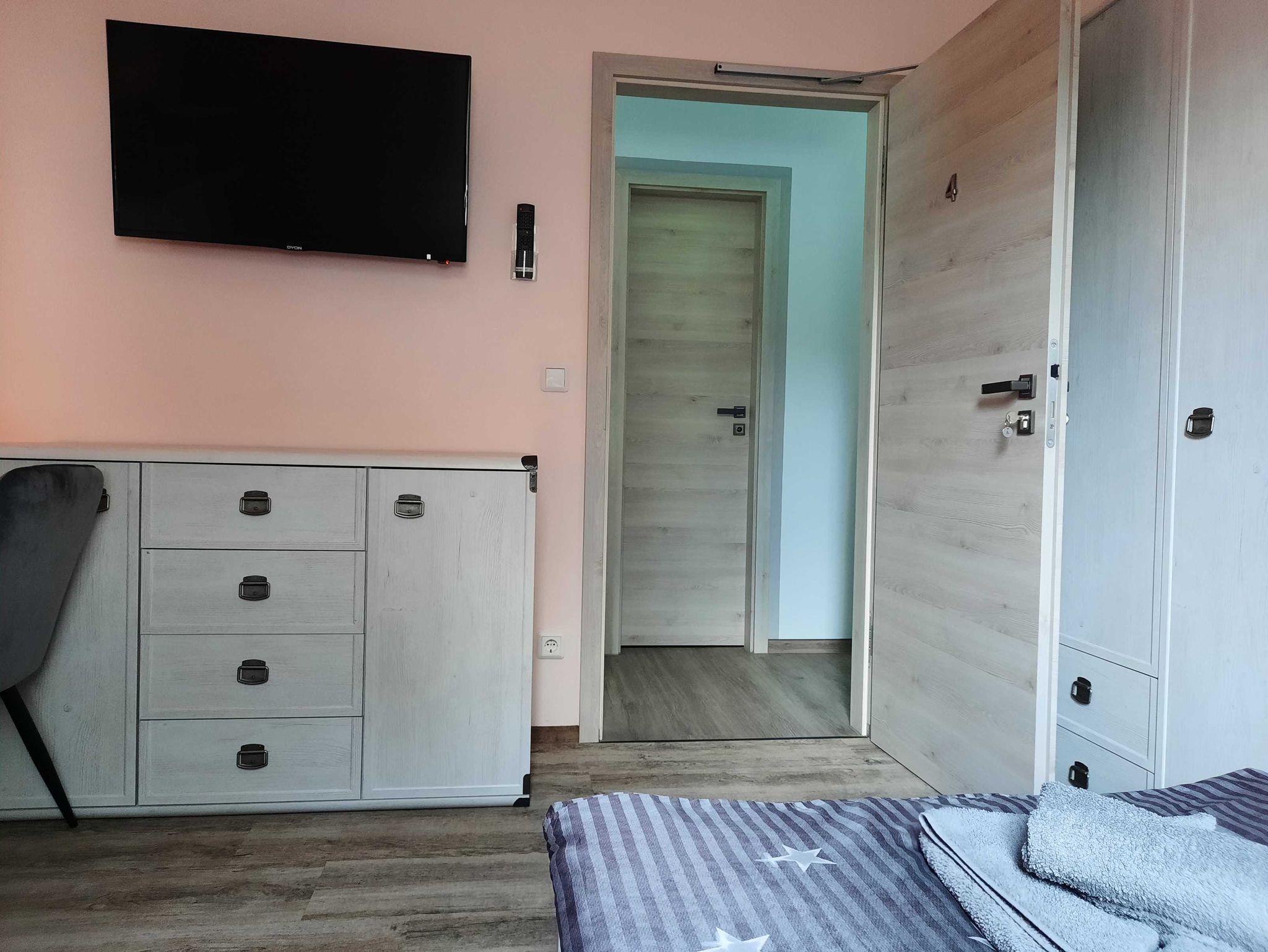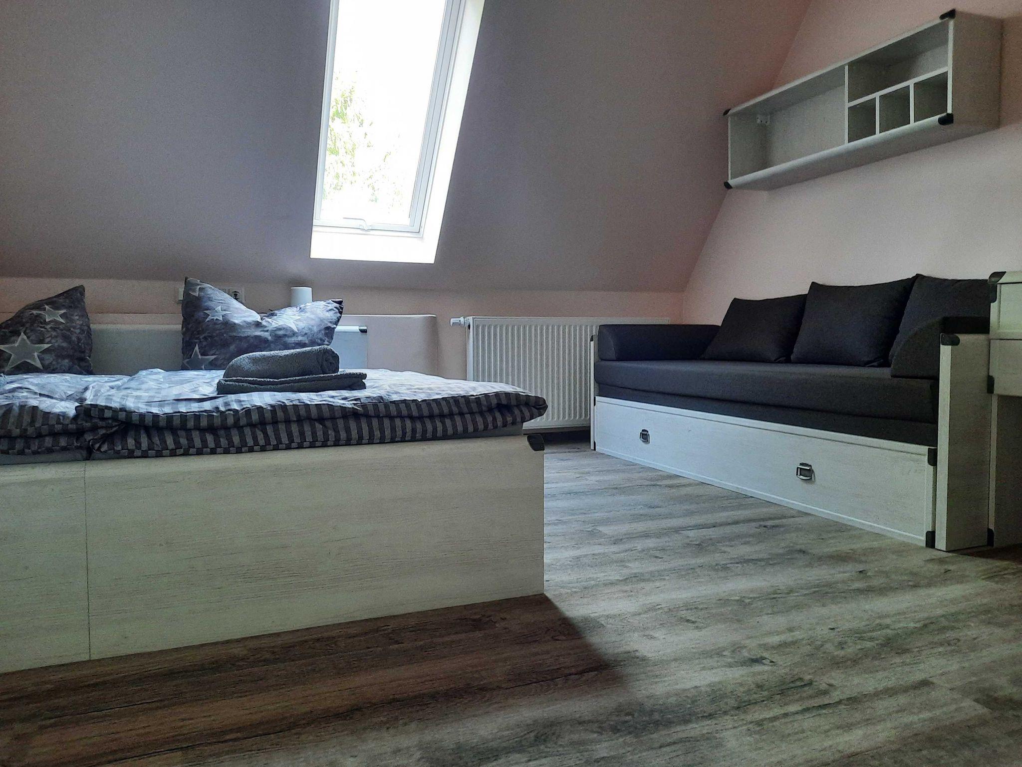 Das Zimmer verfügt über 1 Doppelbett mit einer ausziehbaren Schlafcouch, TV und Schrank.