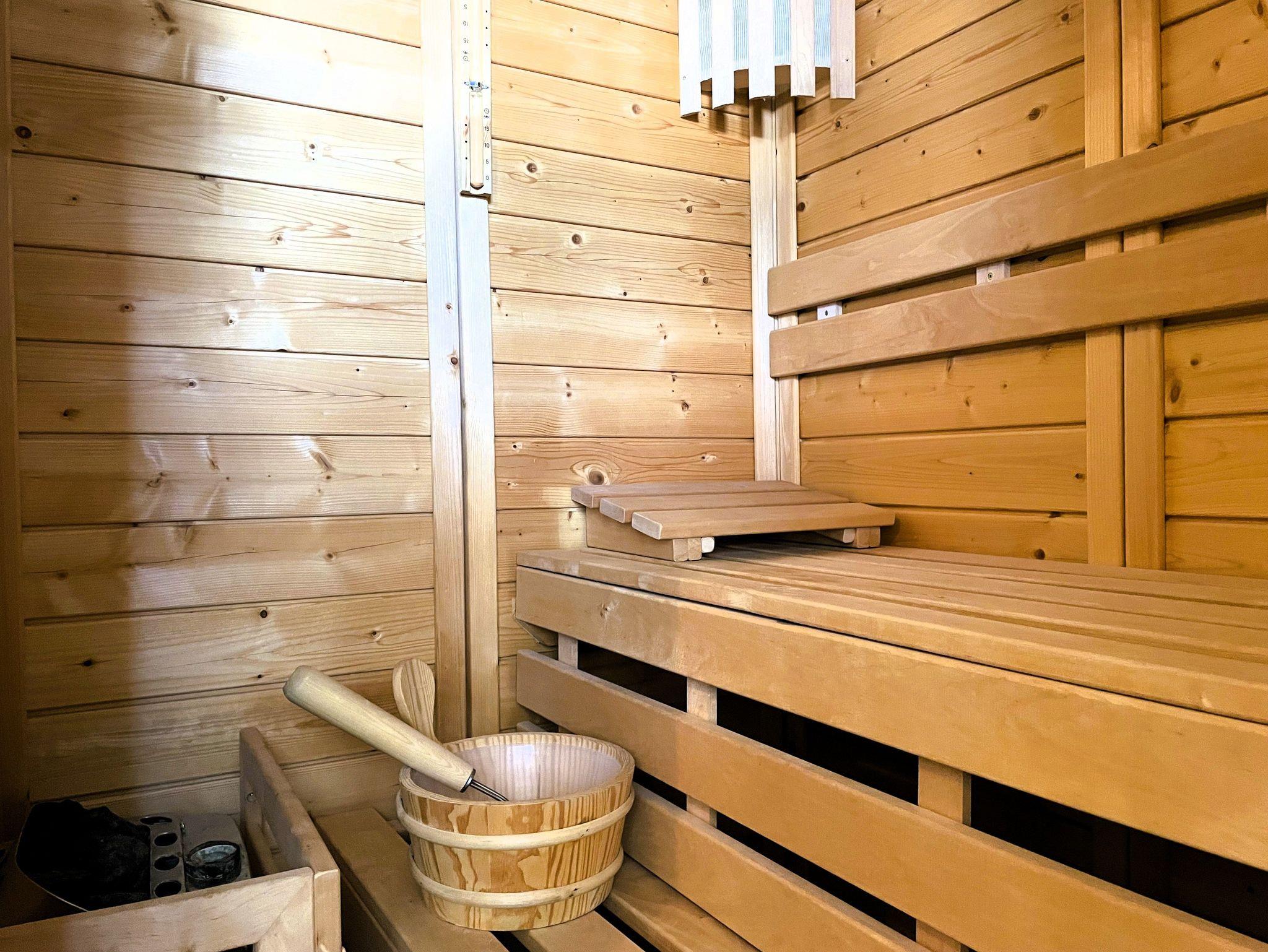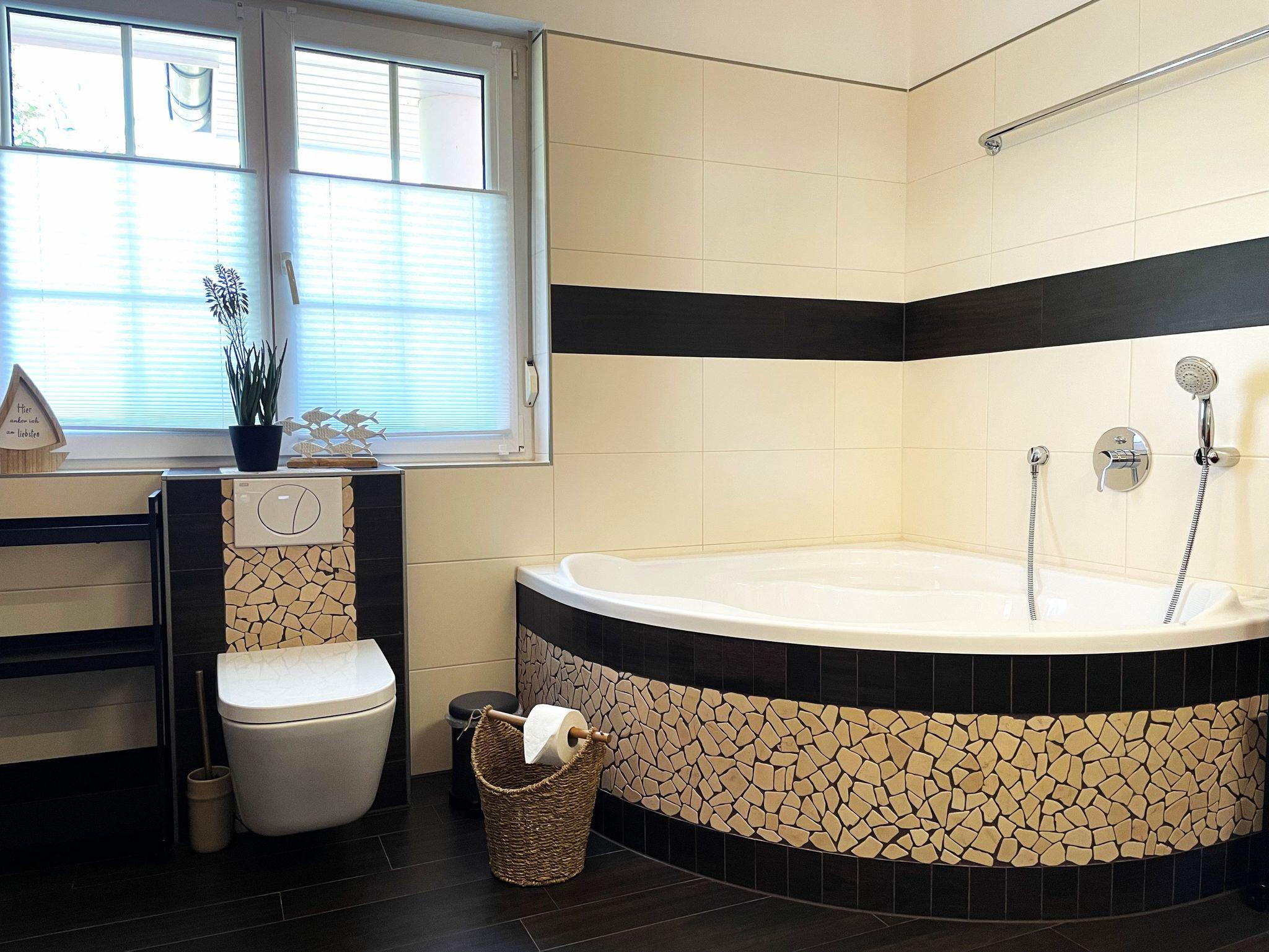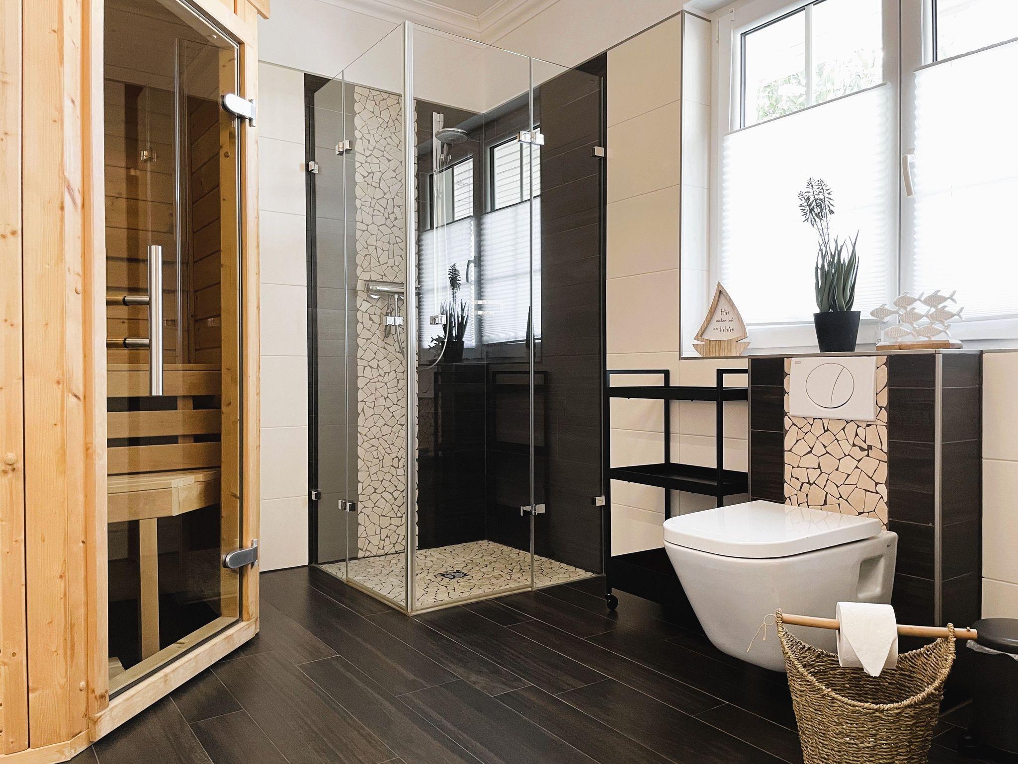 Das Badezimmer verfügt über eine Eckbadewanne, ebenerdige Dusche, ein Waschtisch mit Spiegel, Handtuchwärmer sowie ein WC. Eine integrierte Sauna im Bad sorgt für noch mehr Urlaubsfeeling in diesem schönen Ferienhaus.