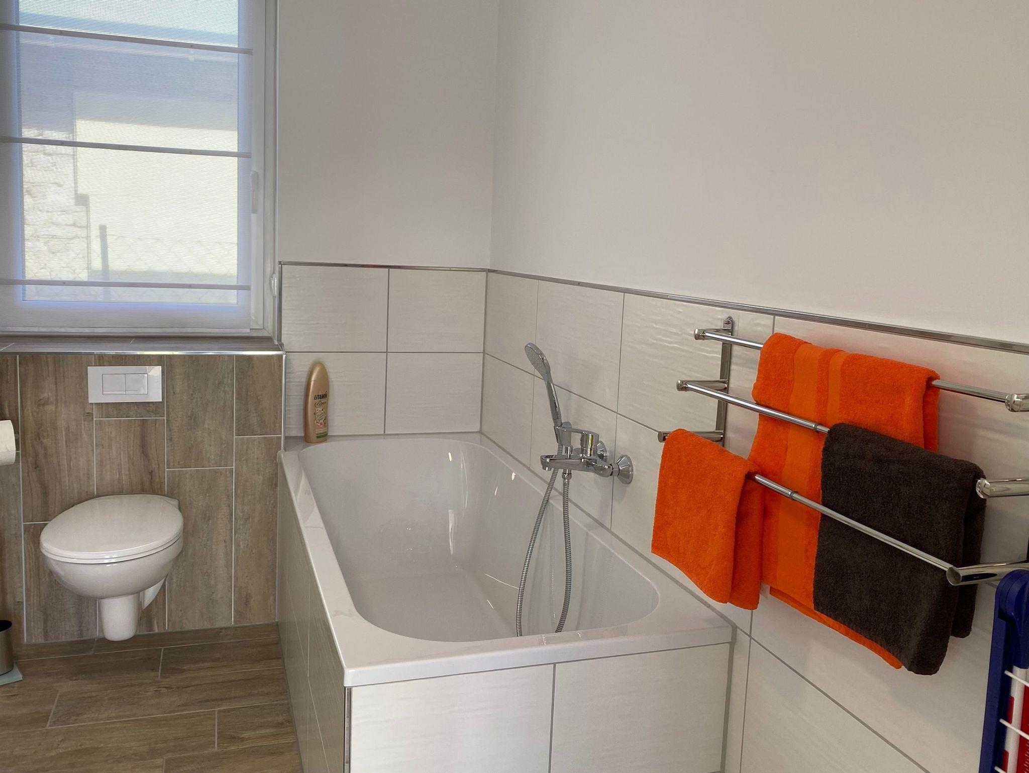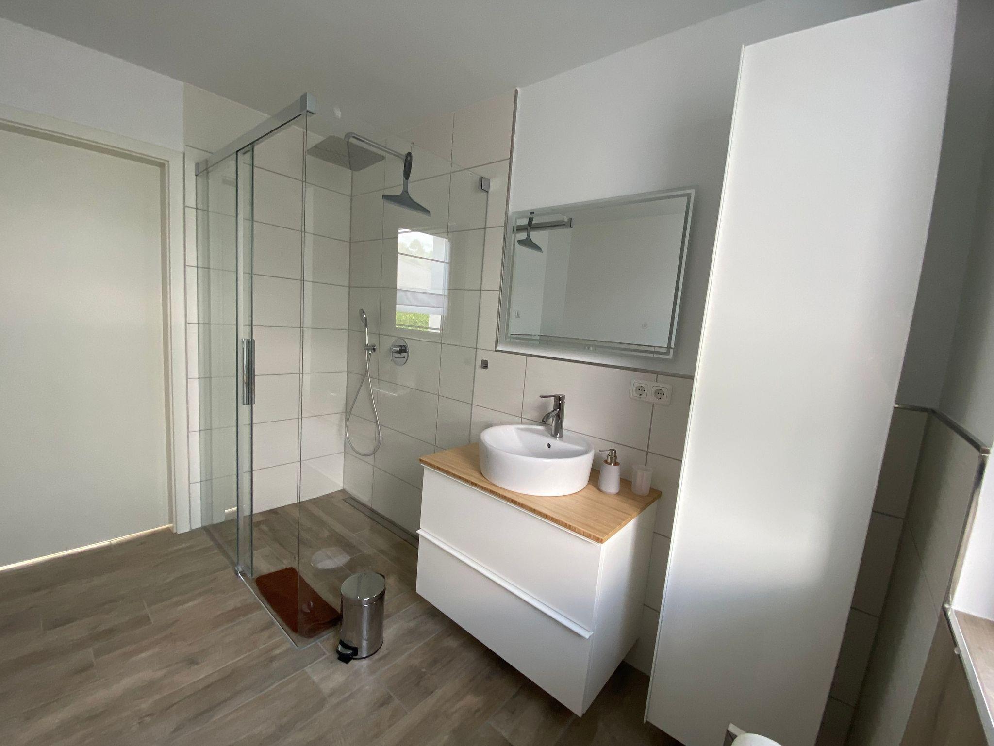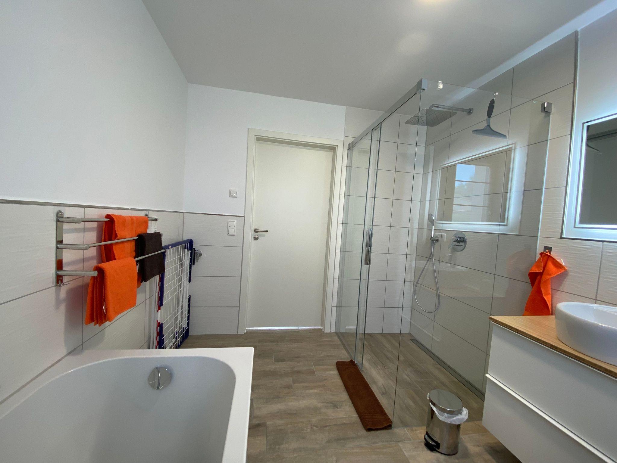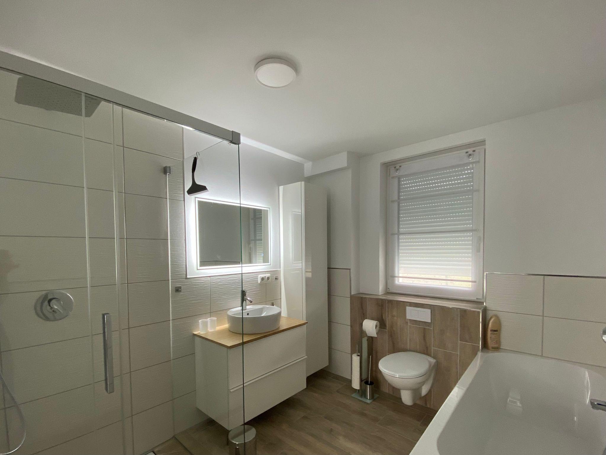 Das Bad bietet mit Regendusche sowie Badewanne allen Komfort, den Sie erwarten können.