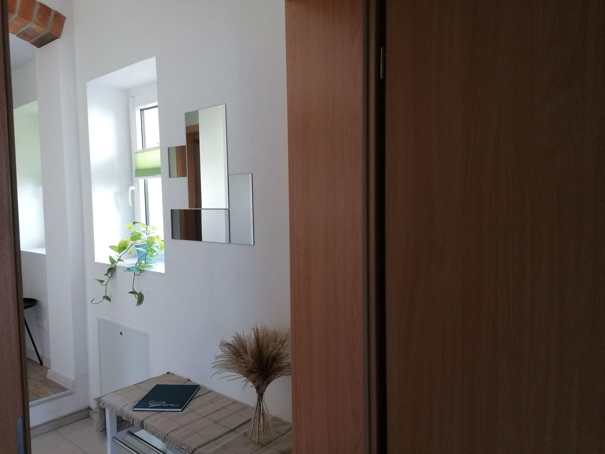 Die Wohnung bietet genügend Platz für 2 Personen und ist ausgestattet mit einem Schlafraum, einem Wohnraum mit TV und einer offenen Küche. Das modern eingerichtete Bad hat eine große, ebenerdige Dusche.