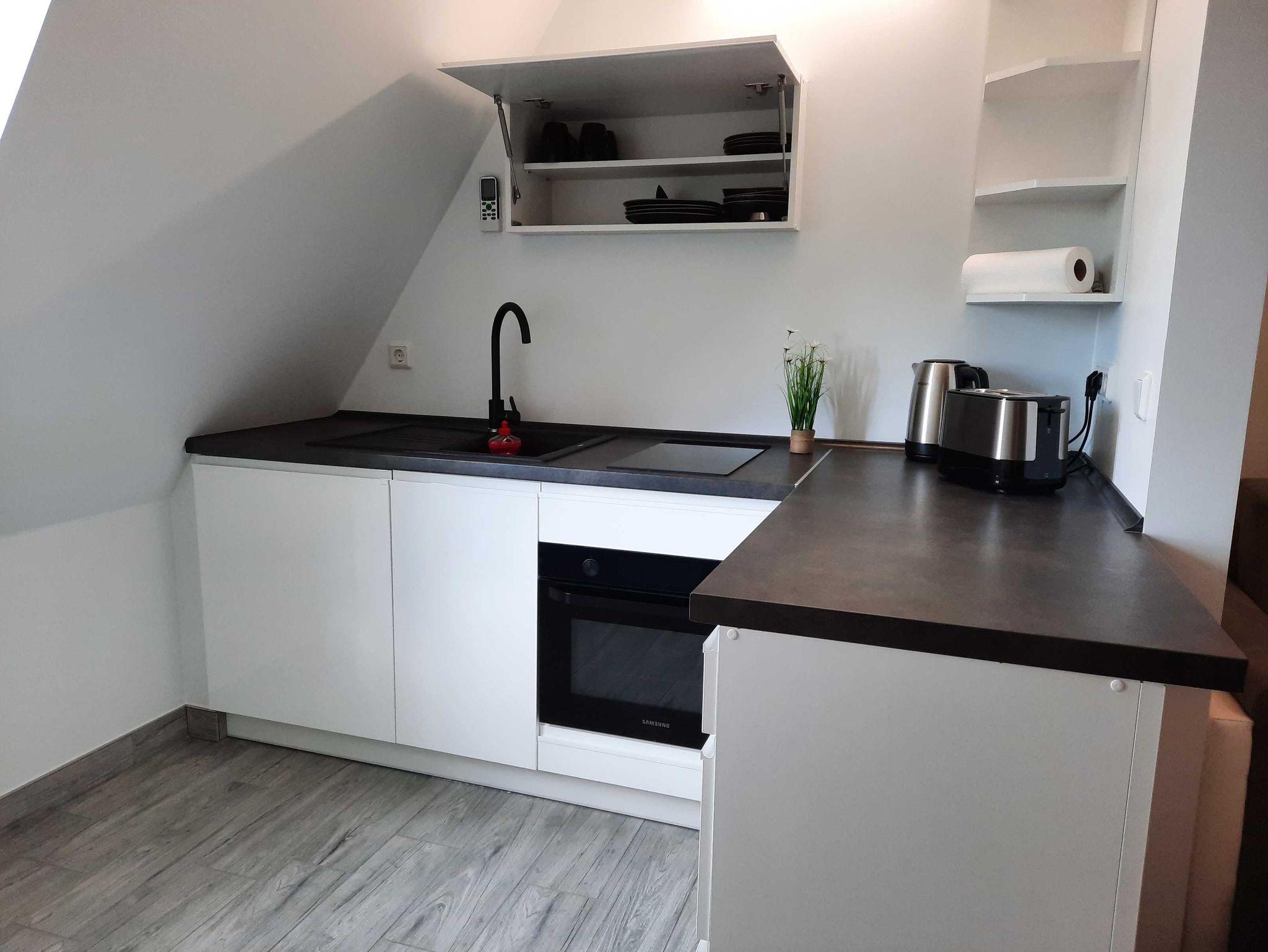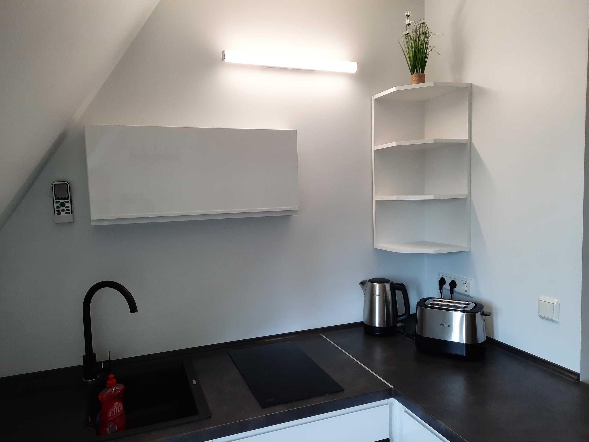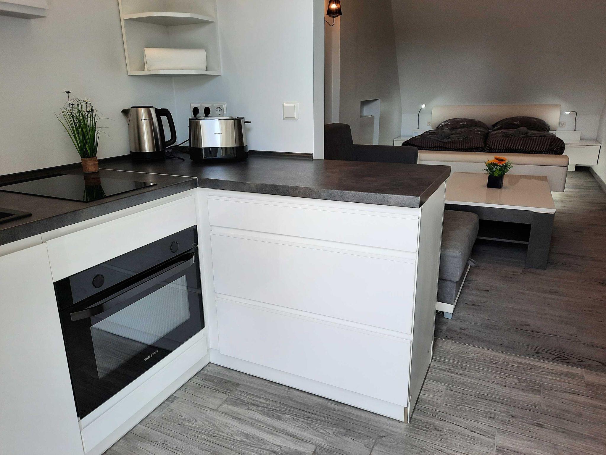 Die Ausstattung ist modern und zweckmäßig. Der kombinierte Wohn-Schlafraum mit einem Doppelbett (1.80x2.00) und einer Schlafcoch (2 Aufbettungen max. möglich) ist klimatisiert und hat eine offene Einbauküche mit Backofen, Mikrowelle, Kühlschrank mit integrietem Gefrierfach und Cerankochfeld.