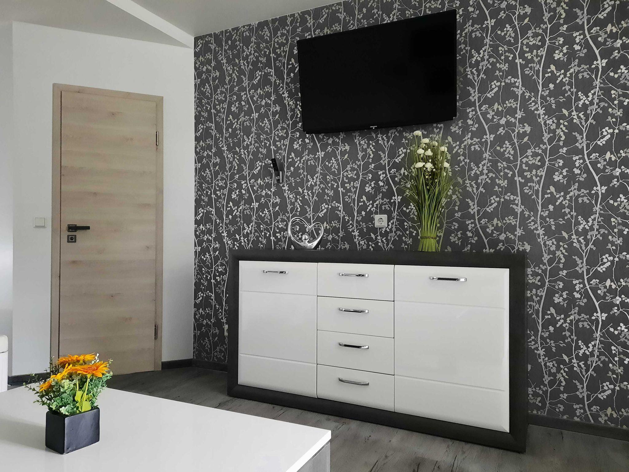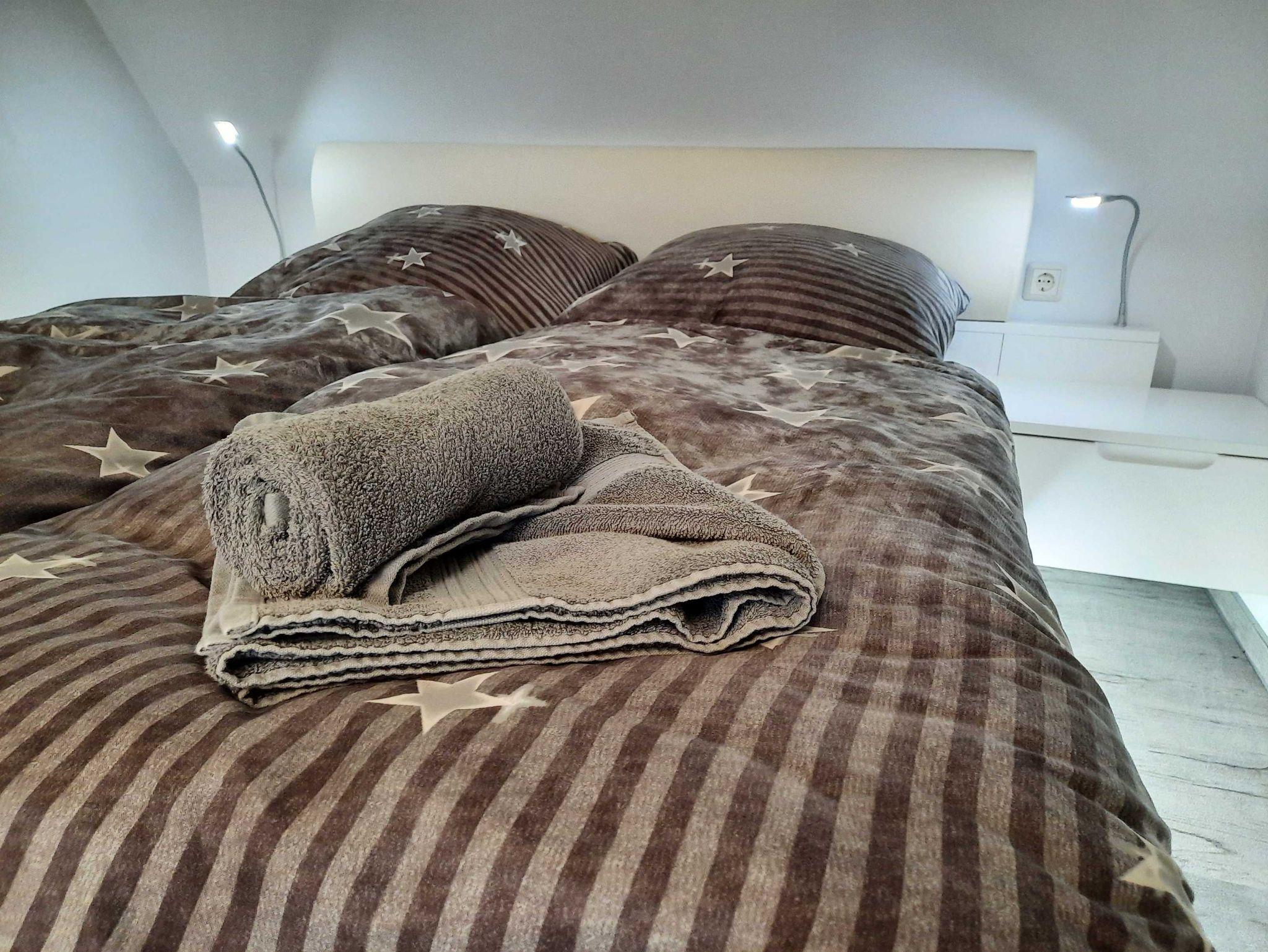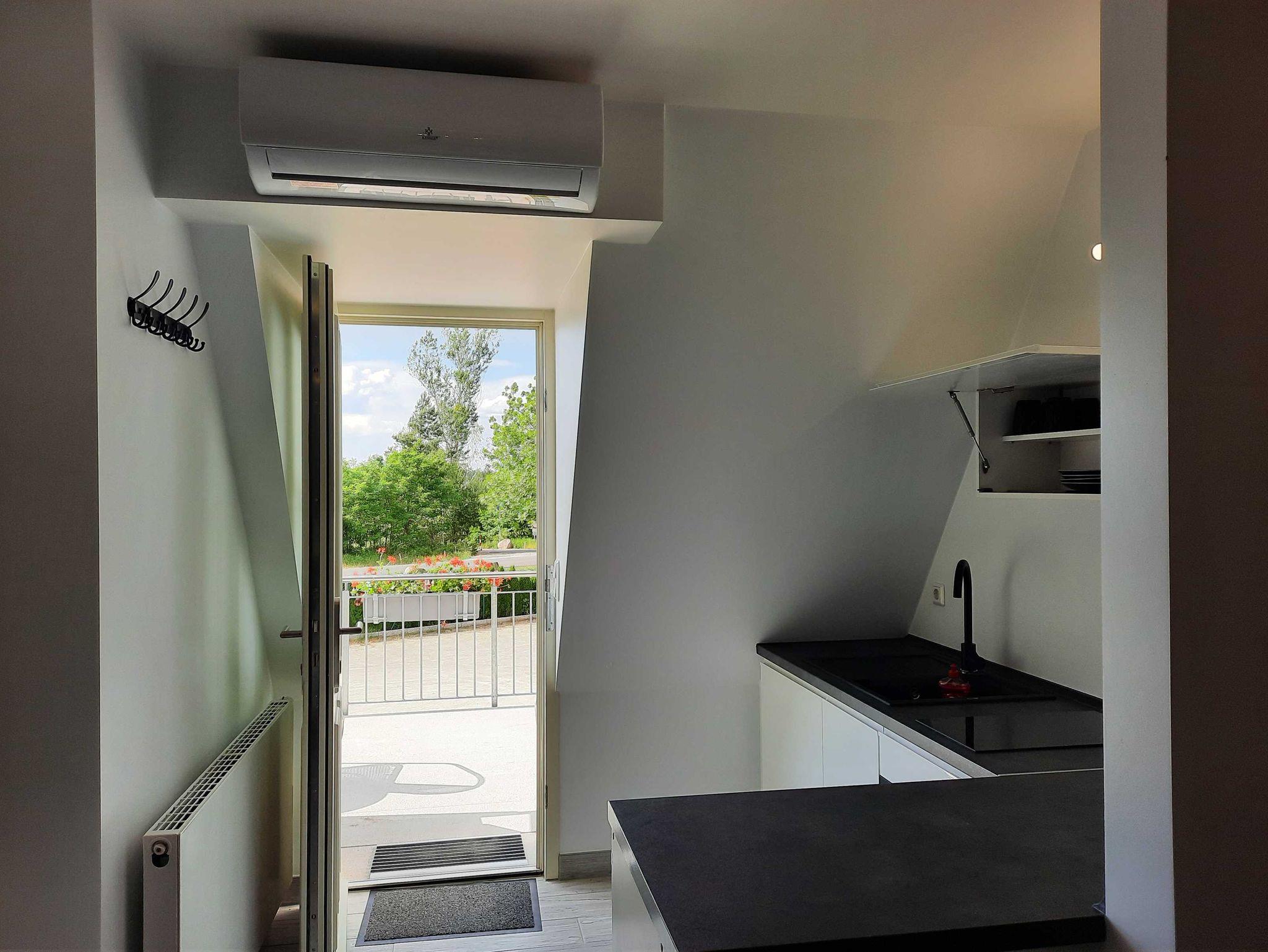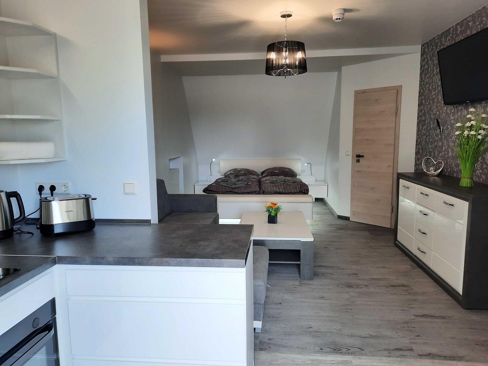 Die Ausstattung ist modern und zweckmäßig. Der kombinierte Wohn-Schlafraum mit einem Doppelbett (1.80x2.00) und einer Schlafcoch (2 Aufbettungen max. möglich) ist klimatisiert und hat eine offene Einbauküche mit Backofen, Mikrowelle, Kühlschrank mit integrietem Gefrierfach und Cerankochfeld.