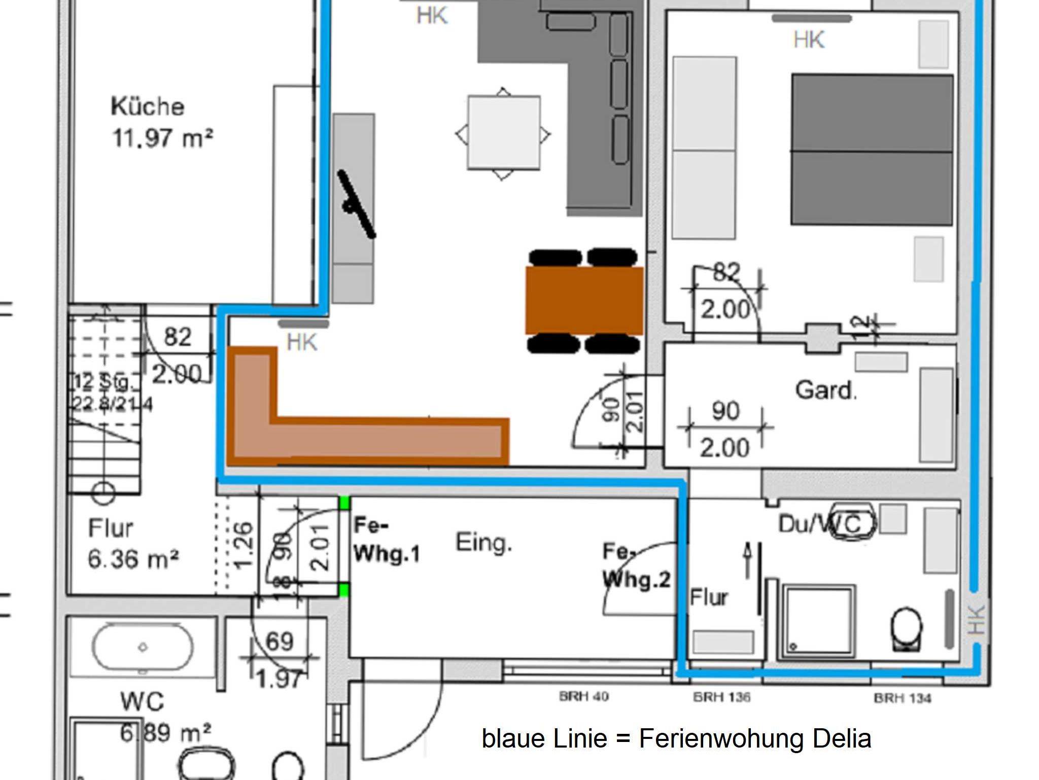 Im Feriendomiziel befindet sich die Ferienwohnung Delia mit einer Größe von ca. 52 m². Sie verfügt über ein Schlafzimmer mit Doppelbett (auch als Einzelbetten stellbar), eine offene Küche mit Wohnzimmer und ein Tageslichtbad mit Dusche. Sie ist ideal für 2 Personen geeignet. Aufbettungen sind jedoch möglich.
