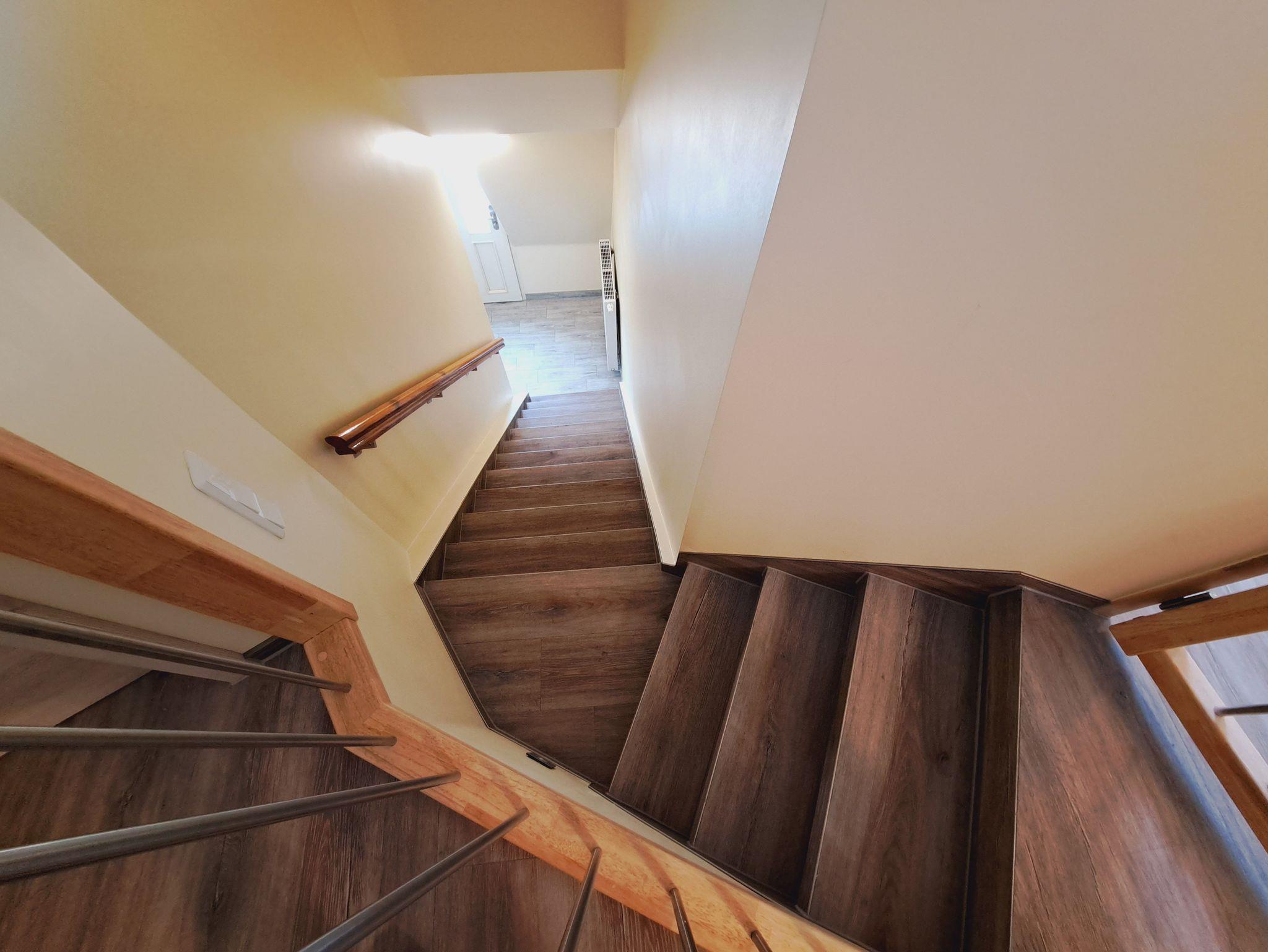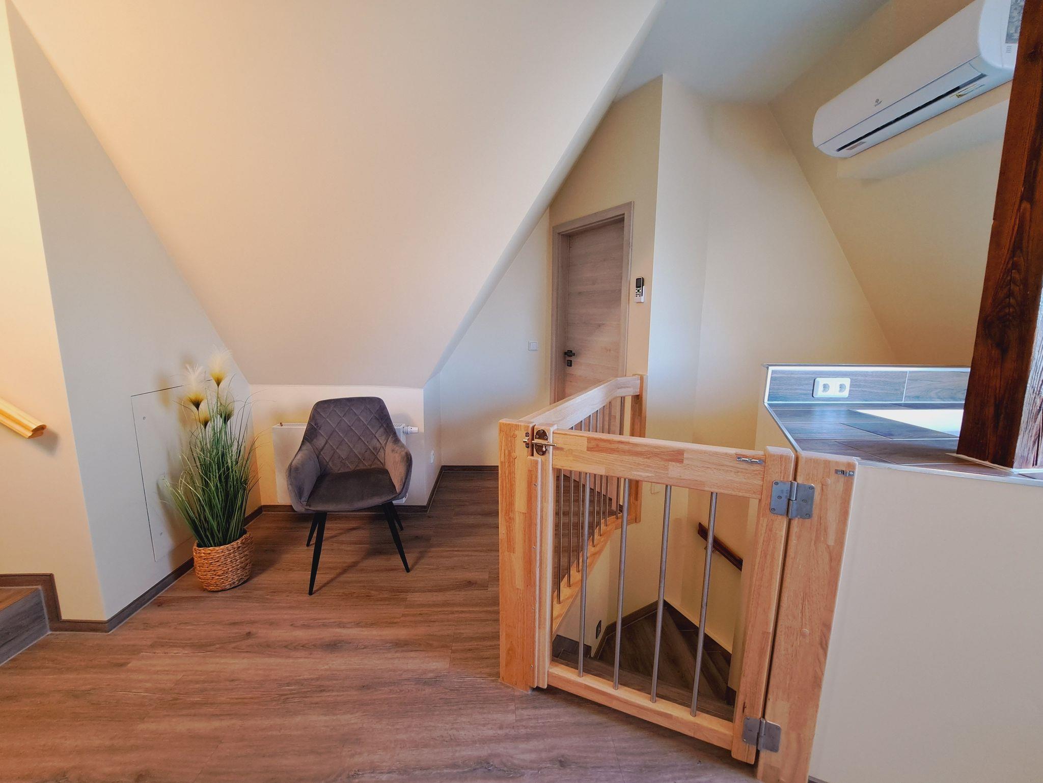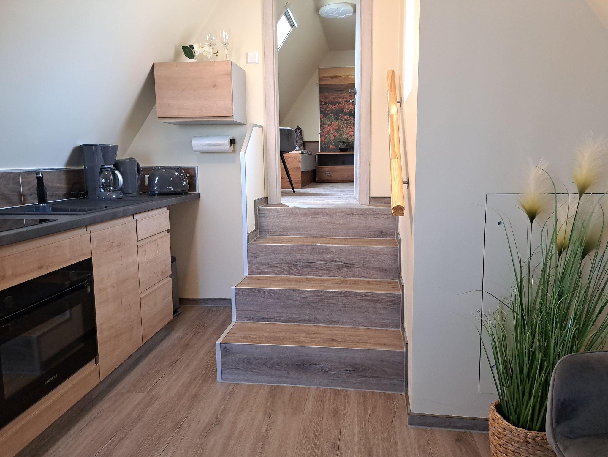 Zum Appartment gelangt man über eine Außentreppe oder bequem mit dem Aufzug. Im Appartment kommt man über eine Treppe zu den Räumlichkeiten.