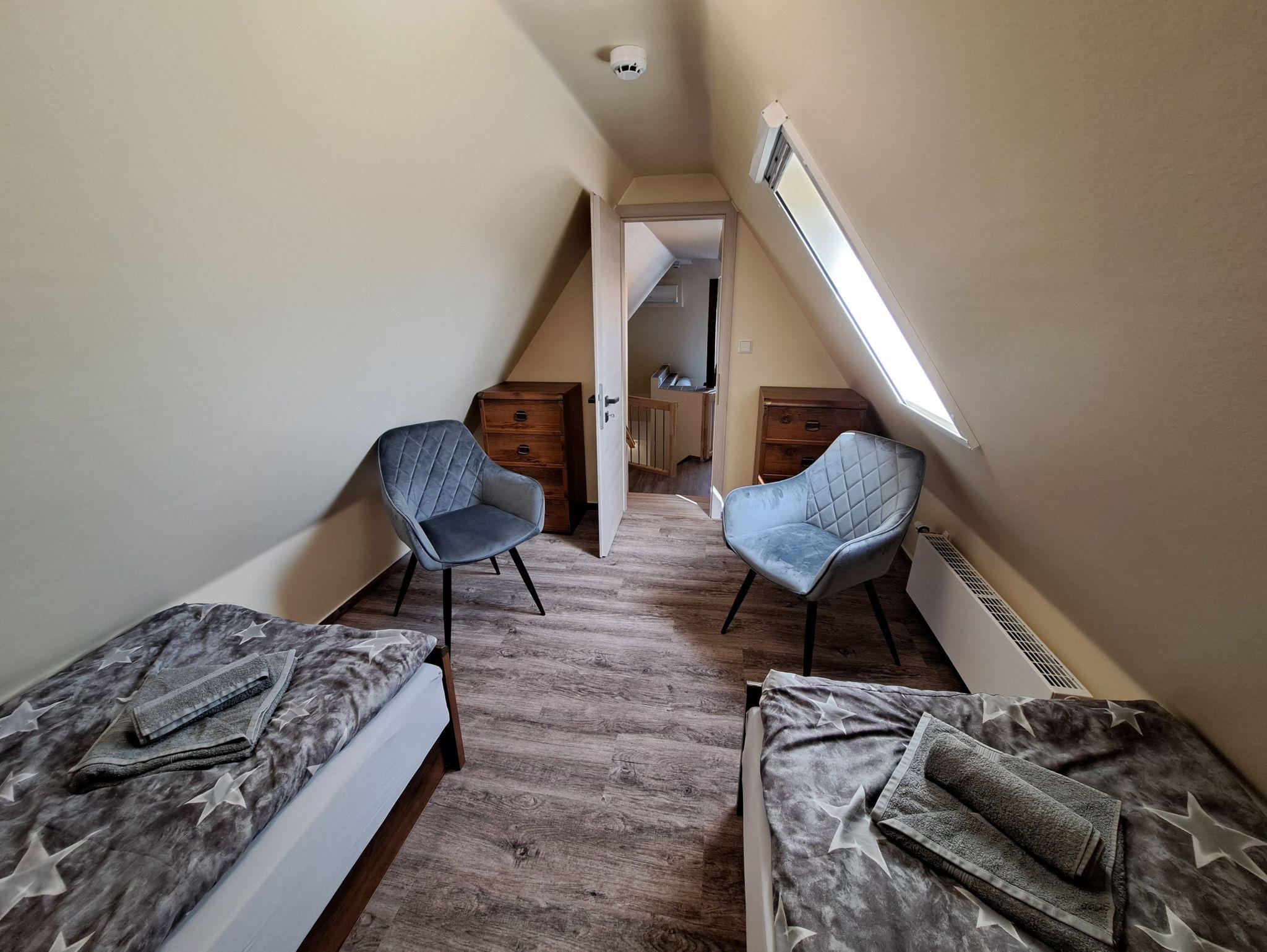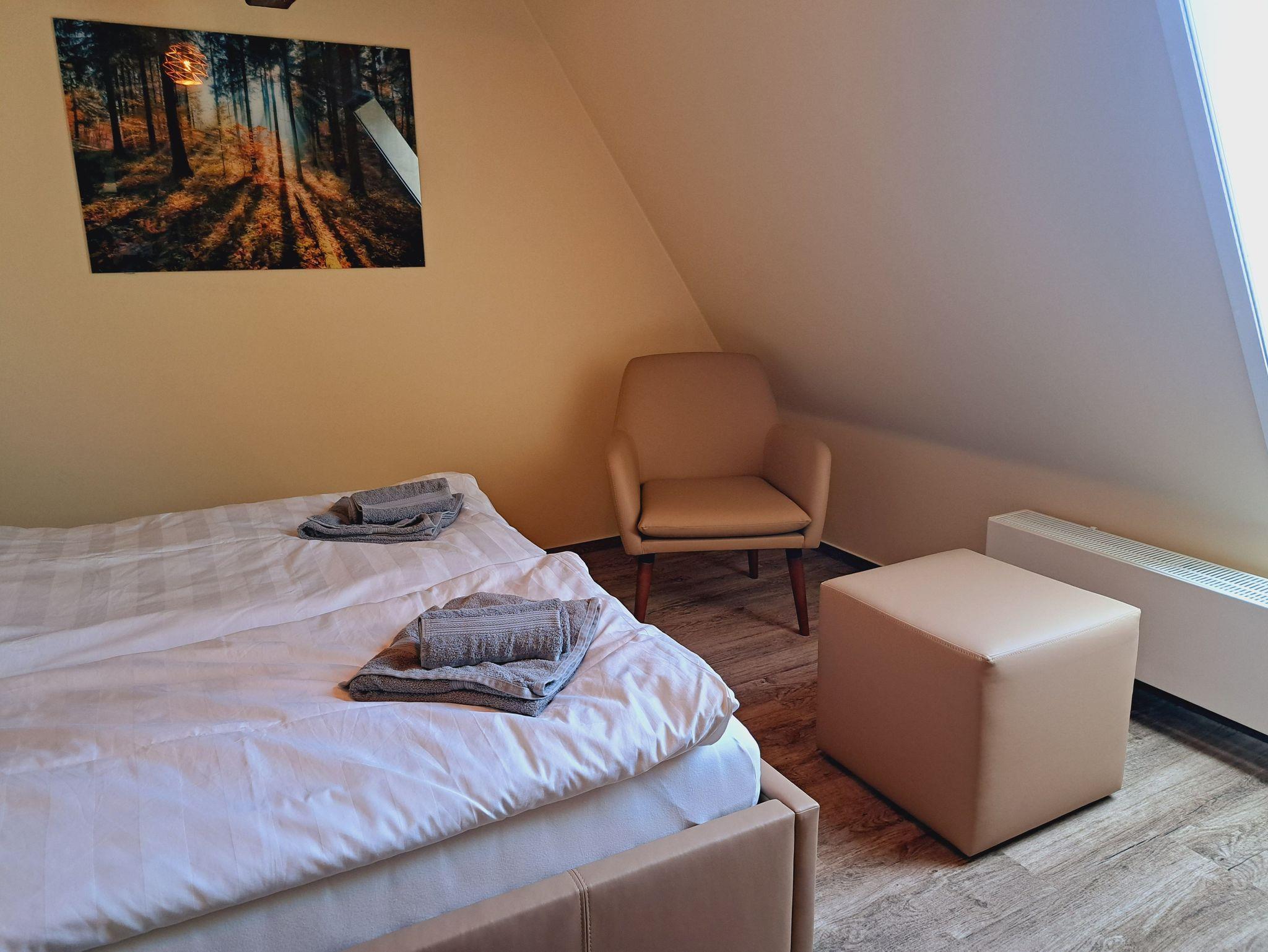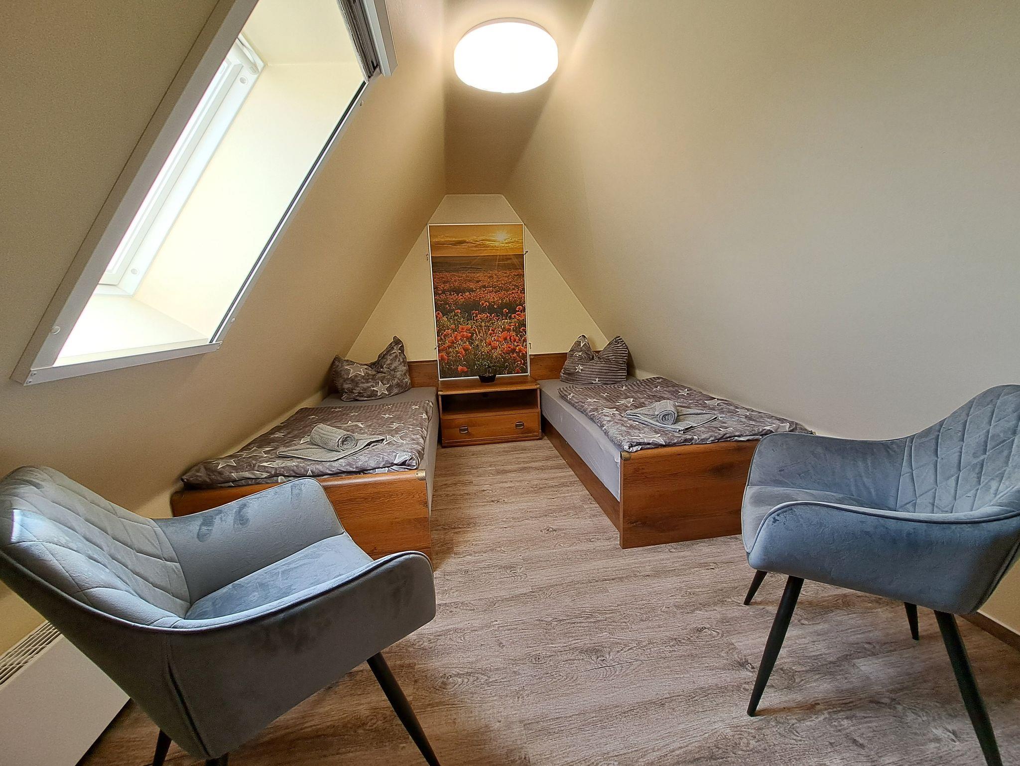 • Im Aussenbereich finden die Gäste einen Spielplatz, Sitzmöglichenkeiten zum Erholen und Entspannen und Fahrradunterstellmöglichkeiten, eine Gemeinschaftsküche, ein Aufenthaltsraum sowie eine barrierefreie Dusche und WC sind vorhanden. Im Hauptgebäude befinden sich sechs Zimmer. Die Zimmer haben einen direkten Zugang über eine Treppe im Innenbereich des Gebäudes. Jedes Zimmer hat ein eigenes Bad mit DU/WC, direkt gegenüberliegend. Im Objekt gibt es eine Gemeinschaftssauna (buchbar vor Ort gegen Aufpreis). Im Zimmer sieben ist das Bad über eine Außentreppe erreichbar.