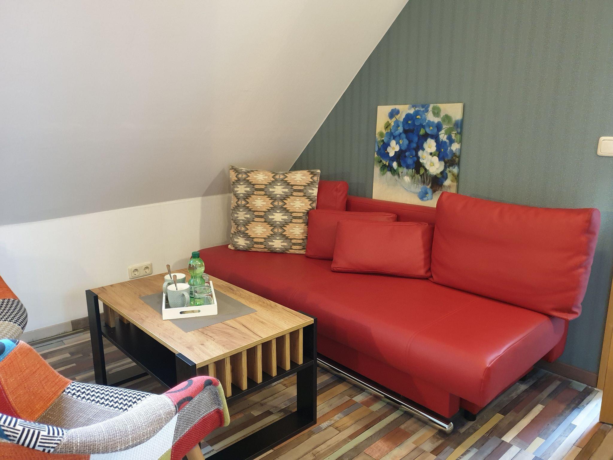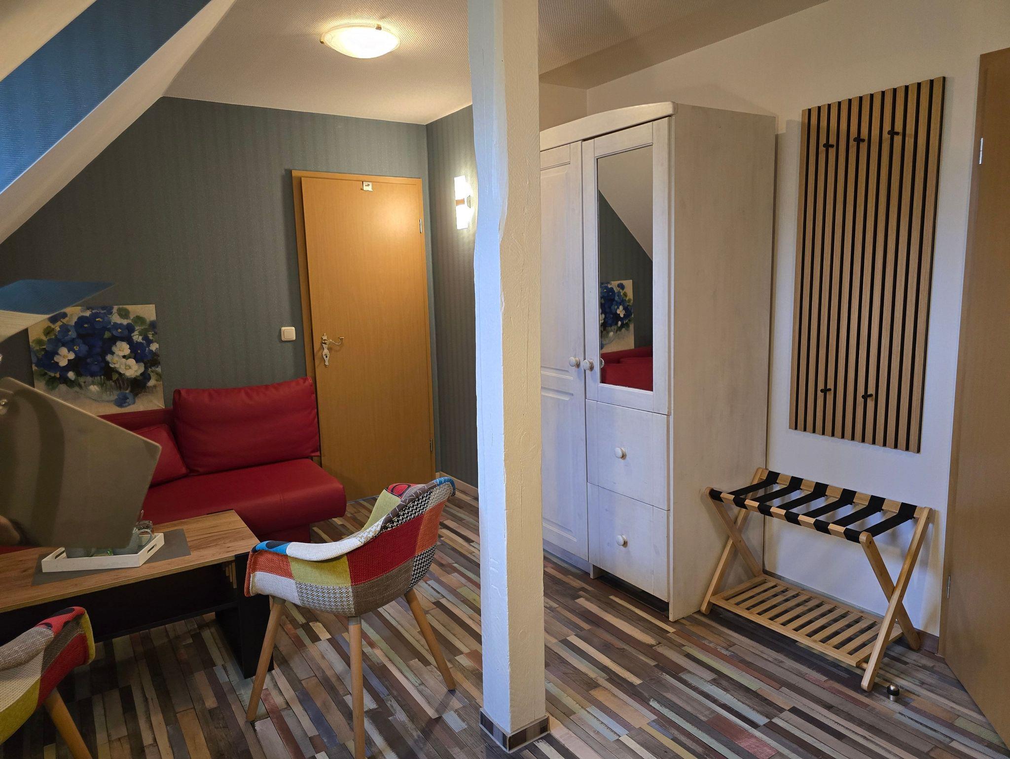 Eine Ferienwohnung ist mit einem separatem Schlafraum, einem Wohn-Schlafraum, einer Küche offen zum Wohnzimmer und einem Bad mit Badewanne, DU-WC, TV ausgestattet. Die Ferienwohnung befindet sich im 1. Stock.