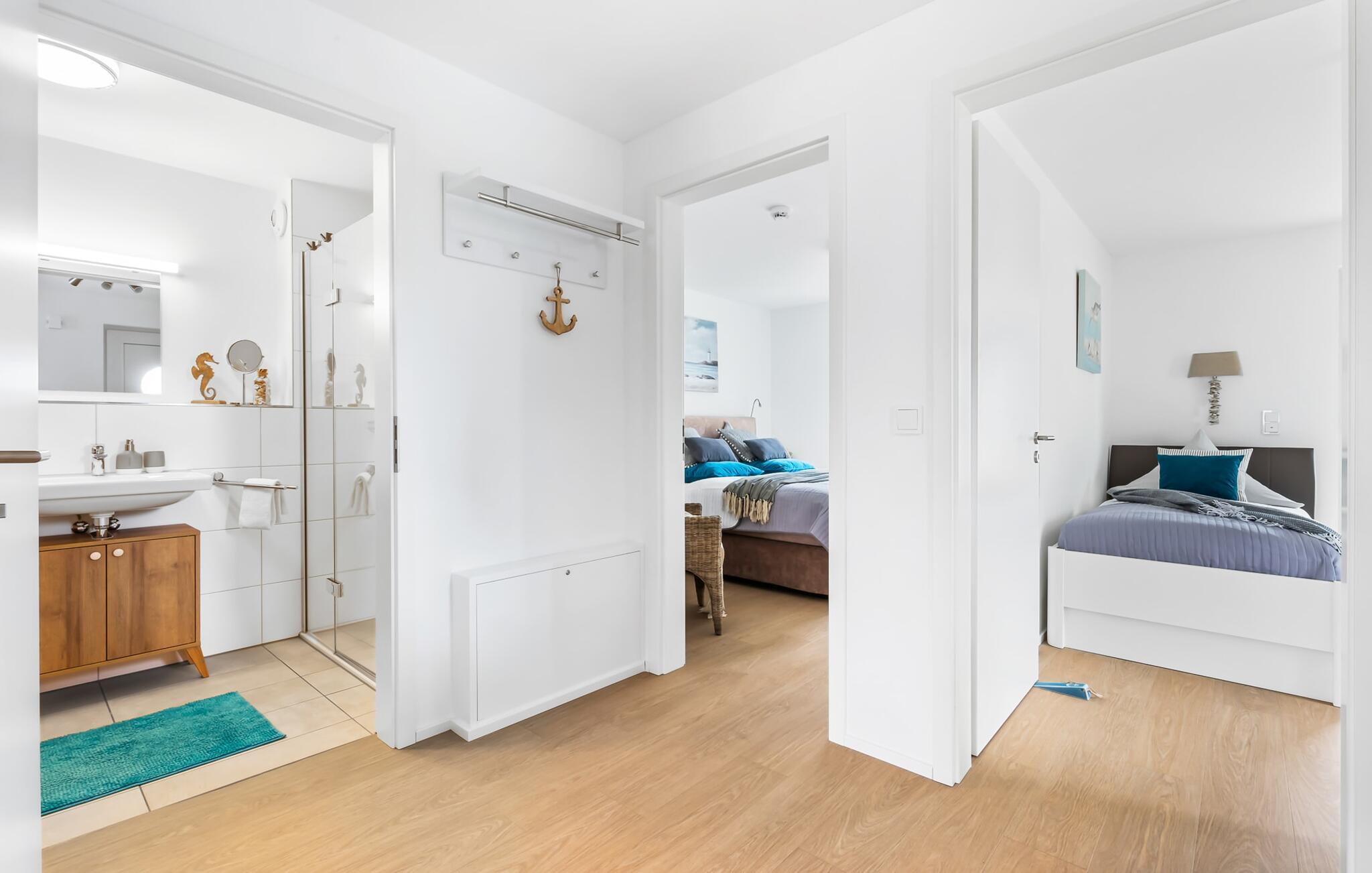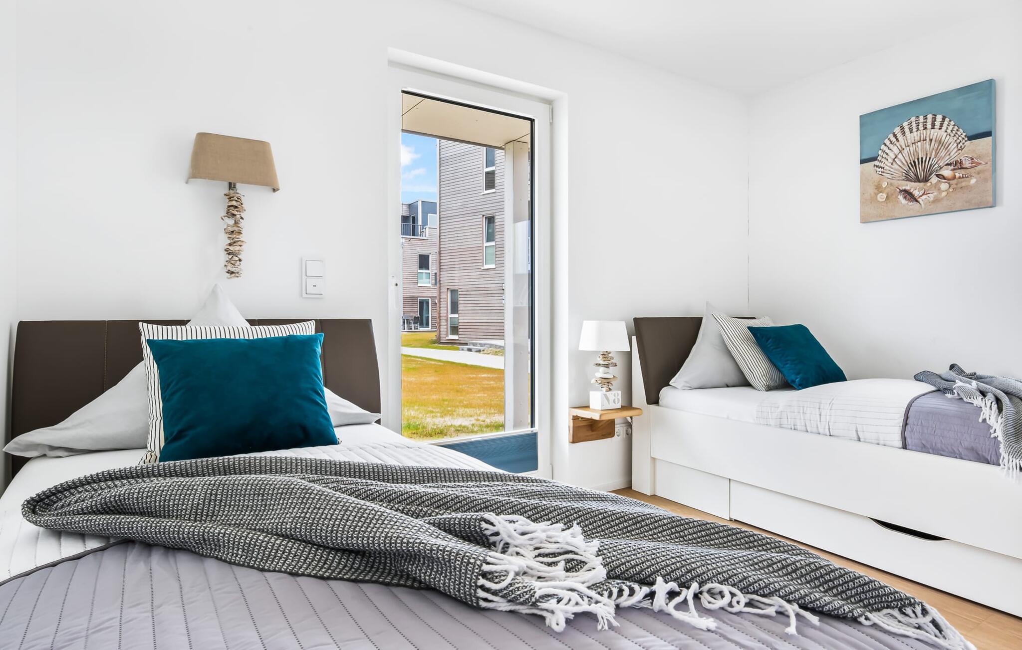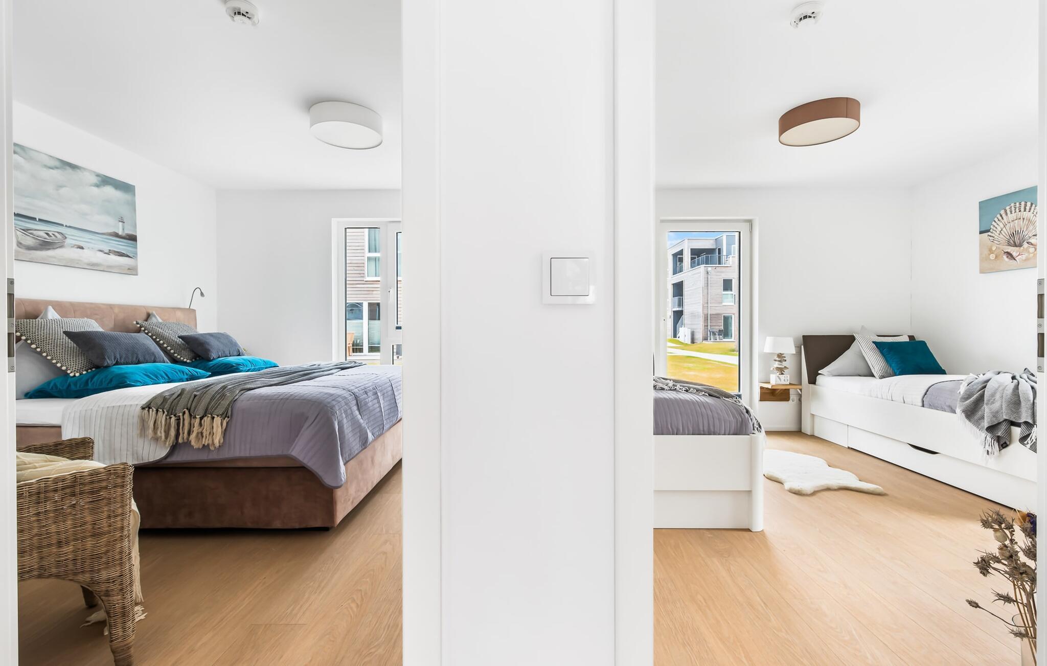Für die nächtliche Erholung stehen zwei Schlafzimmer mit komfortablen Betten bereit. Das erste Schlafzimmer lädt mit einem Doppelboxspringbett zu erholsamen Nächten ein. Das zweite Schlafzimmer ist mit zwei großen (2 x 1 m) Einzelbetten ausgestattet und verfügt über eine kleine, überdachte Terrasse und für Schietwetter liegen Spiele bereit. Der Hafen ist von beiden Schlafzimmern in Blickweite und regt die Fantasie für Outdoor Unternehmungen an.