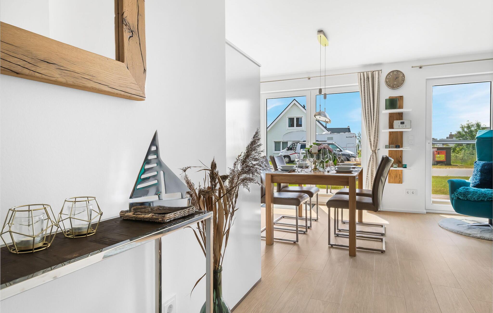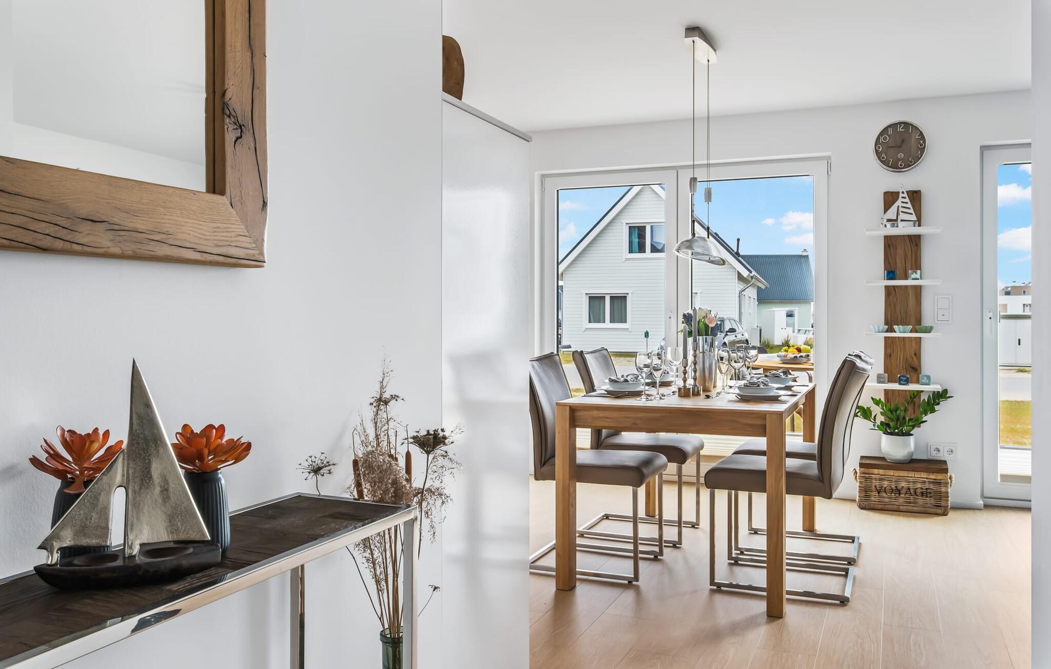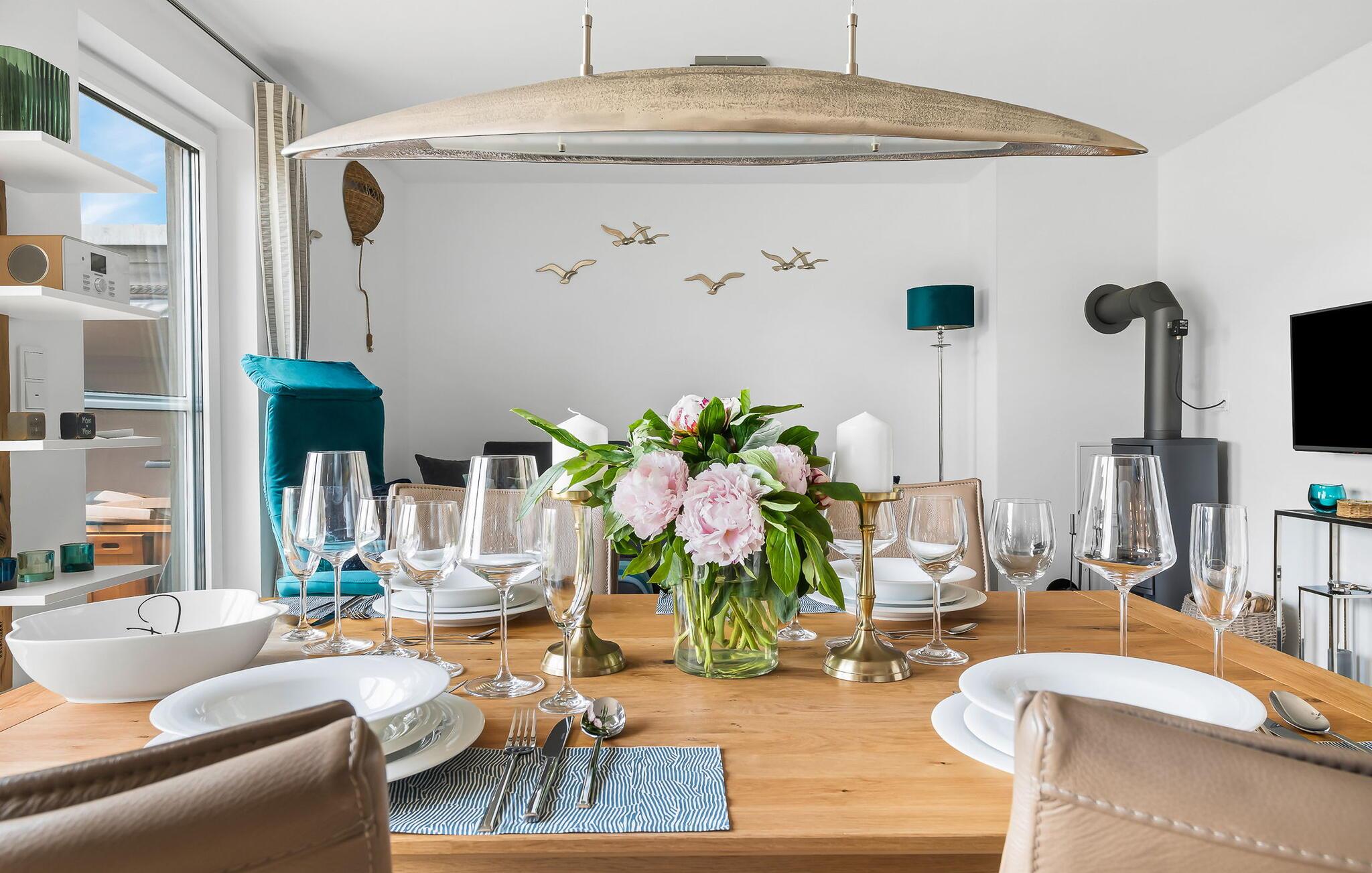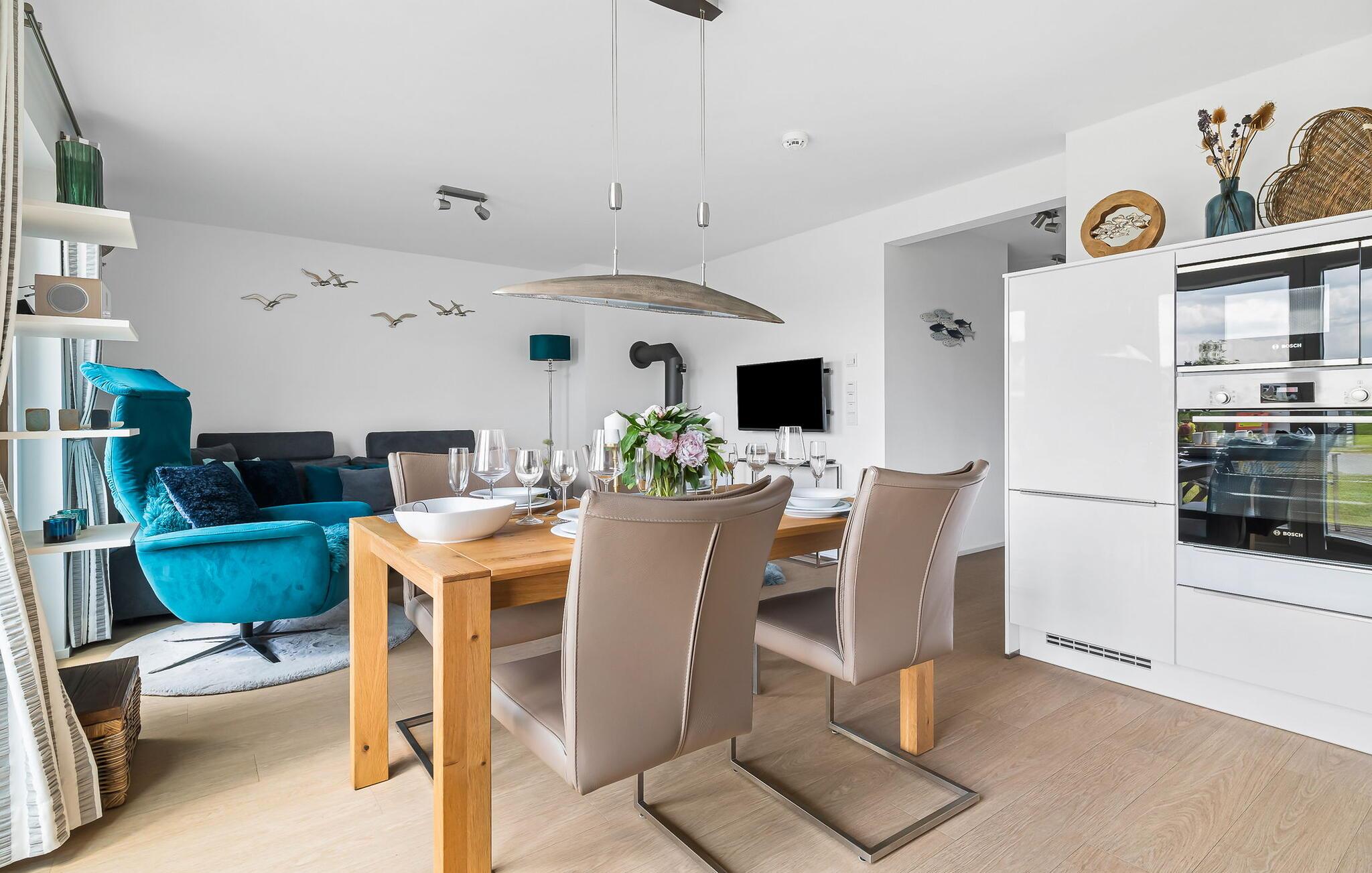 Eintreten und sich sofort Zuhause fühlen! Mit seiner bodentiefen Fensterfront und der angrenzenden großen Terrasse ist der offene Wohn-/Essbereich das Herz der Wohnung. Auf der Wohnlandschaft mit Kuschelfaktor zu entspannen, aus dem Fenster die Ruhe der Natur genießen oder fernsehen ist Entspannung und Erholung pur! SEUTEN DEERN lässt den Alltag immer mehr entrücken... Einige Gegenstände der Einrichtung sind aus recyceltem Holz aus der Förde gefertigt und holen maritime Stimmung direkt in die Wohnung. Sollte das Wetter sich einmal von der nordischen Seite zeigen, sorgt der Kaminofen mit seinem prasselnden Feuer für weitere Behaglichkeit.