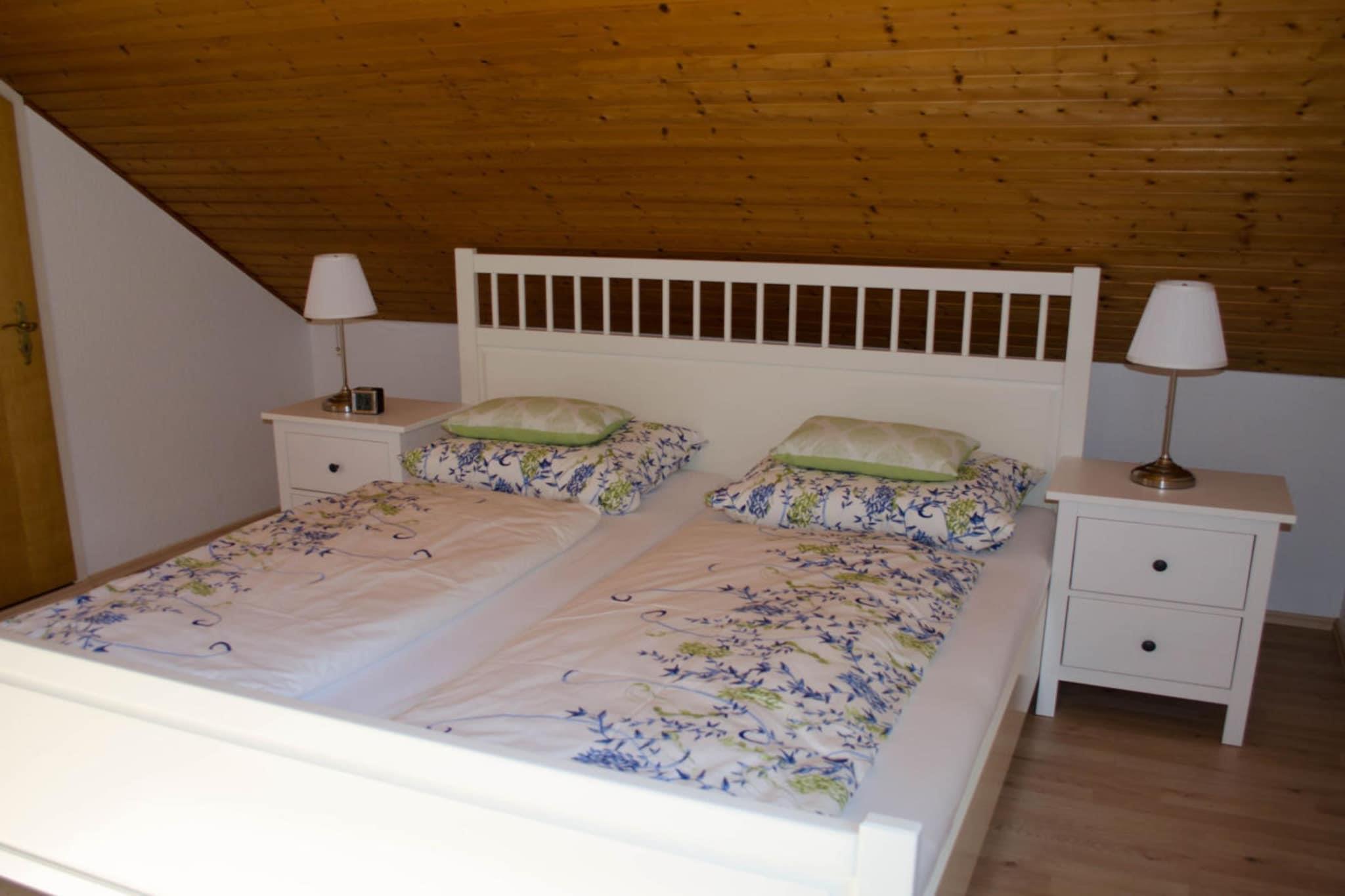 Charmant und naturnah: das ist unsere Ferienwohnung. Die ca. 100 m² große, modern eingerichtete, gemütliche Wohnung befindet sich im Obergeschoß eines Einfamilienhauses und bietet bis zu sechs Personen genügend Raum zum Wohlfühlen. Die Wohnung verfügt über eine komplett eingerichtete Küche, drei Schlafzimmer mit Doppelbett, einem Wohnraum mit Esstisch, Couch und TV und 2 Bäder, eins mit Dusche, eins mit Badewanne und einer separaten Dusche. SAT-TV, Fön, Handtücher und Bettwäsche sind vorhanden. Ein Grill steht bei Bedarf zur Verfügung. Im angrenzenden Garten befinden sich eine Sonnenterasse und ein Schwimmbad mit Liegewiese, dass Sie jederzeit gerne nutzen können. Parkmöglichkeiten am Haus sind ausreichend vorhanden. Für Fahrräder haben wir einen abgeschlossenen Raum mit Lademöglichkeit für E-Bikes.