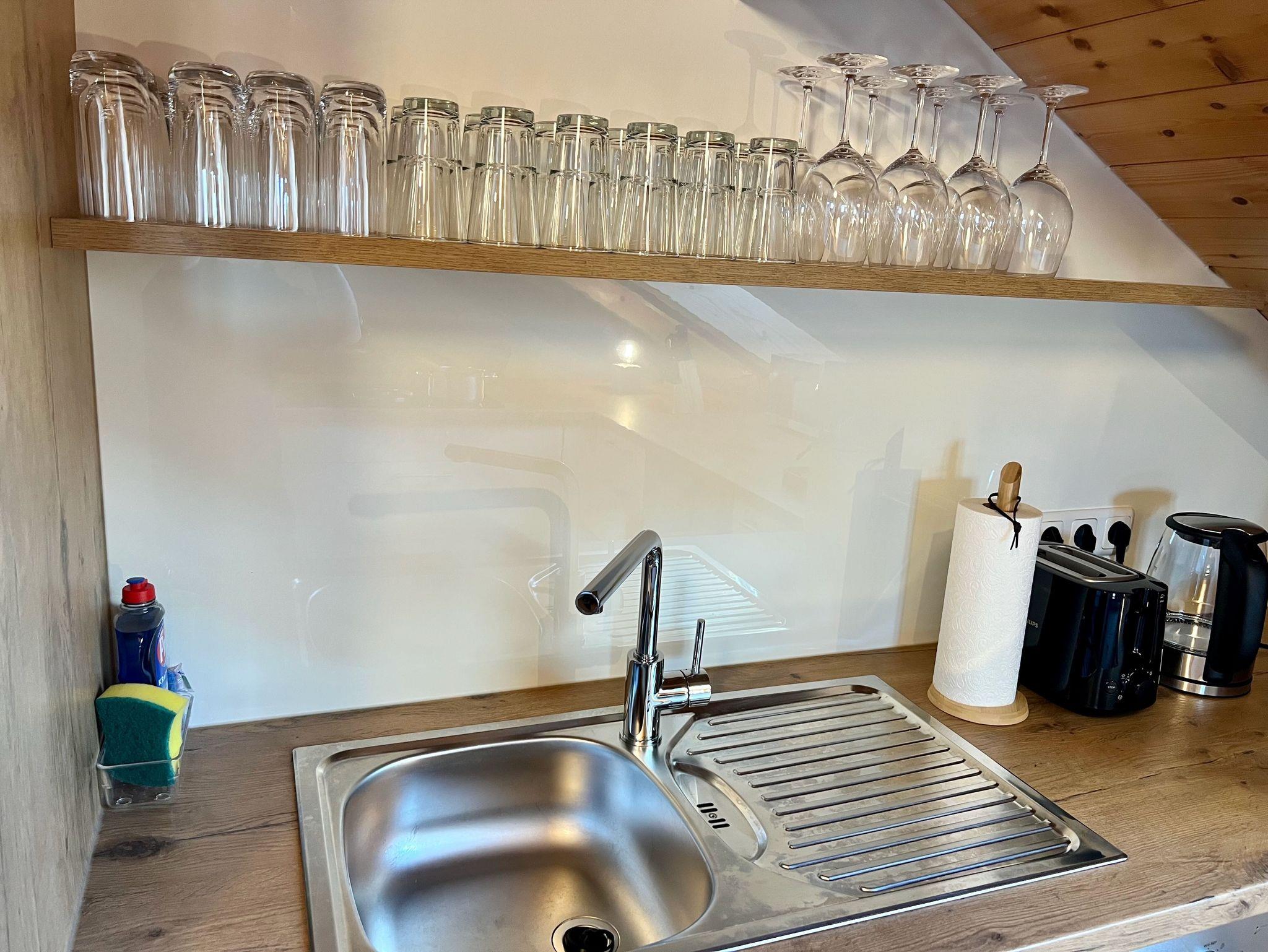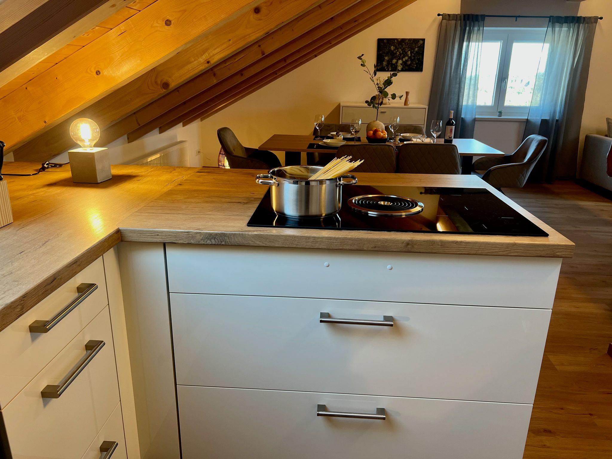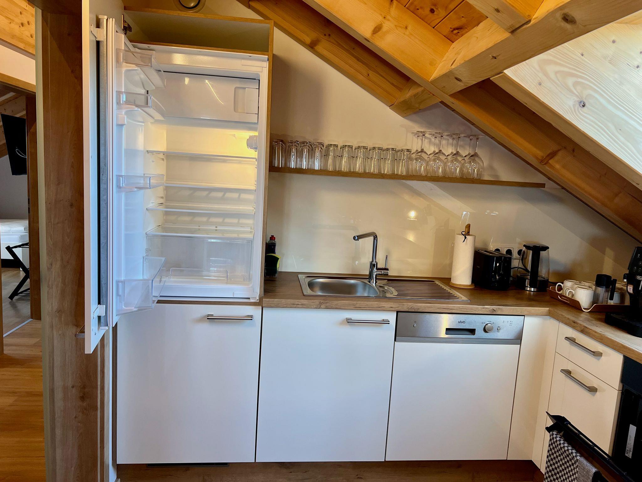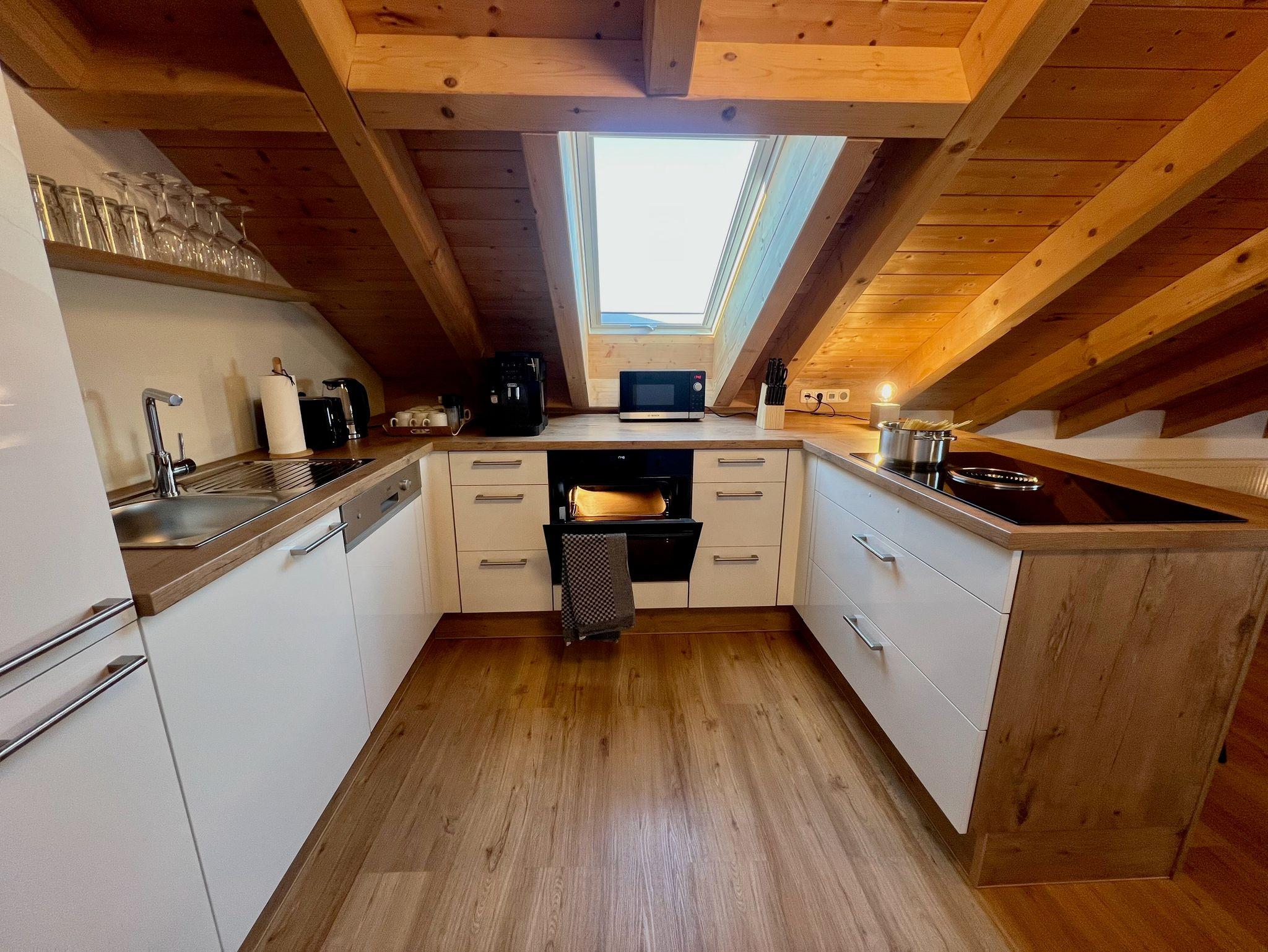 Die moderne, offene Küche, erreichbar sowohl vom Flur als auch vom Wohnzimmer, ist voll ausgestattet:?Kühlschrank mit Gefrierfach, Backofen, Mikrowelle, Geschirrspüler, Kochfeld, Kaffeevollautomat mit Milchschäumer, Wasserkocher, Toaster sowie zwei stilvolle Barhocker lassen keine Wünsche offen.