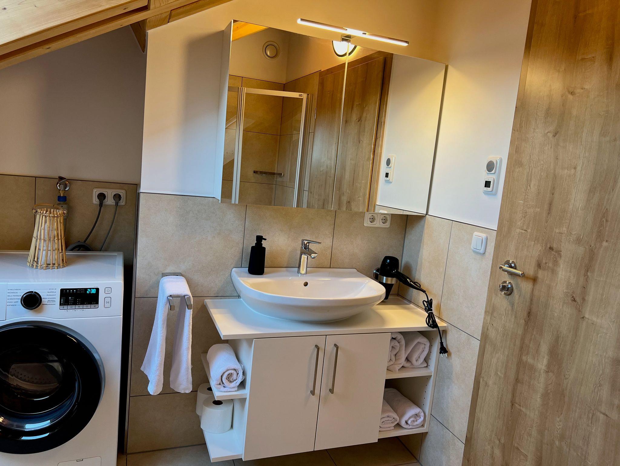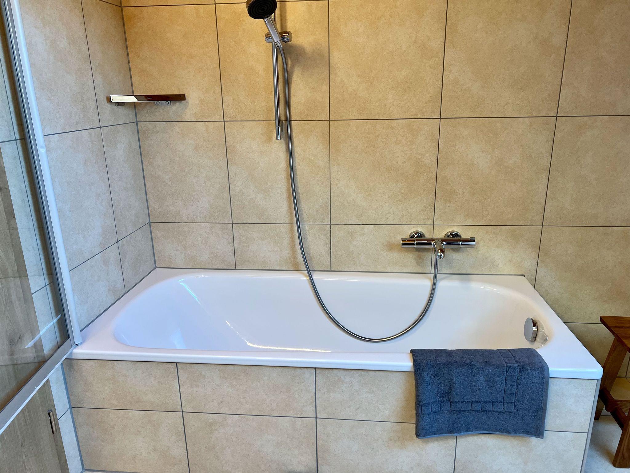 Im Badezimmer finden Sie eine große Badewanne mit Duschgelegenheit, WC, Haartrockner, Waschmaschine und Wäschetrockner. Frische Handtücher und Bettwäsche werden selbstverständlich bereitgestellt.