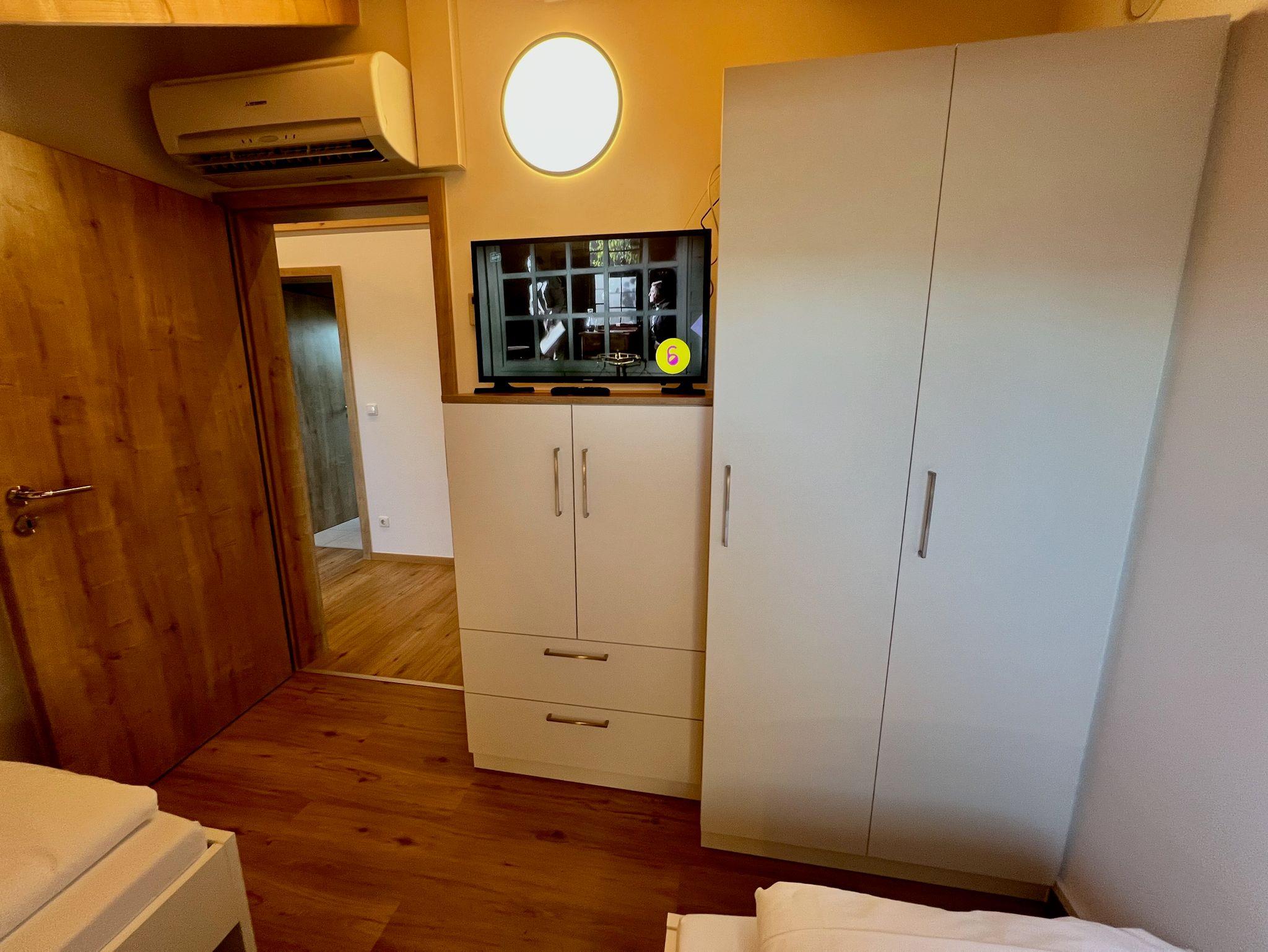Schlafzimmer 1 ist mit zwei Betten (je 100?×?200?cm, individuell stellbar), einem geräumigen Kleiderschrank, einer Kommode, einem Radiowecker sowie einem 43-Flachbild-TV und einer Klimaanlage ausgestattet.
