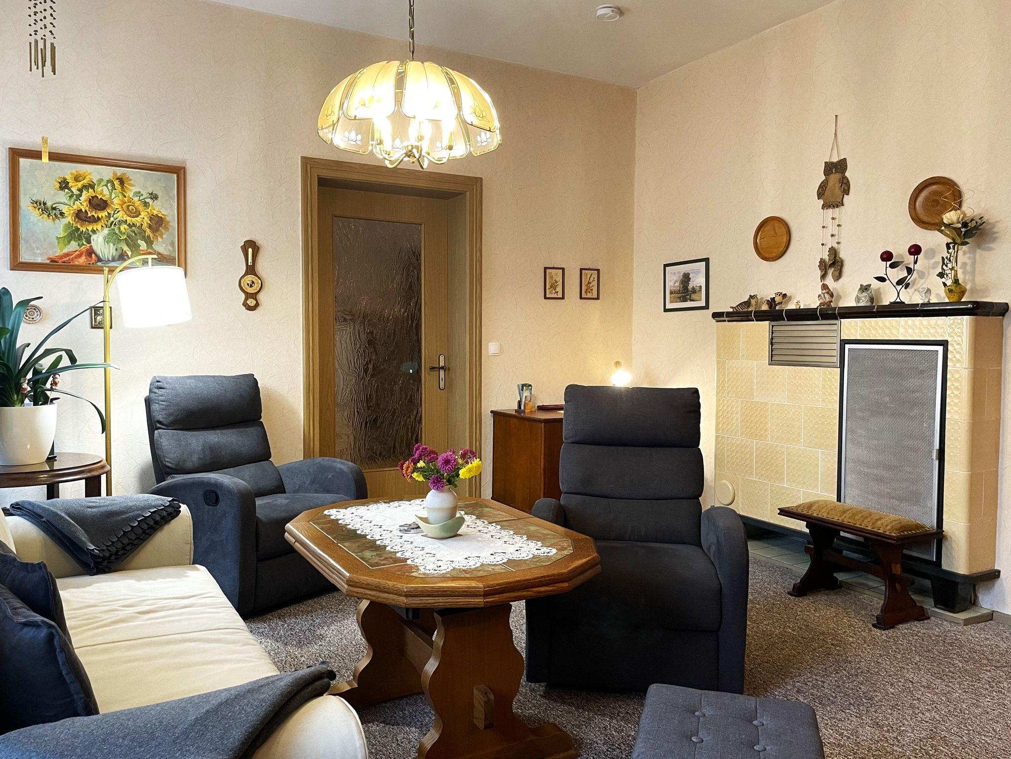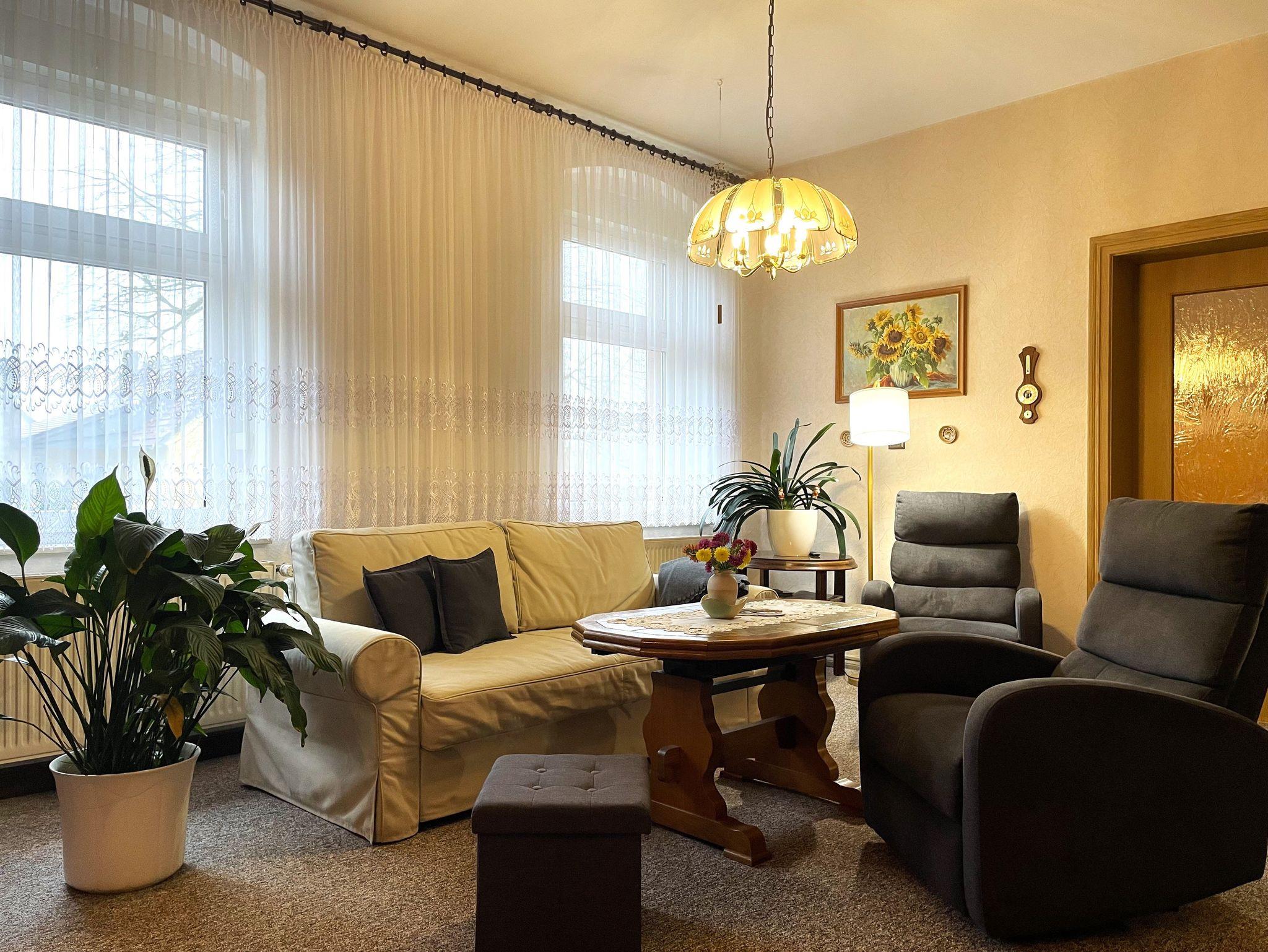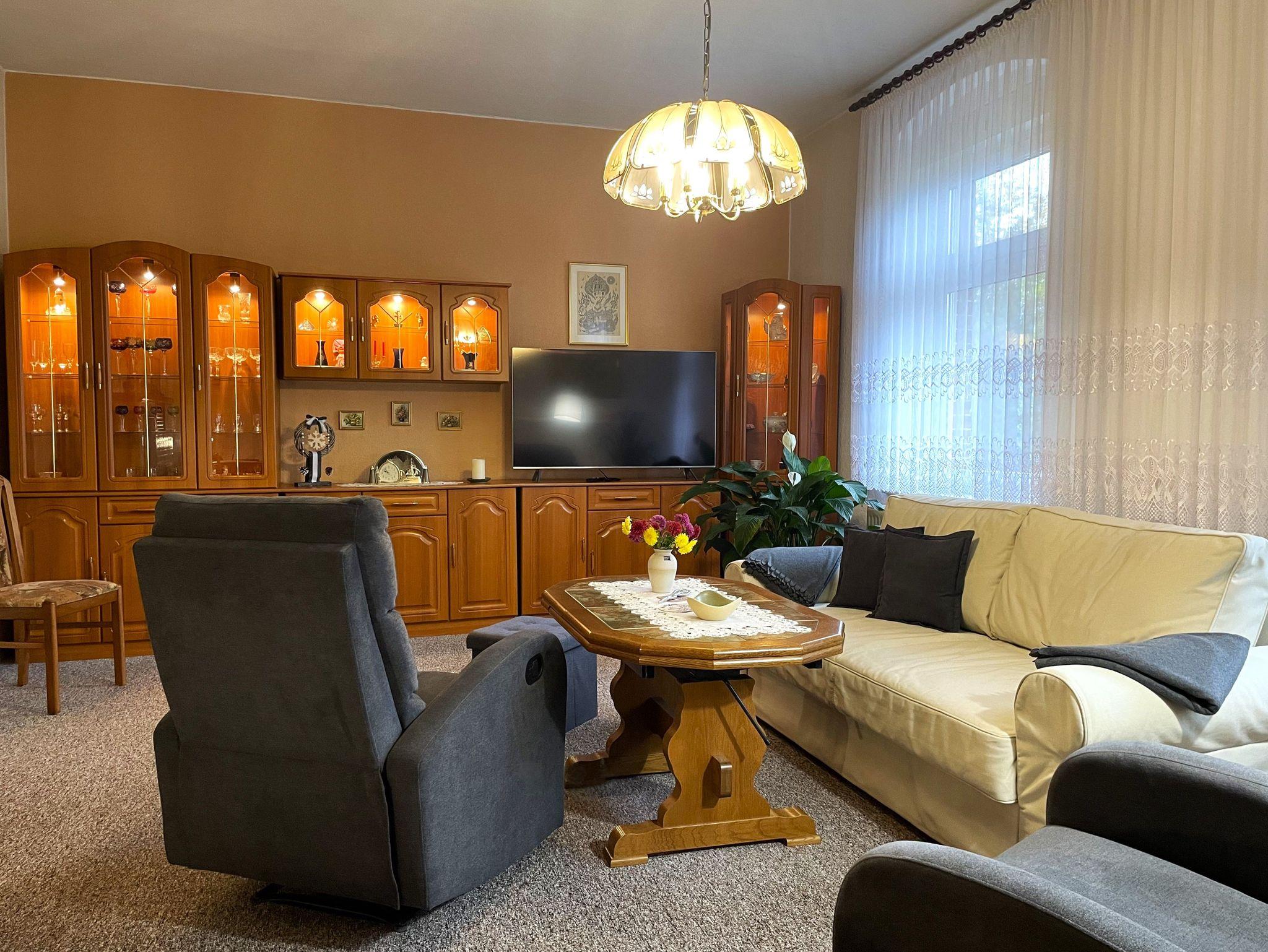 Die 90 m² große Nichtraucher-Ferienwohnung verfügt über ein großes Wohnzimmer. Hier können die Gäste gemütlich beisammen sitzen oder entspannt ihre Lieblingssendungen auf dem großen Flachbildfernseher anschauen. In diesem Raum befindet sich auch ein Schreibtisch, der an vergangene Zeiten des Hauses erinnert.