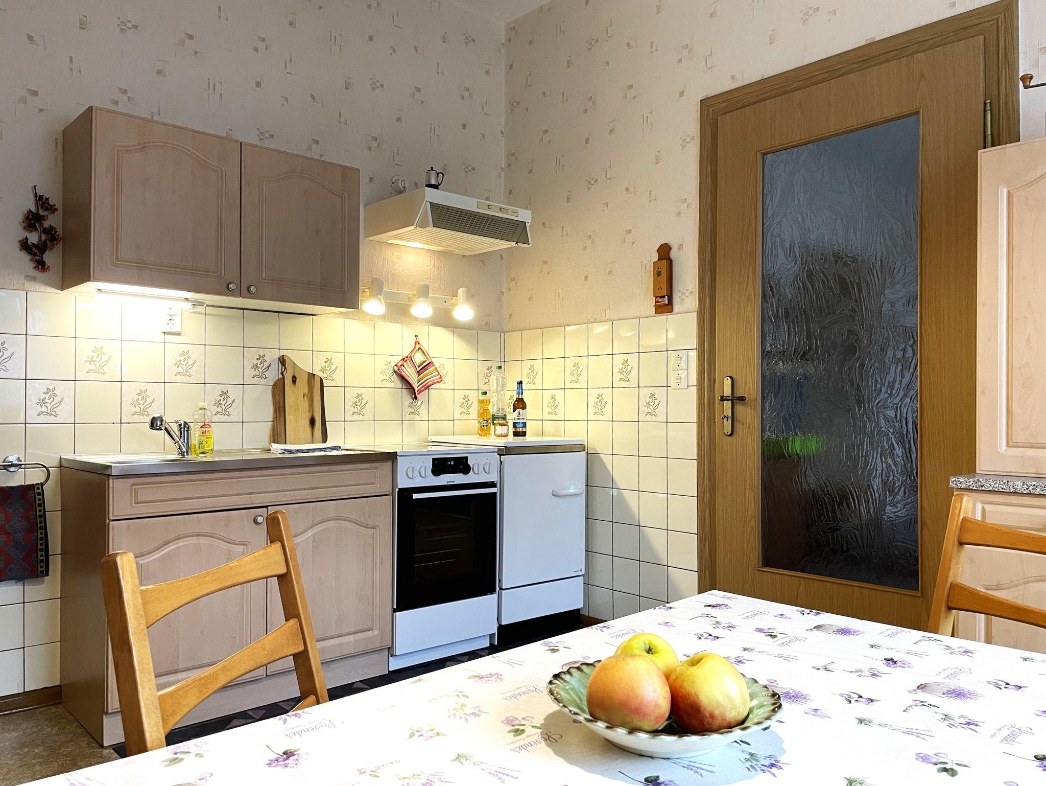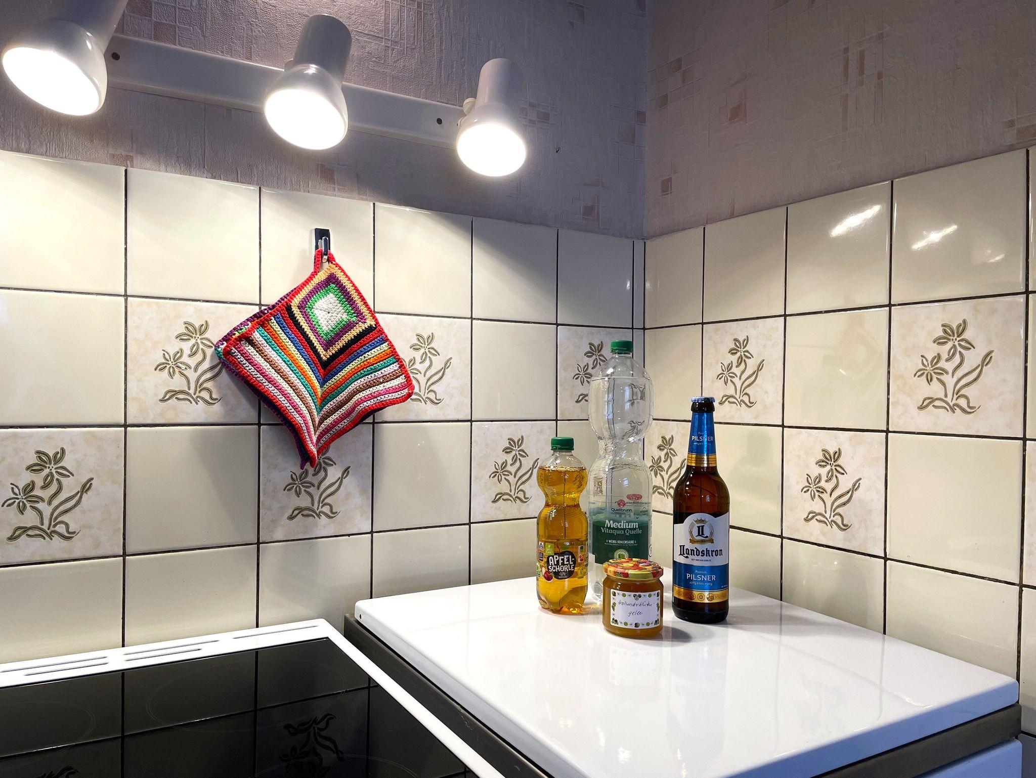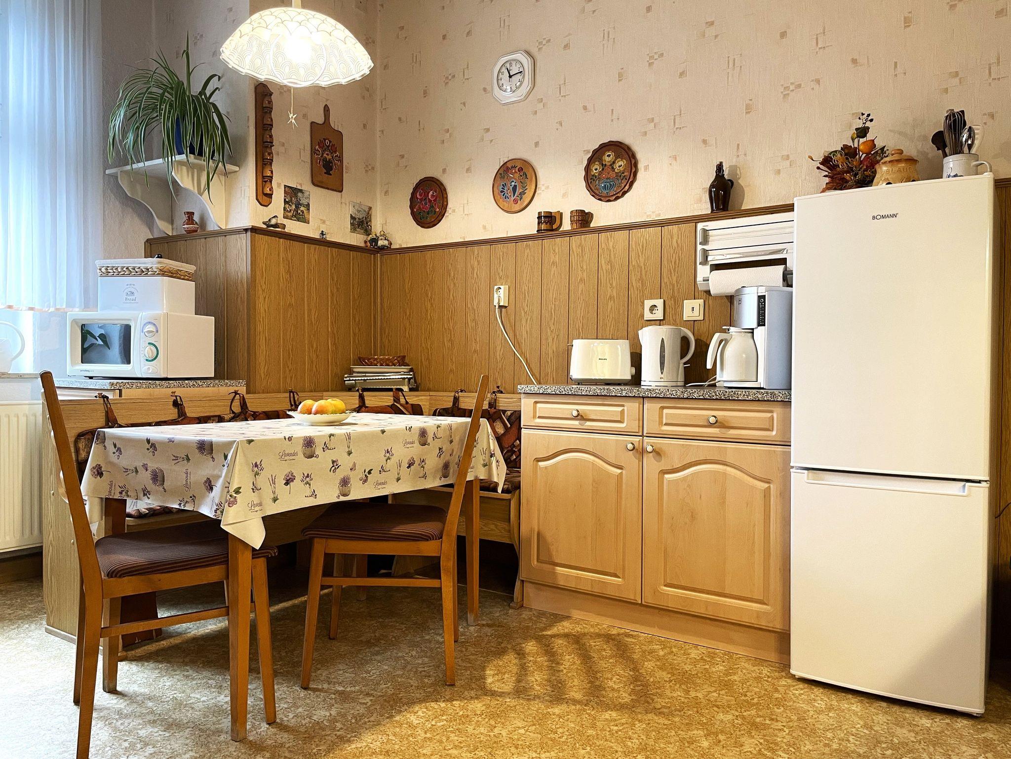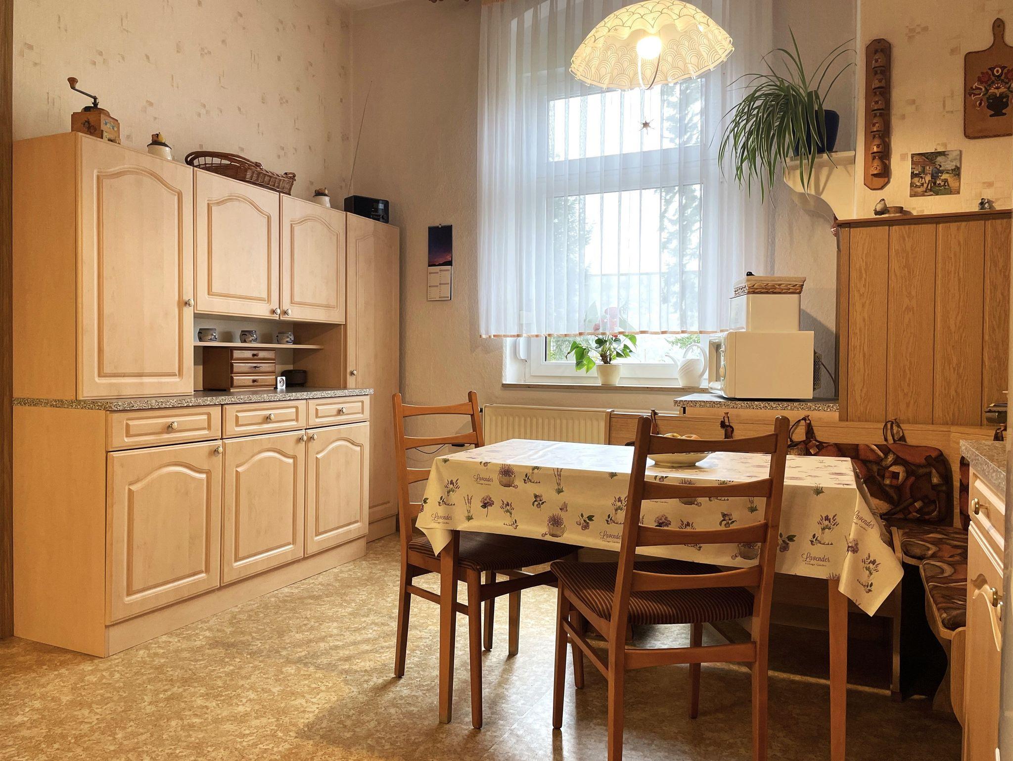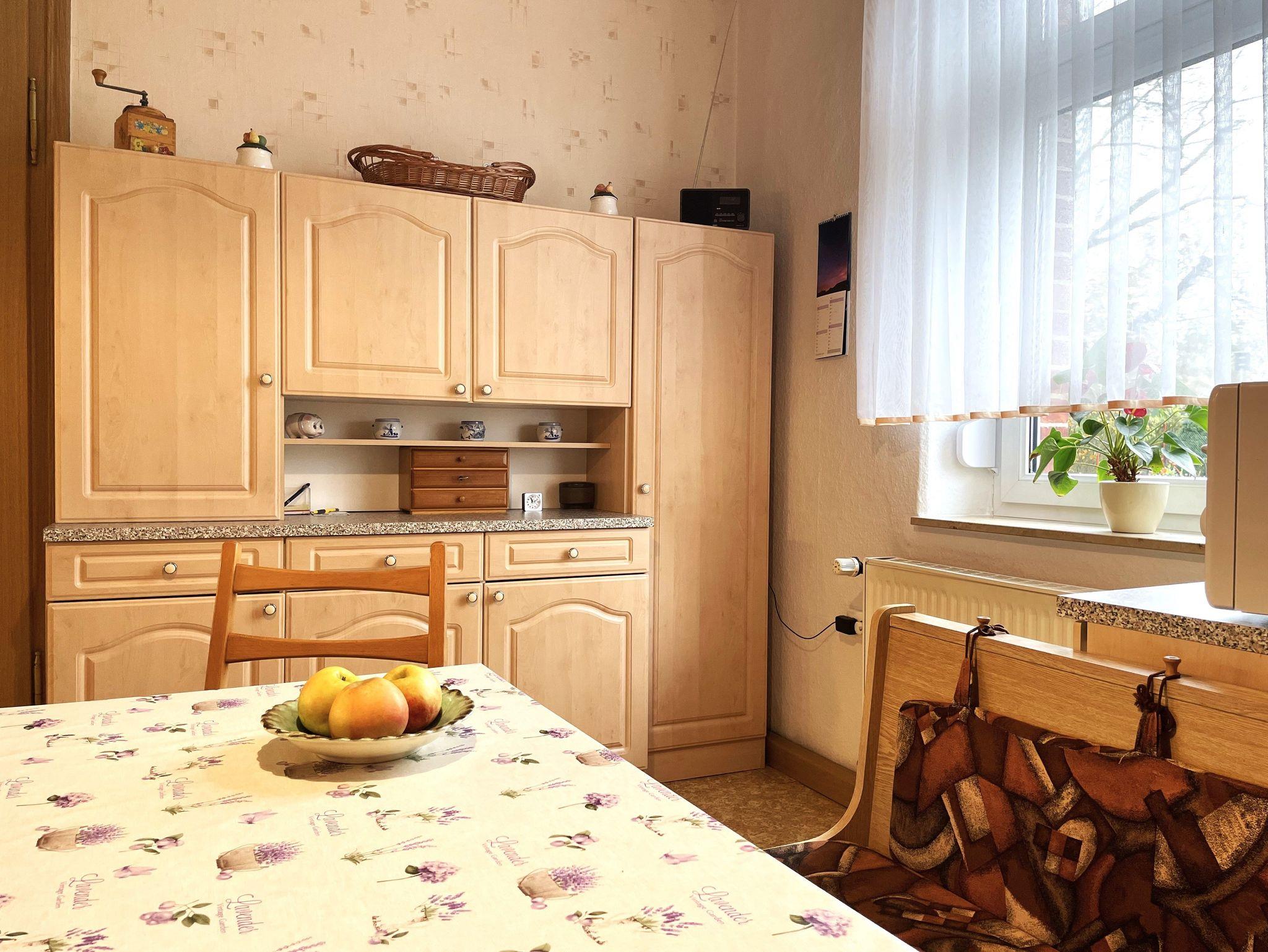 In der großen, gut ausgestatteten Wohnküche finden die Gäste Kühl- und Gefriermöglichkeit, Backofen, Mikrowelle, Kaffeemaschine und weitere Annehmlichkeiten. Die Essecke ist ein Treffpunkt zu jeder Tageszeit.