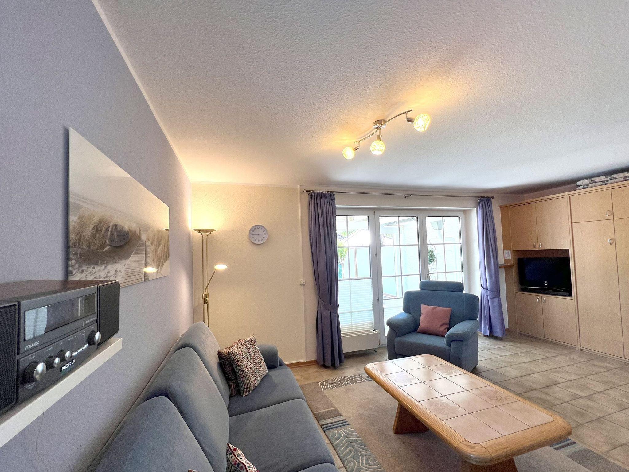 Gemütliche 2-Zimmer-Ferienwohnung mit Terrasse und Strandkorb in St. Peter-Ording, ideal für entspannte Urlaubstage.