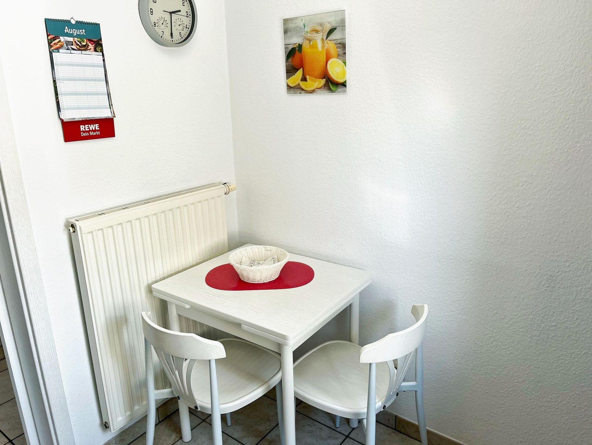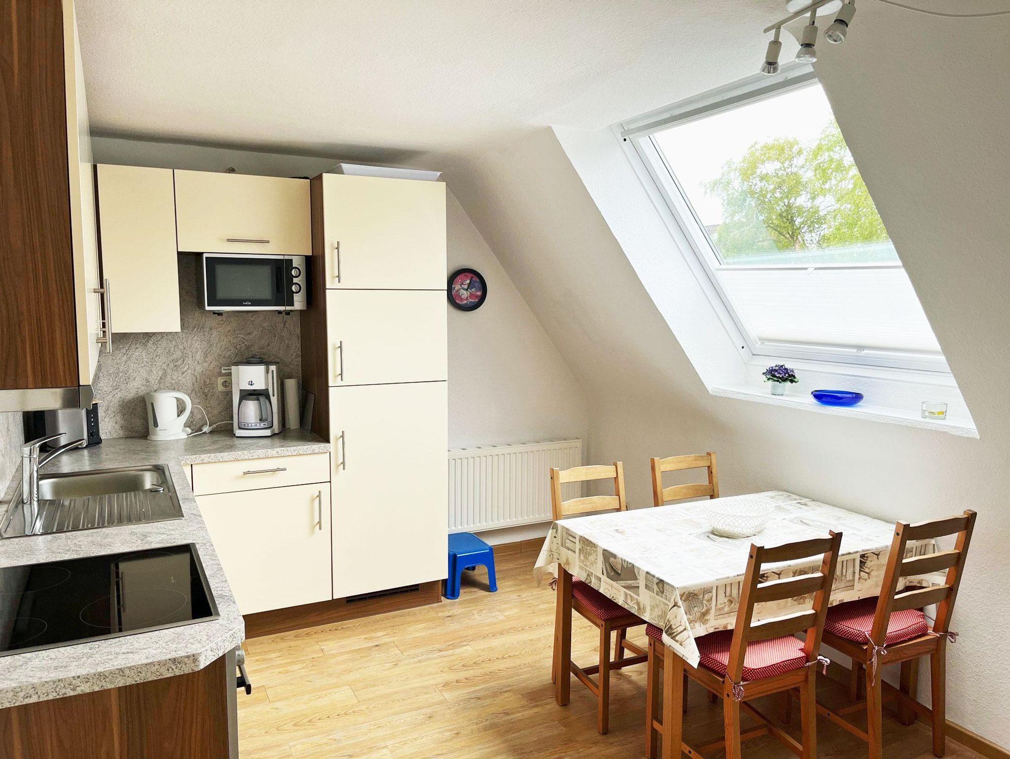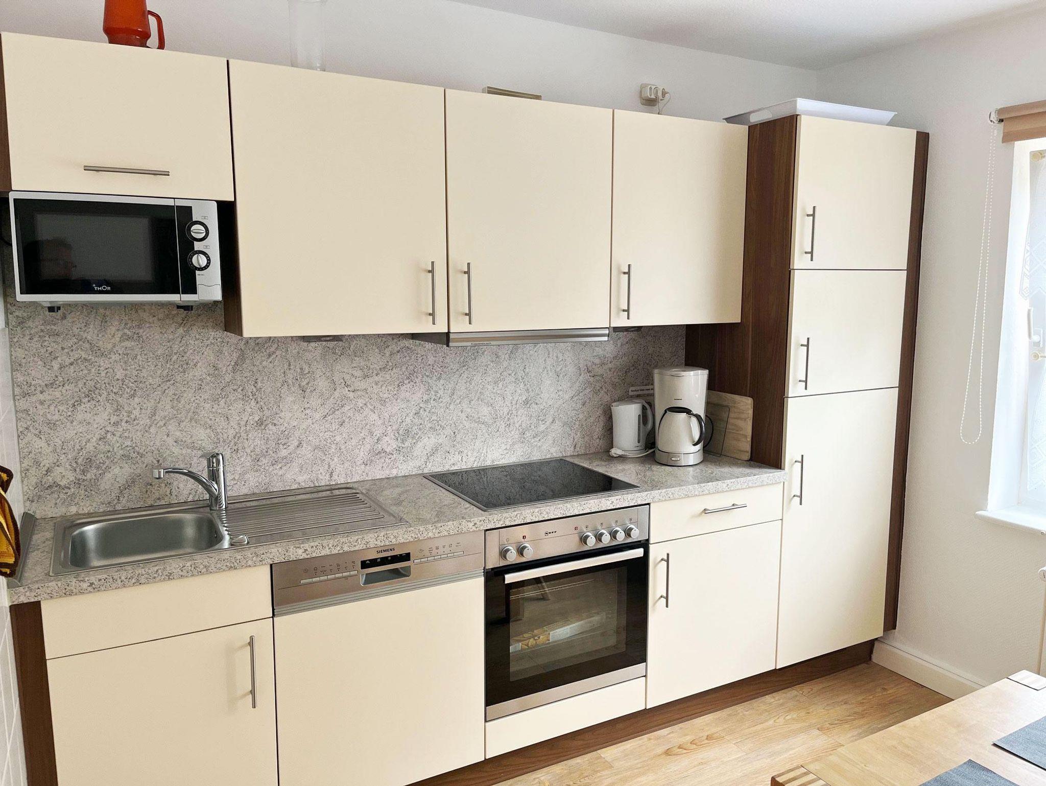 Modern eingerichtete Küche mit Essecke, Geschirrspüler, Mikrowelle, Ceranfeld und Backofen.