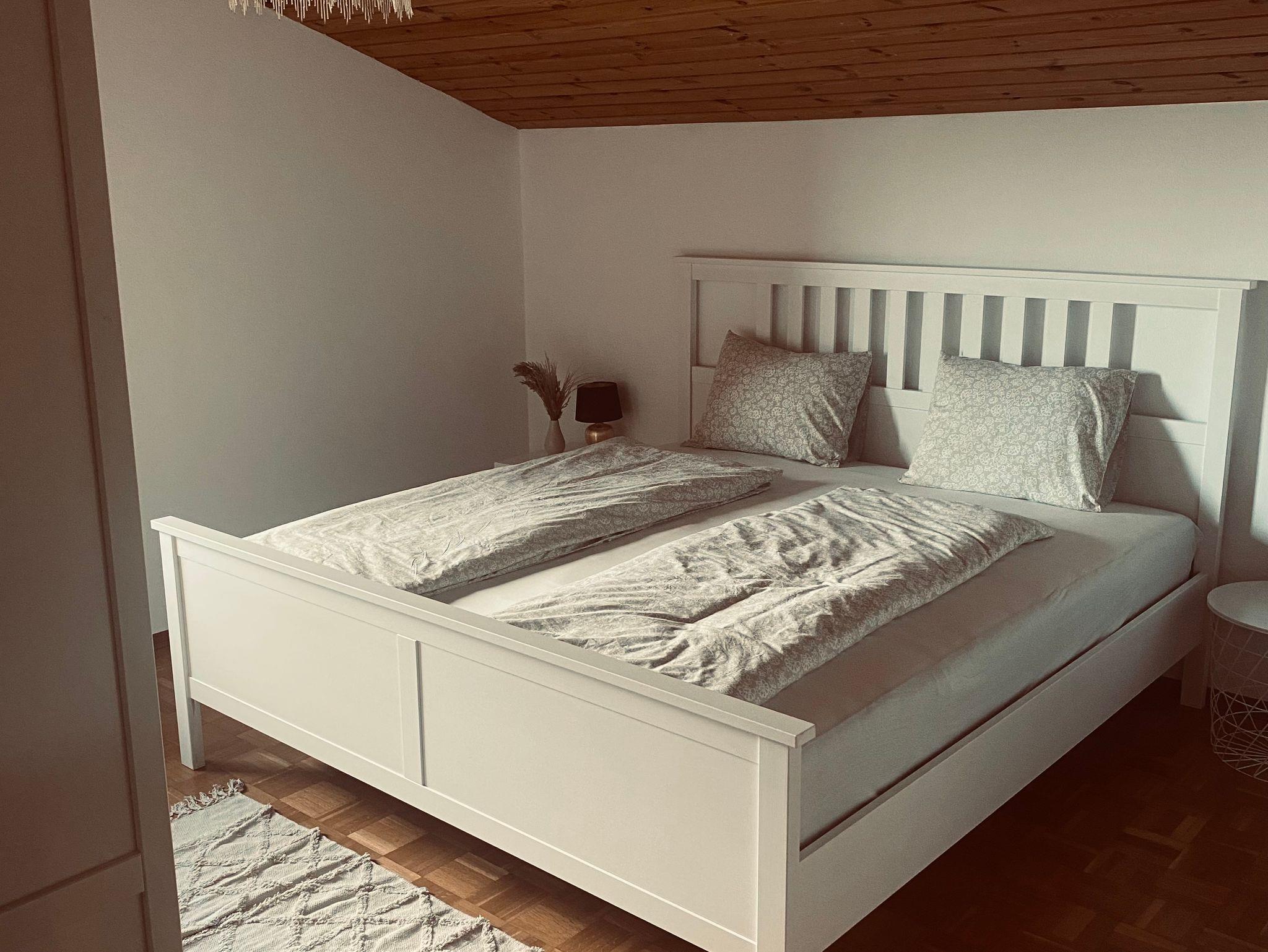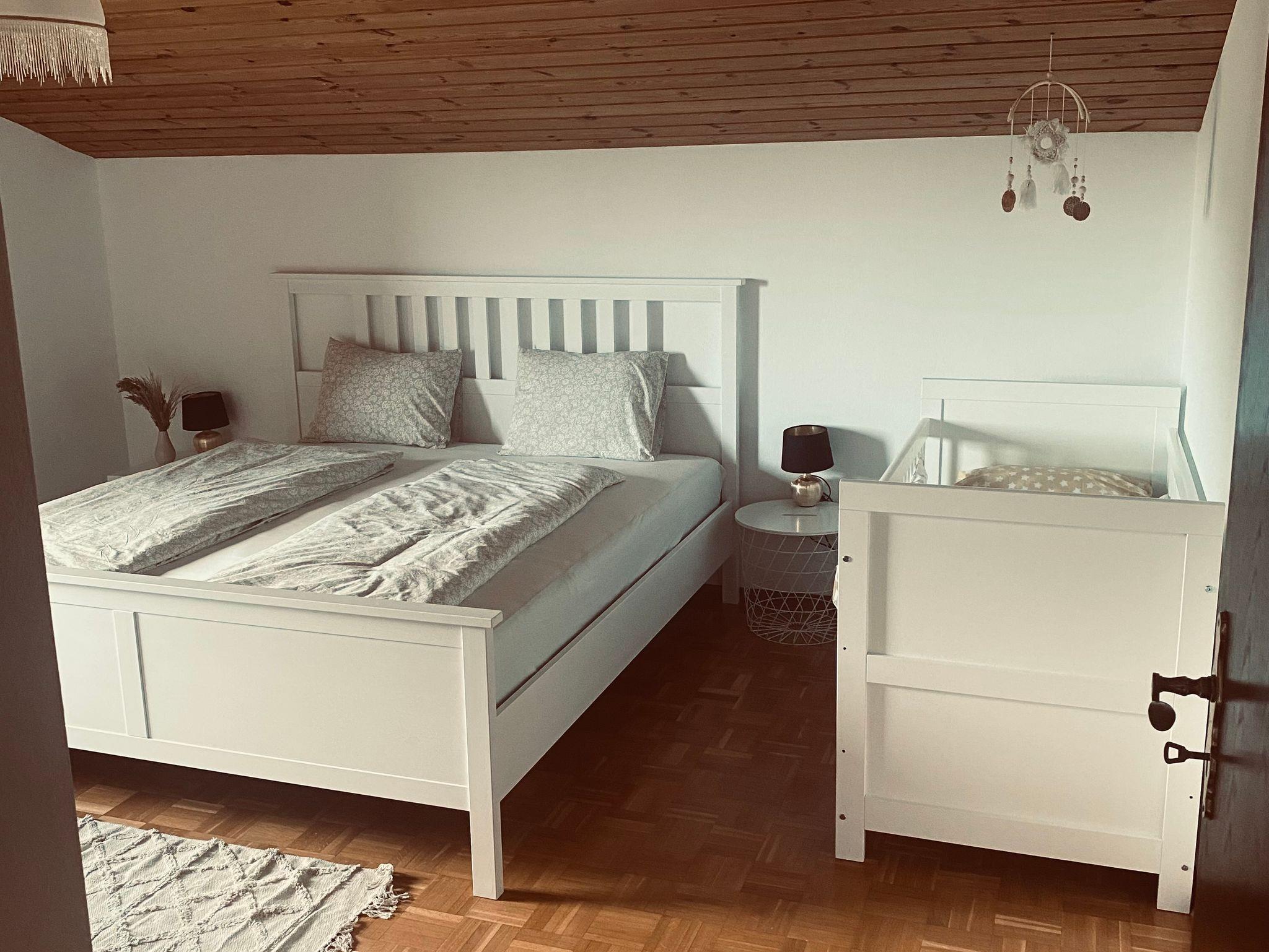 Das Schlafzimmer ist mit einem großen Bett ausgestattet, das über eine Matratze in der Größe 1,80 x 2,00 Meter verfügt. Ein Babybett steht Ihnen kostenfrei zur Verfügung.