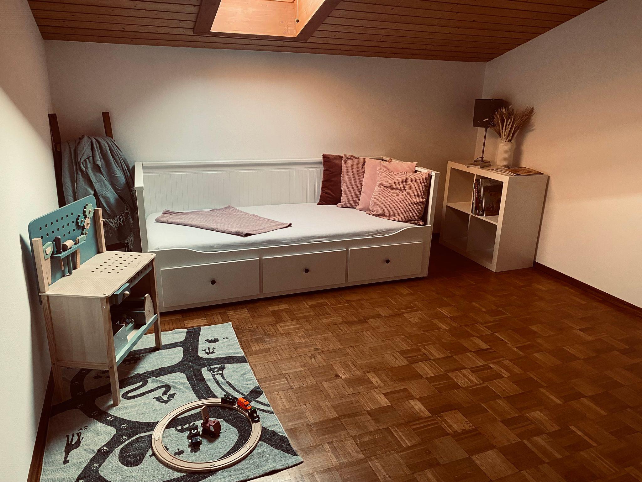 Das liebevoll eingerichtete Kinderzimmer lädt mit vielen Spielsachen zum Spielen und Entdecken ein – darunter eine Kinderküche, eine Werkbank, Puzzles, Spiele und Bücher.