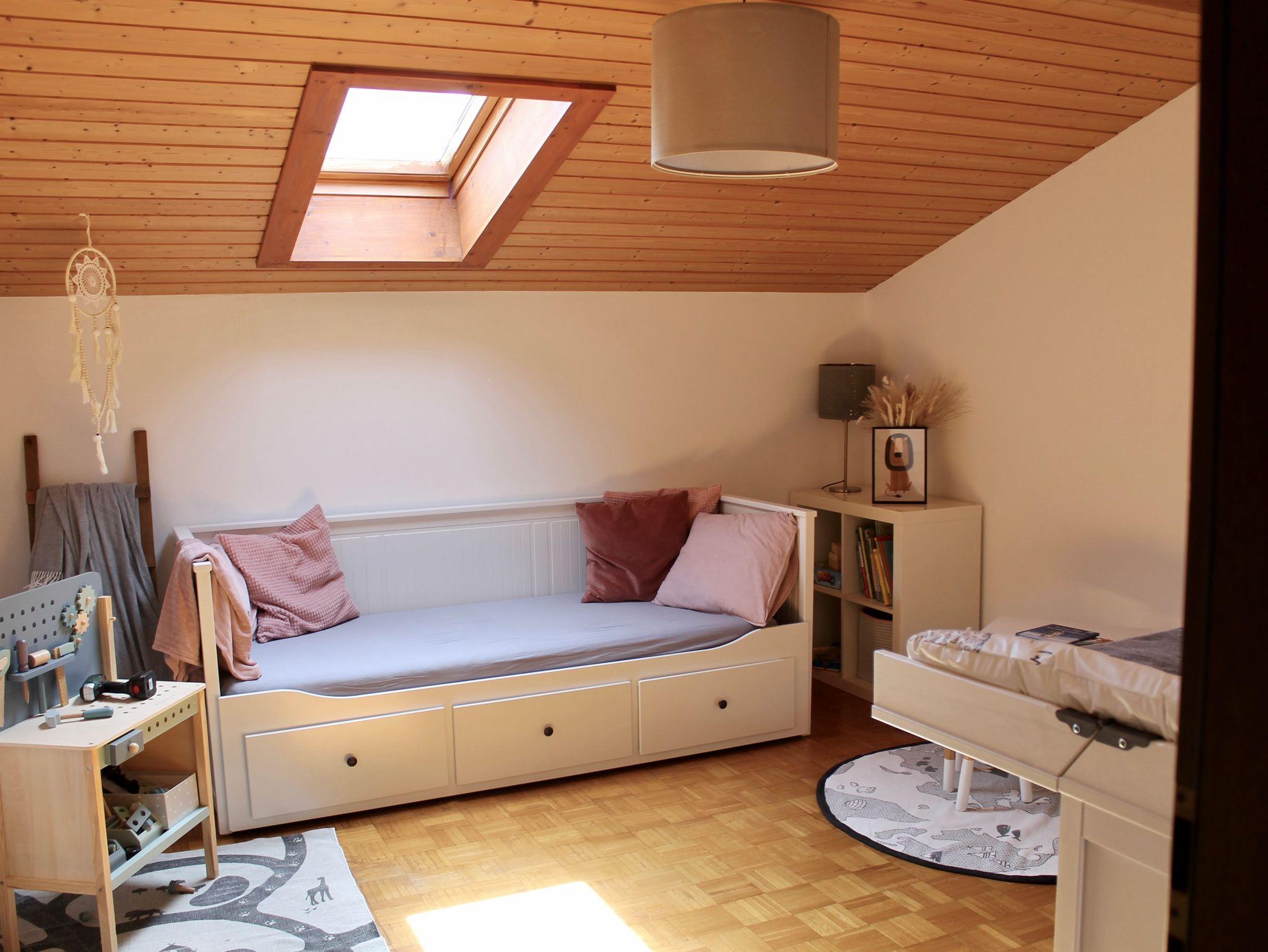 Im Kinderzimmer befindet sich ein Bett mit einer Matratze von 80 x 2,00 Metern, das bei Bedarf auf zwei Matratzen ausgezogen werden kann. Zudem steht eine praktische Wickelkommode bereit.