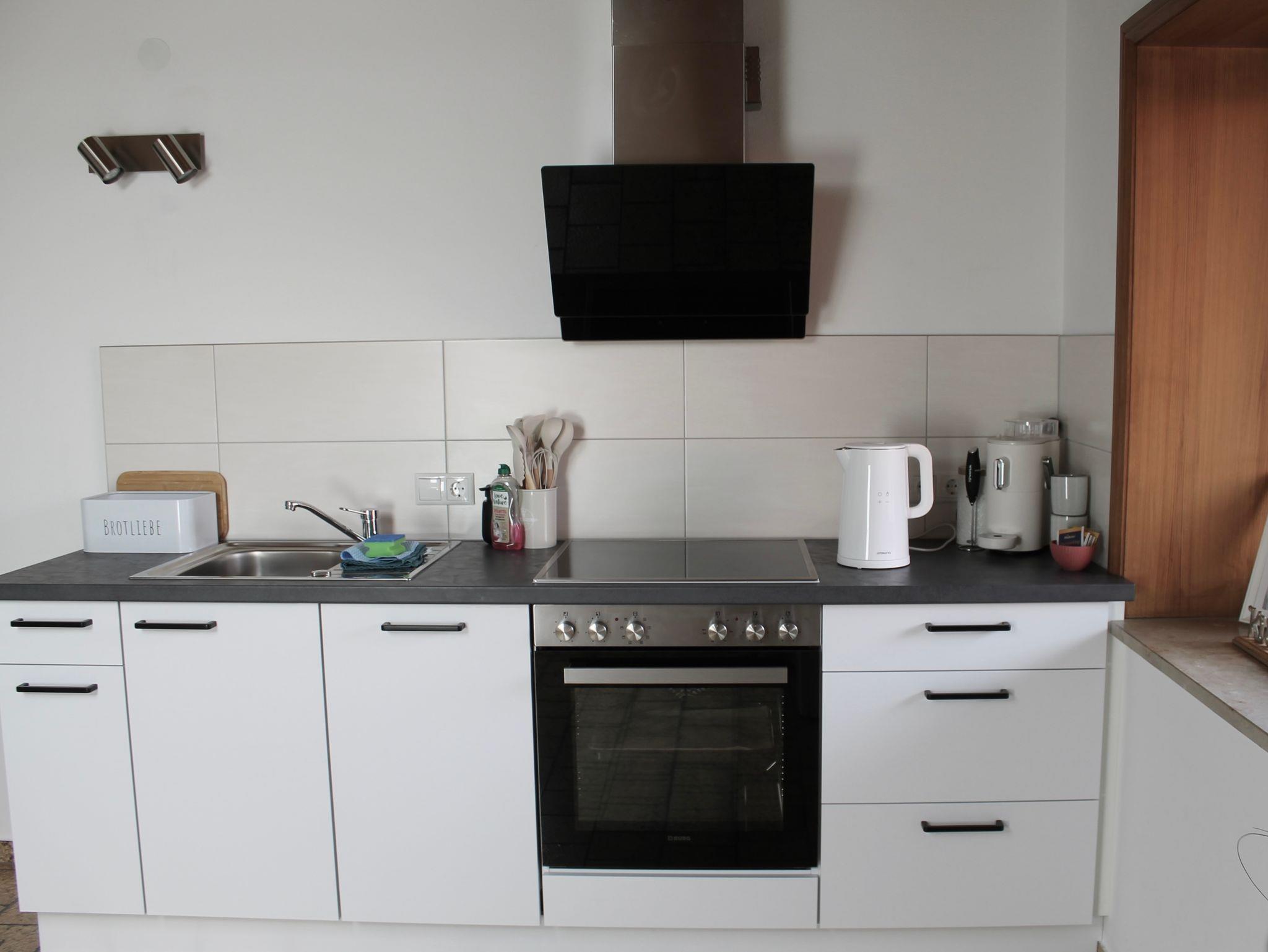 Die Küche ist bestens ausgestattet und bietet Ihnen zahlreiche Utensilien sowie eine Auswahl an Gewürzen. Ein großer Esstisch lädt zum gemeinsamen Essen ein.