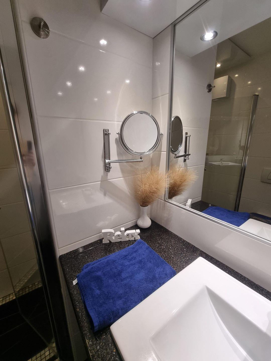 Das Badezimmer ist funktional gestaltet und verfügt über eine bodengleiche Dusche, WC, Waschbecken, Spiegel, Kosmetikspiegel und Haartrockner. Warmes Wasser ist jederzeit verfügbar.