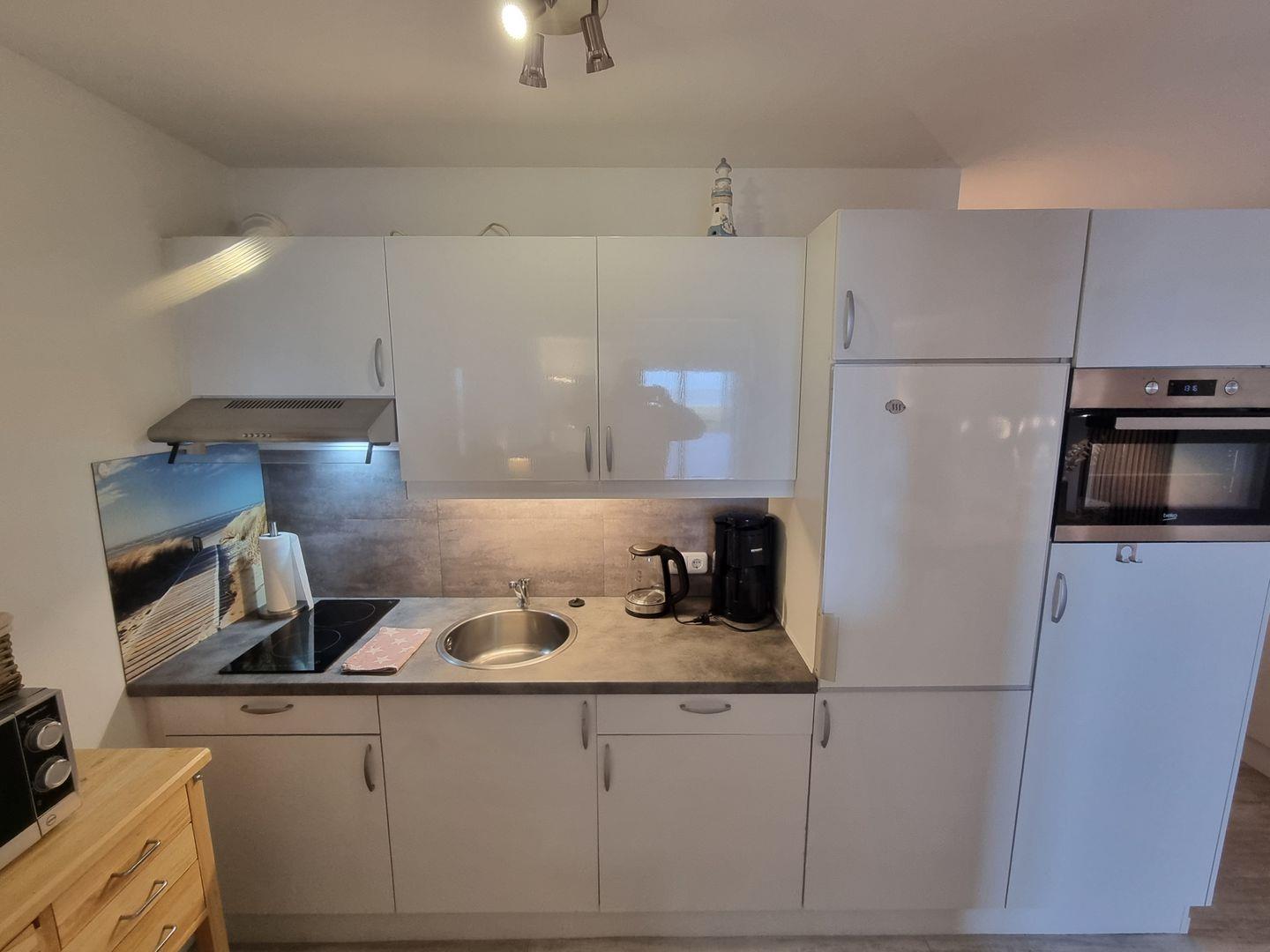 Die offen zum Wohnzimmer angelegte Küche ist mit allen wichtigen Geräten und Utensilien ausgestattet. Dazu zählen ein Ceranherd, Backofen (elektrisch), Mikrowelle, Kühlschrank mit integriertem Gefrierfach, eine klassische Kaffeemaschine, eine Senseo-Espressomaschine, Wasserkocher, Toaster sowie ein Mixer. Geschirr, Besteck und Küchenutensilien sowie Geschirrhandtücher sind in ausreichender Anzahl vorhanden.