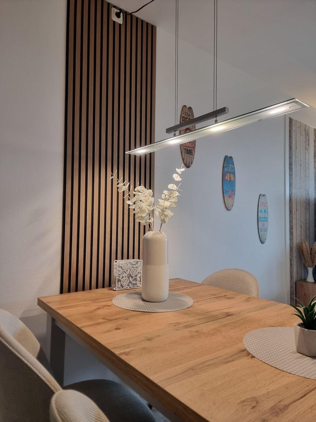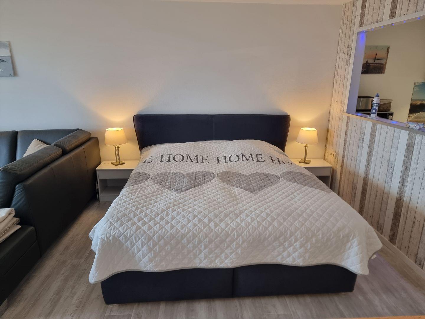 Das Appartement verfügt über ein Schlafzimmer mit Vinylboden, Sichtschutz an allen Fenstern und einem Ganzkörperspiegel. Zudem sorgt der im gesamten Wohnbereich verlegte Vinylboden für eine angenehme und allergikerfreundliche Atmosphäre. Das Wohnzimmer ist offen gestaltet, es verbindet die Sofaecke mit einem Essbereich und der angrenzenden Küche. Hier haben Sie ausreichend Platz, um sich zu entspannen oder gemeinsam zu speisen.