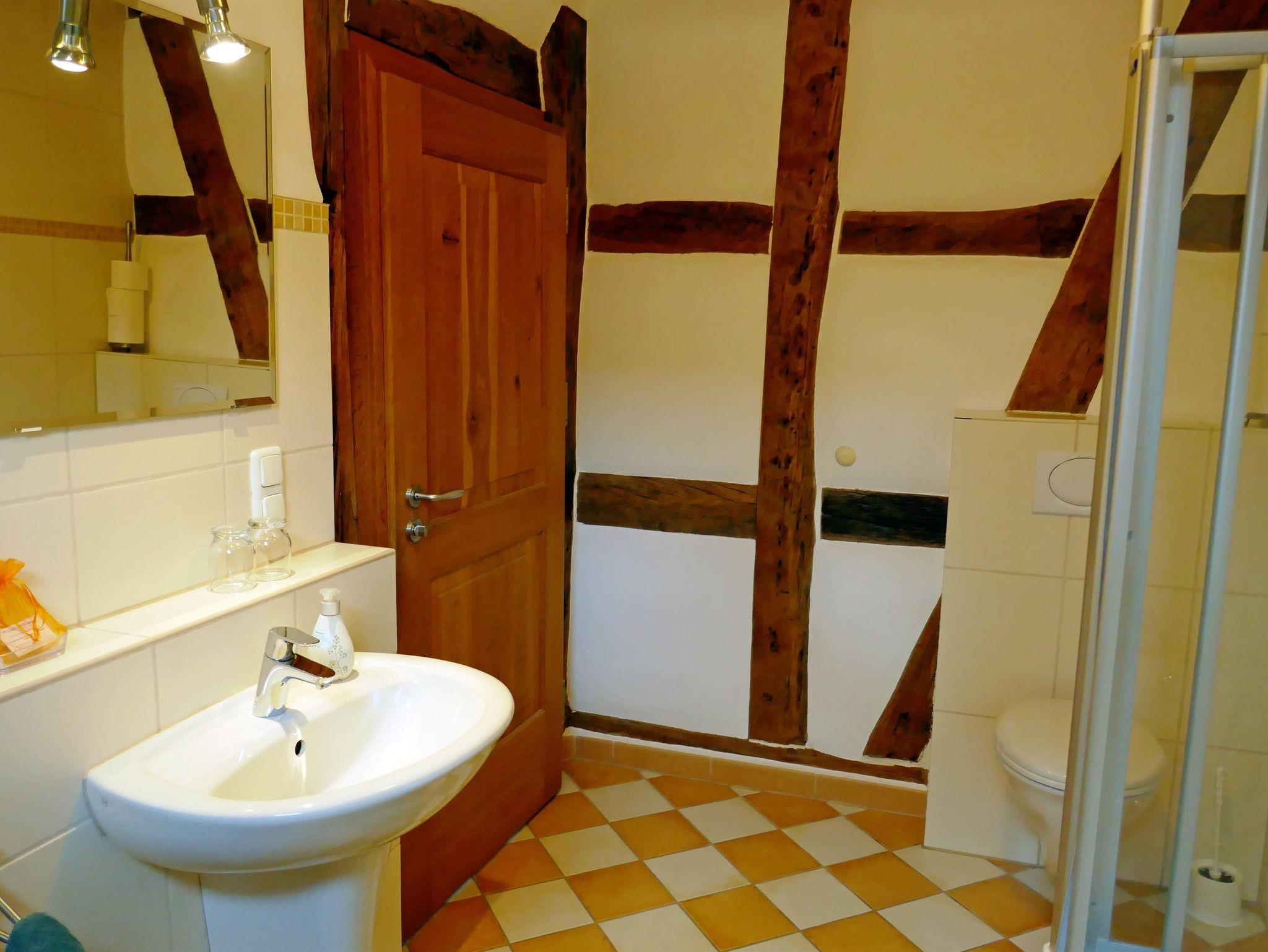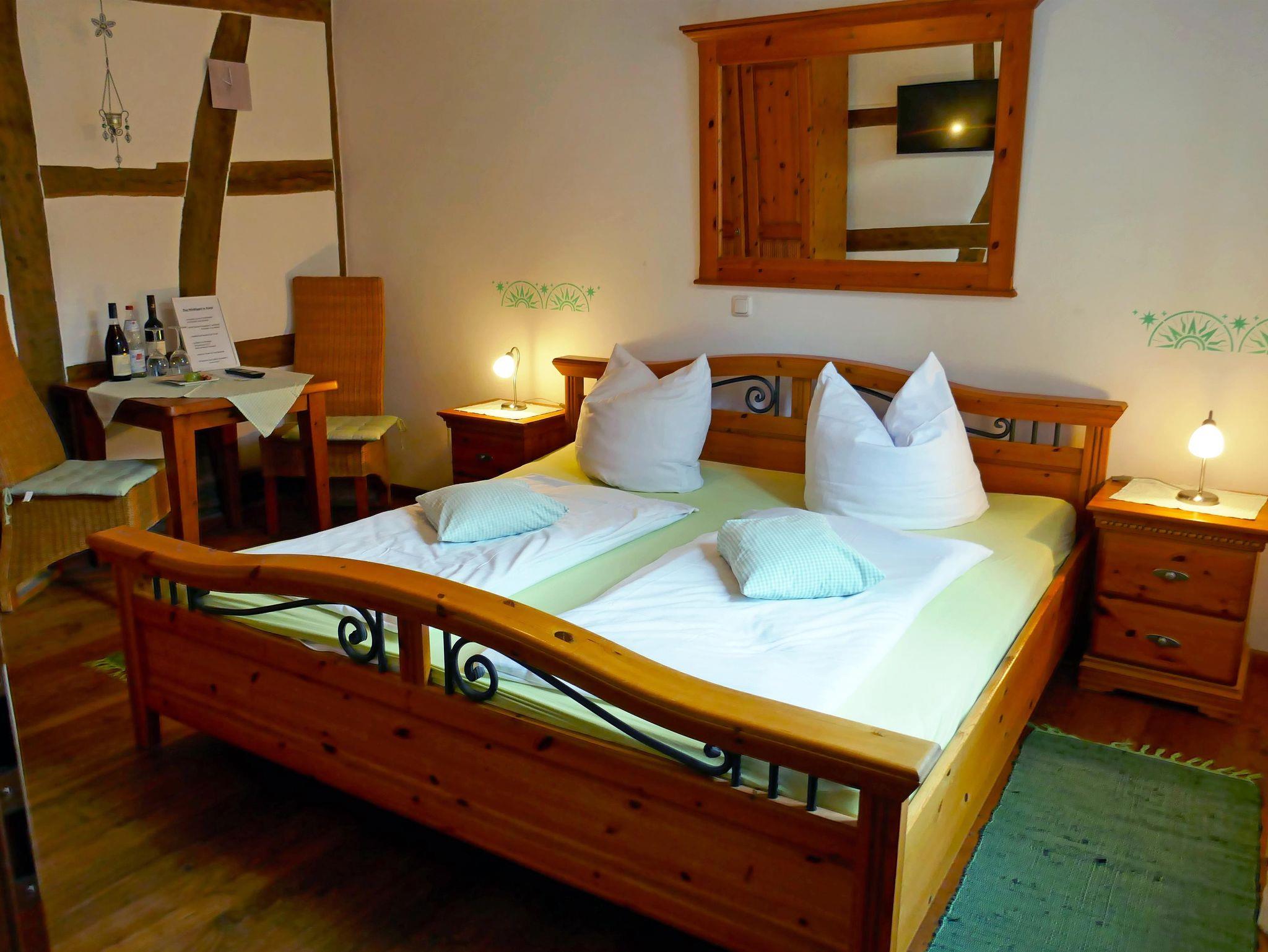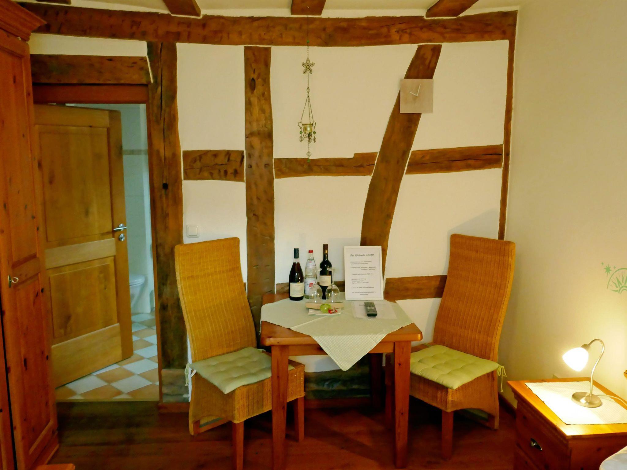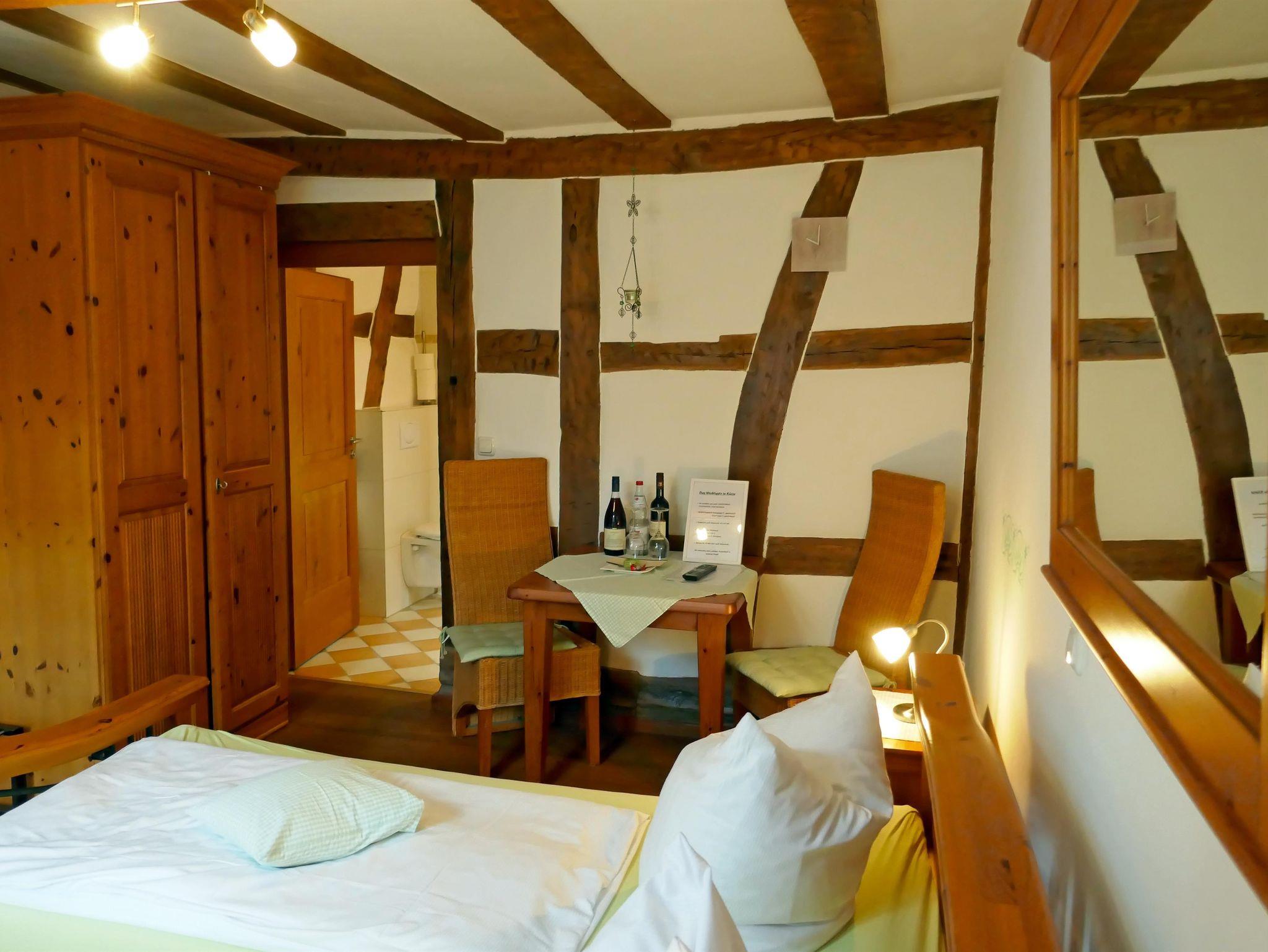Das ca. 20 m² große Doppelzimmer befindet sich im komplett neu renovierten Fachwerkhaus und ist ausgestattet mit Badewanne/WC, TV und Fön. Es wird ein Kühlschrank-Service angeboten. Ebenso steht eine Teeküche und ein Freisitz im Hof zur Benutzung zur Verfügung. Mindestaufenthalt: 2 Nächte. Weingenießer und Fahrradfreunde dürfen gerne auch für eine Nacht anfragen.