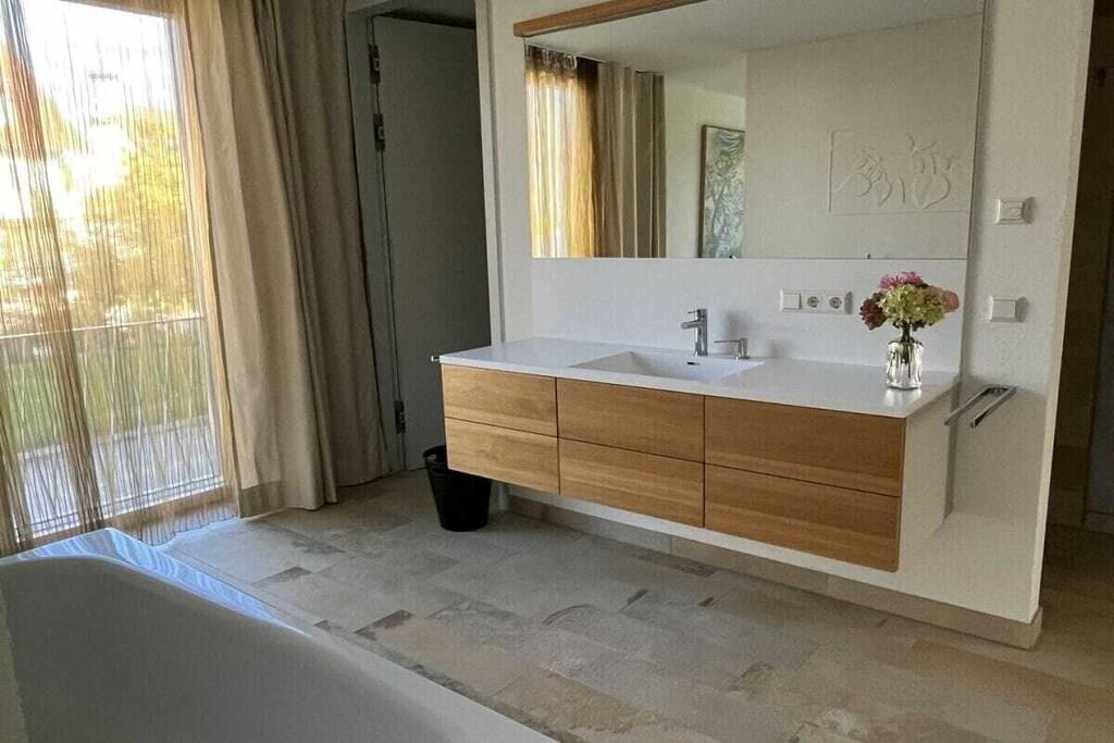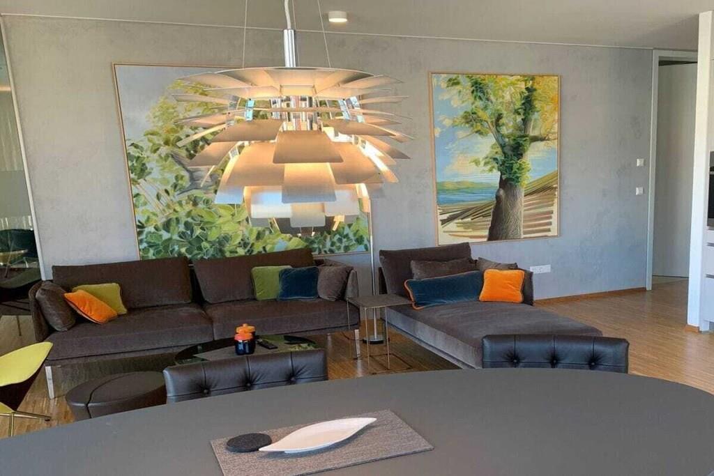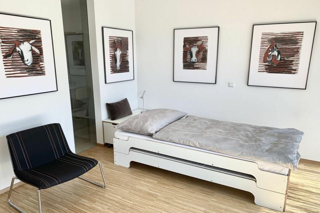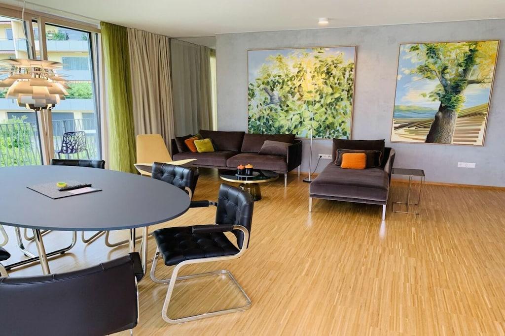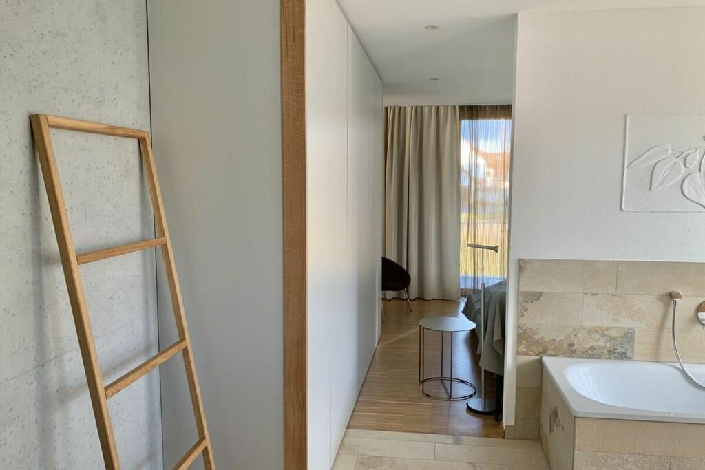 Die großzügigen Räumlichkeiten mit raumhohen Fenstern und Türen, die ausgesuchte Form- und Farbgebung sowie die ungewöhnliche Raumaufteilung sorgen für ein herausragendes Wohngefühl. Der umlaufende Balkon lädt zu allen Tageszeiten zum Leben im Freien ein. Die Küche ist mit Porzellan der Iitalla Kollektion Teema ausgestattet, eine echter Klassiker des skandinavischen Designs. Ergänzt wird das Porzellan mit Produkten von Sola aus der Schweiz. Pfannen und Töpfe sind in ausreichender Anzahl vorhanden. Das I-Tüpfelchen setzen die Schwamm- und Geschirrtücher aus Schweden, welche das Design von triLogie am See tragen. Design Ulrike Schüler. Weitere Ausstattung: Nespresso Kaffeemaschine, Milchschäumer und Wasserkocher. An den Masterbedroom angeschlossen, verfügt das Apartment Maulbeere über ein großes, barrierefreies Bad mit Wanne, Dusche und Toilette. Darüber hinaus mit einem zusätzlichen Badezimmer mit Dusche und WC. Die großformatigen Originalkunstwerke der Münchner Künstlerin Ulrike Schüler mit dem Motiv Maulbeere nehmen Bezug auf die Maulbeerallee der Insel Mainau. Historisch wurden Maulbeeralleen auf herrschaftlichen Anwesen wie der Insel Mainau gepflanzt, um Seide zu produzieren. Die Blätter des Maulbeerbaumes dienten der Seidenraupe als Nahrung. Die Seide wurde zu edlen Gewändern verarbeitet, die zu besonderen Anlässen getragen wurden.