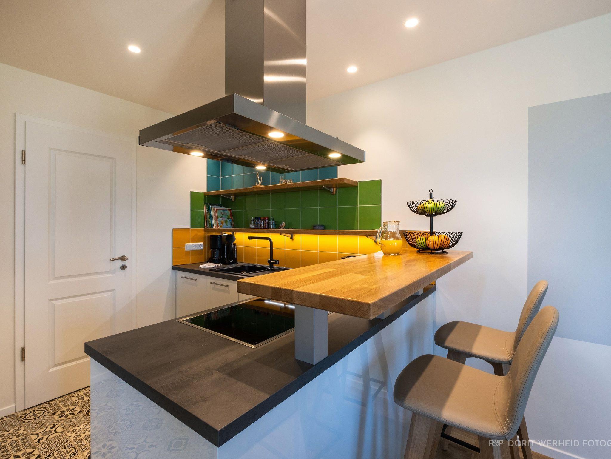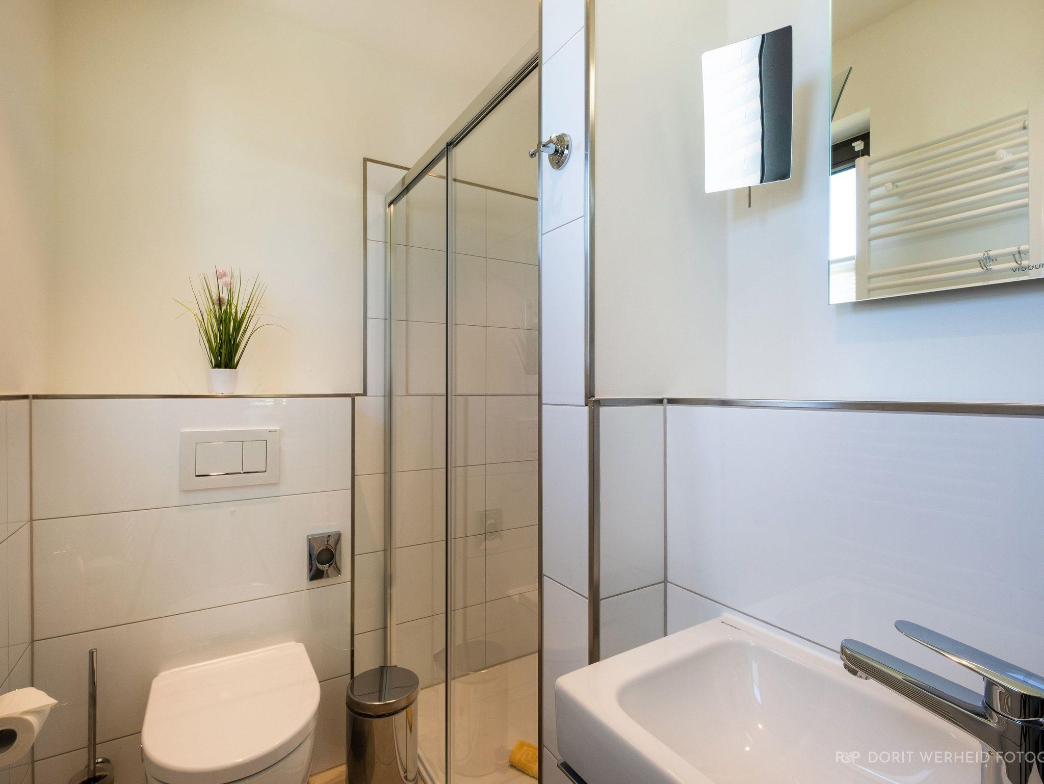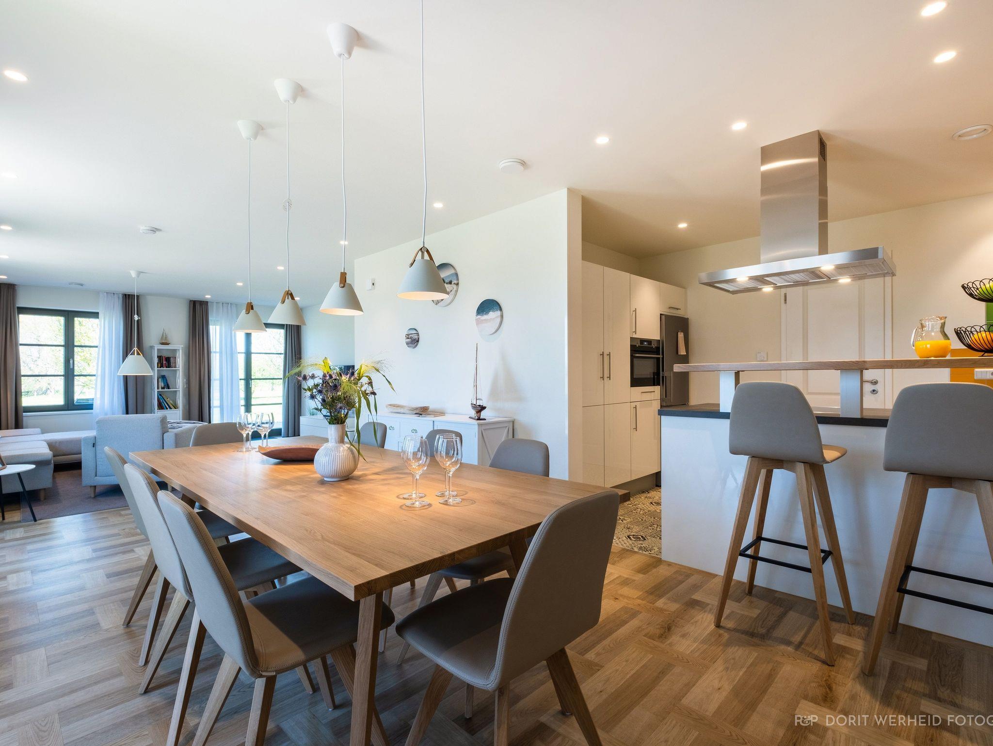 Der geräumige Wohn-Essbereich im Erdgeschoss bietet ausreichend Platz für gemeinsame Essen und gesellige Fernseh- oder Spielabende. Ihnen stehen Gesellschaftsspiele, DVDs und eine kleine Auswahl an Büchern zur Verfügung. Die Wohnküche mit Vollausstattung verfügt über alle Standardgeräte, wie Spülmaschine, Mikrowelle, Backofen, Induktionsherd, Kaffeemaschine, Wasserkocher und Toaster. Von diesem Bereich gelangen Sie direkt auf die beiden Terrassen mit herrlichem Blick ins Grüne. Für gemütliche Grillfeste auf der Terrasse steht ein elektrischer Kontaktgrill bereit. Im Garten steht Ihnen außerdem die Fasssauna (gegen Gebühr) zur Verfügung. Ebenfalls befindet sich ein Schlafzimmer mit einem Boxspringbett, TV und ein Badezimmer mit Waschbecken, WC und bodentiefer Dusche zur Verfügung.