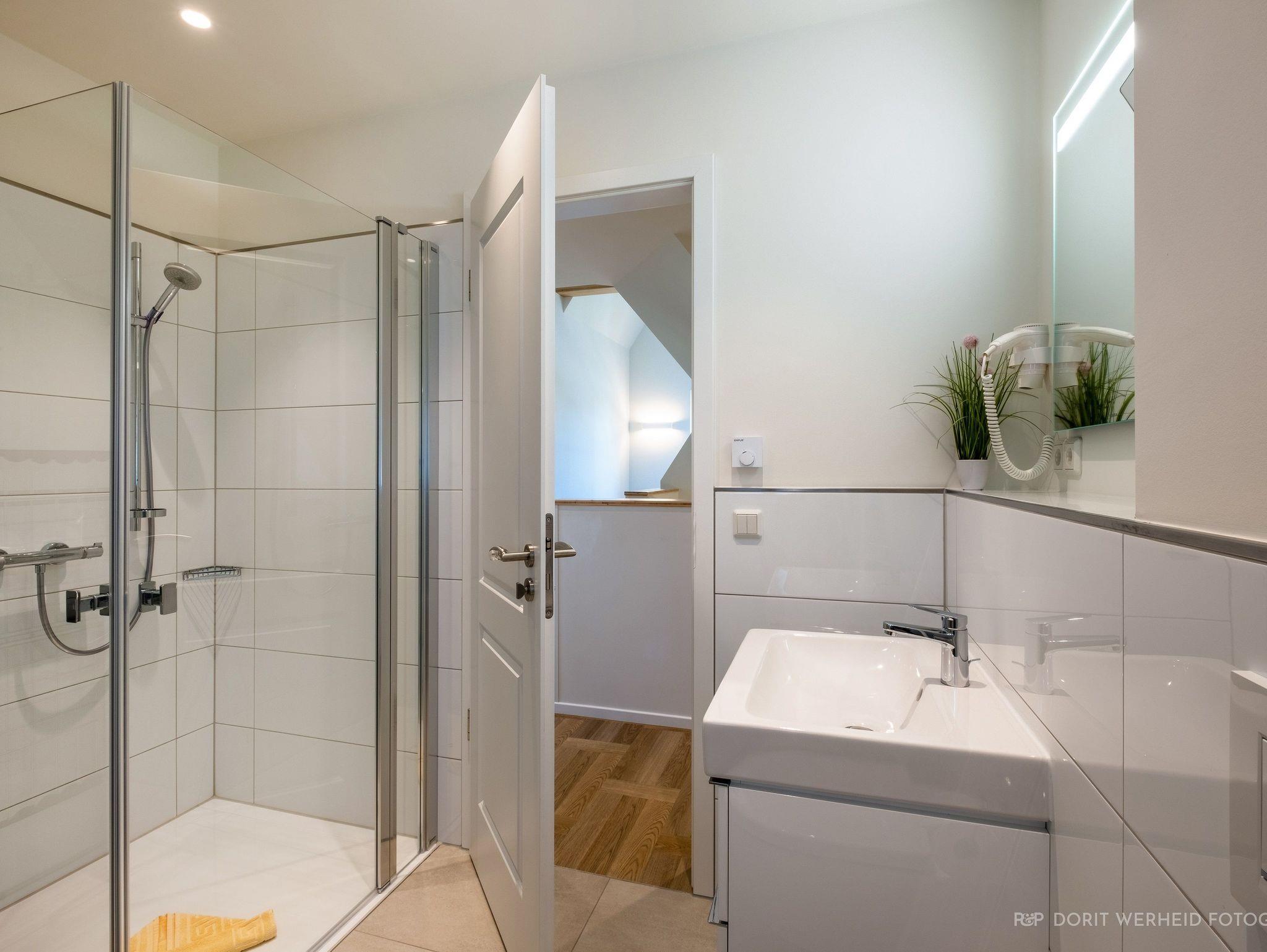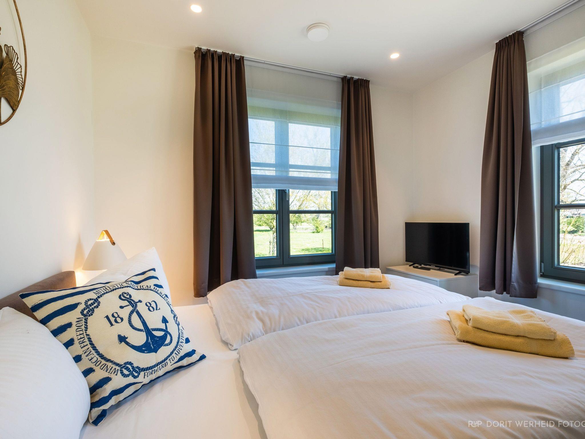 Im Obergeschoss befinden sich drei weitere Schlafzimmer mit TV sowie zwei Bäder. Zwei der Schlafzimmer verfügen über ein großes Doppelbett, das dritte Zimmer über zwei Einzelbetten (alles Boxspring). Das Elternschlafzimmer verfügt über ein en Suite-Badezimmer mit Waschbecken, WC und Badewanne. Das andere Badezimmer verfügt über Waschbecken, WC, bodentiefe Dusche und einer Waschmaschine.